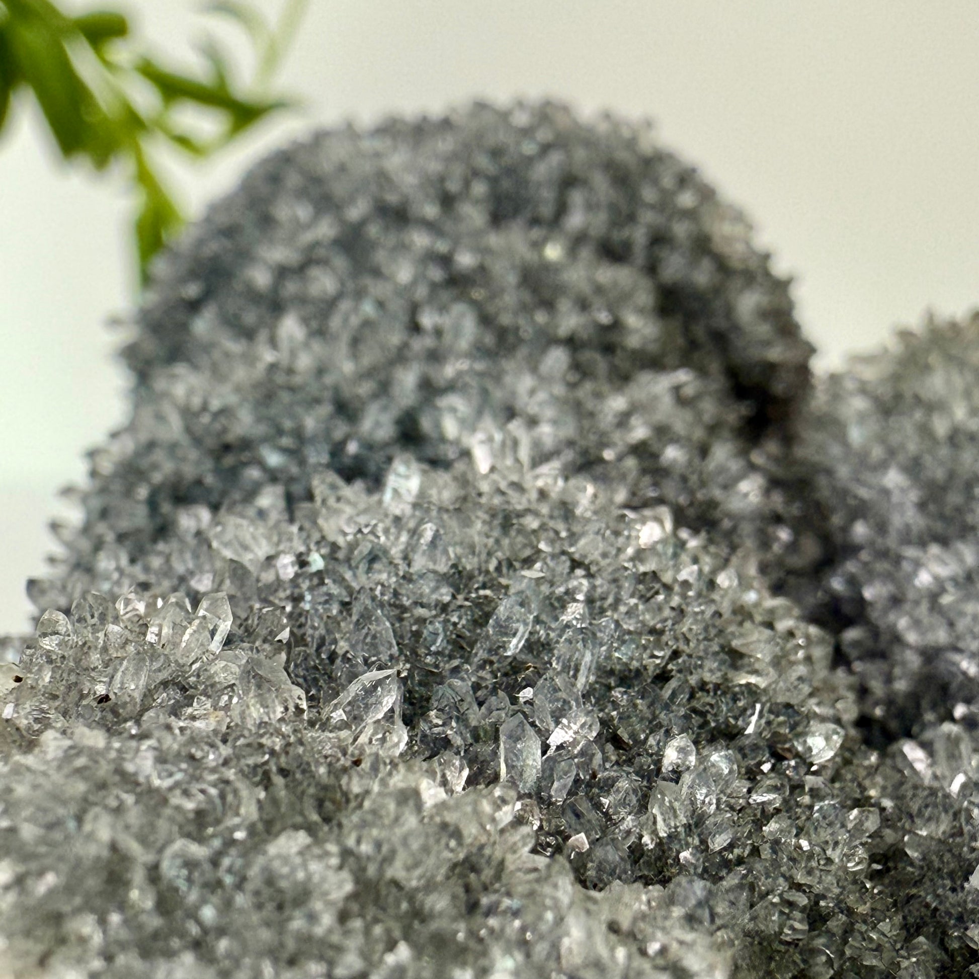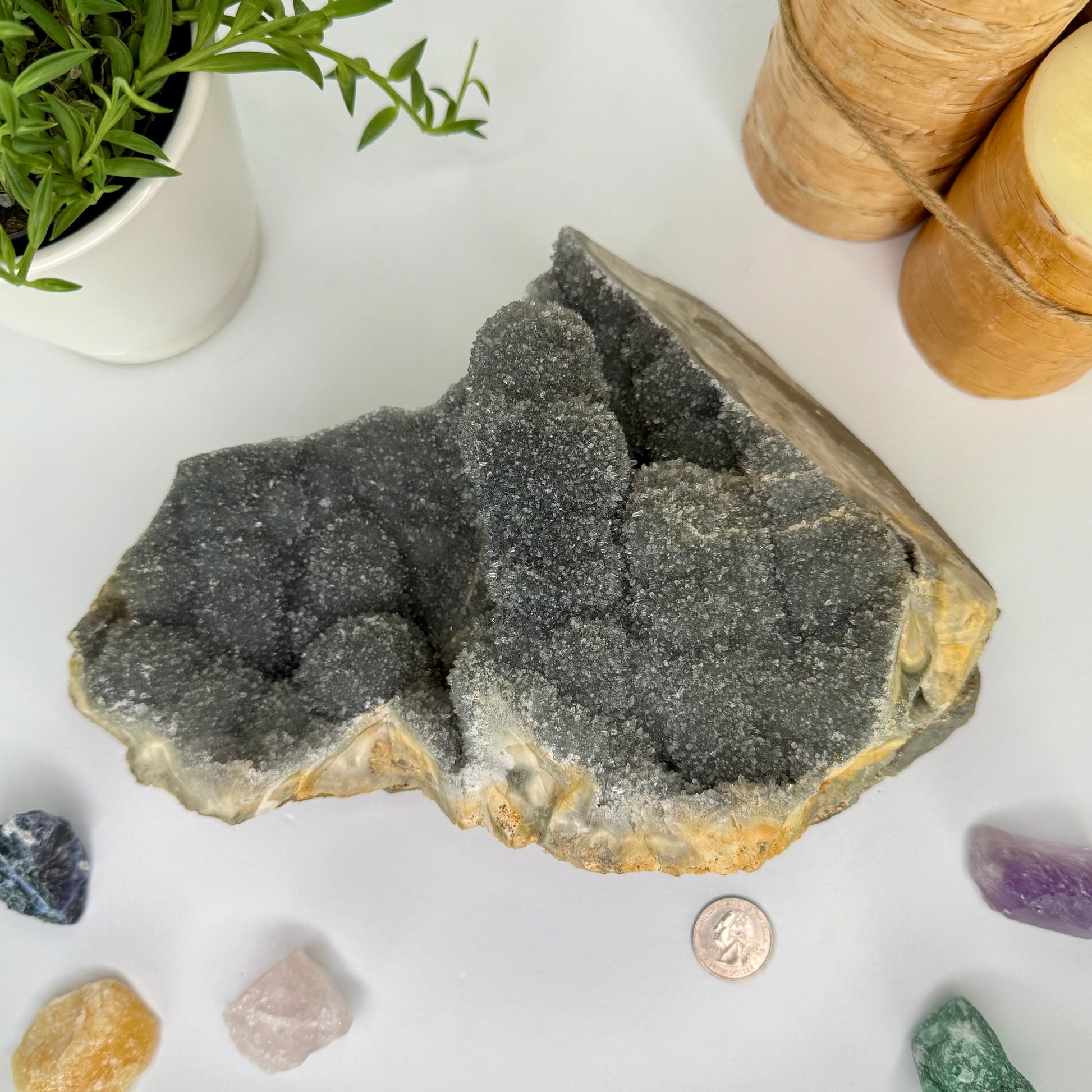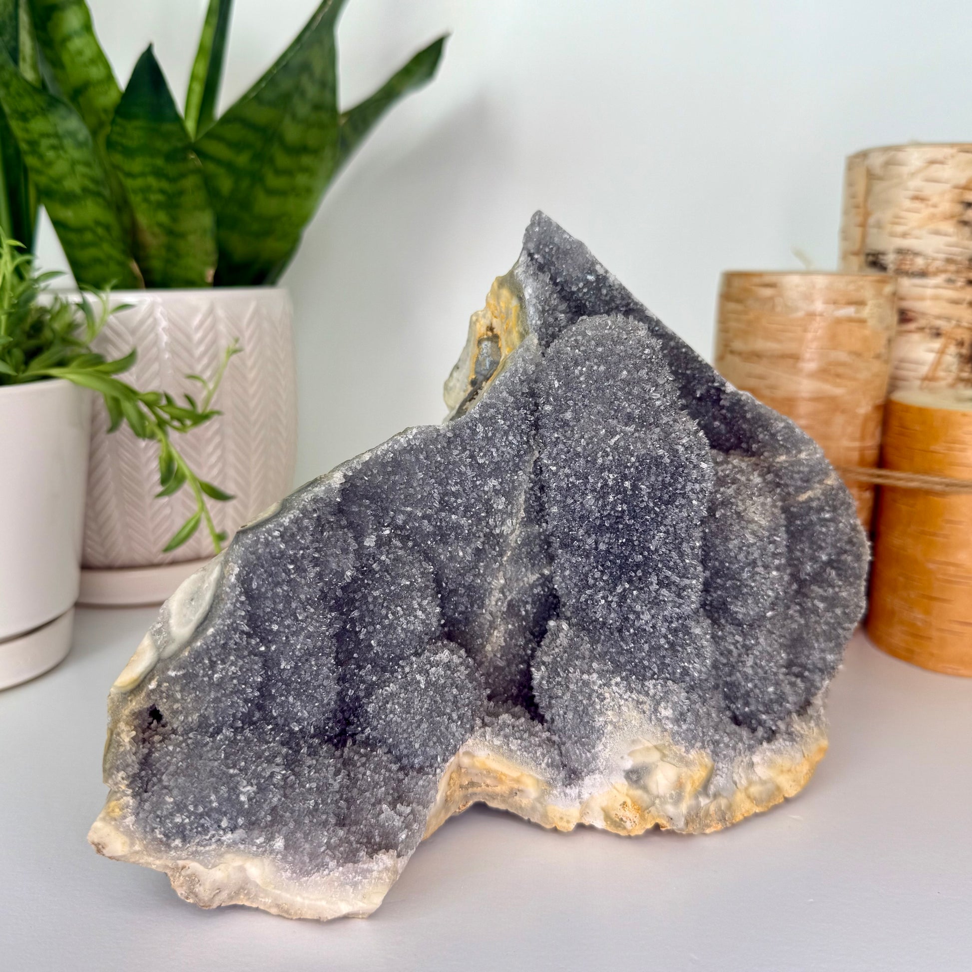 Black Amethyst is a rarer, deeper-hued variety of amethyst formed with inclusions of hematite that give it its smoky, near-black tone // Found primarily in Brazil, it develops in geode cavities and alongside quartz, calcite, and other iron-rich minerals // Its druzy surface and dark crystal points make it both protective and spiritually resonant.