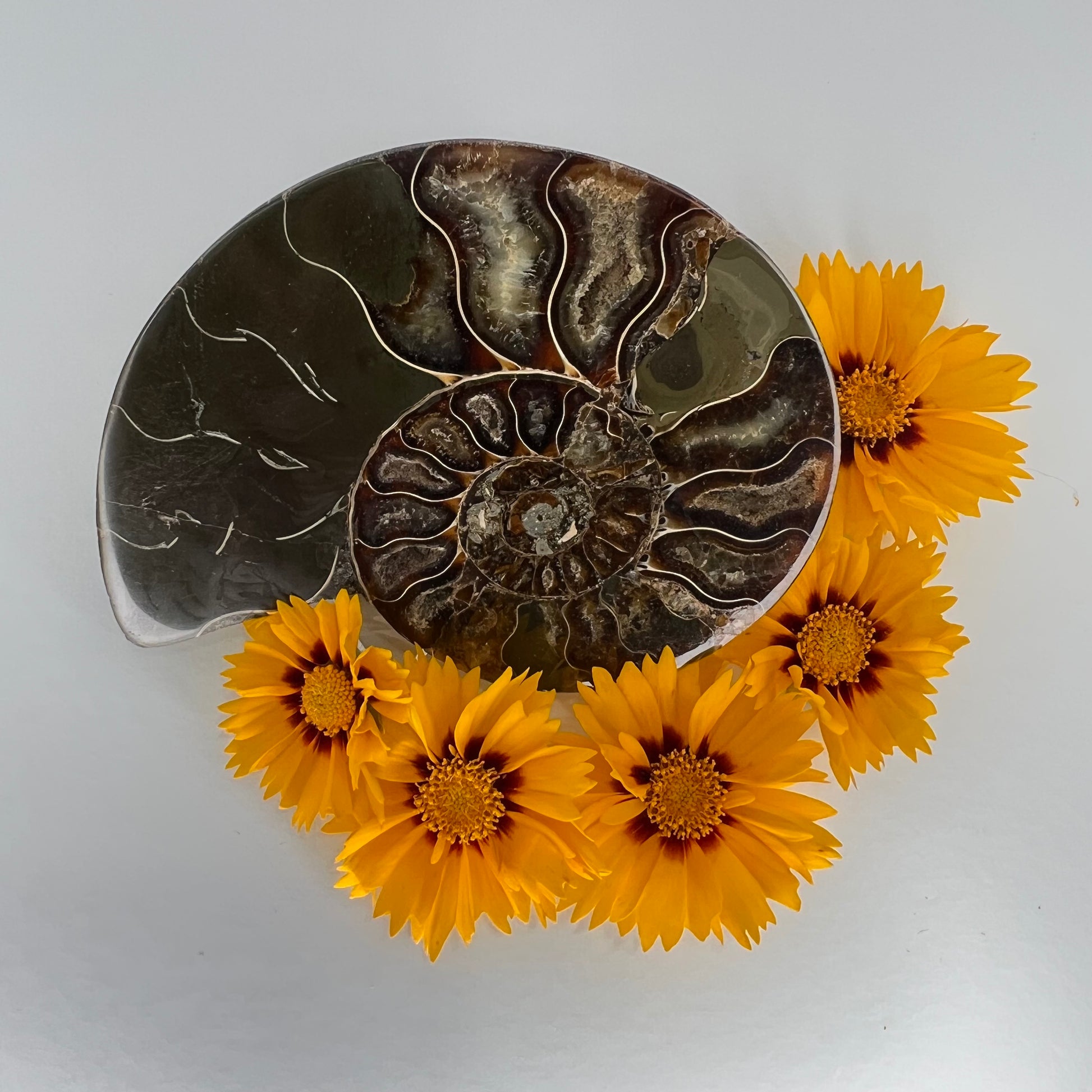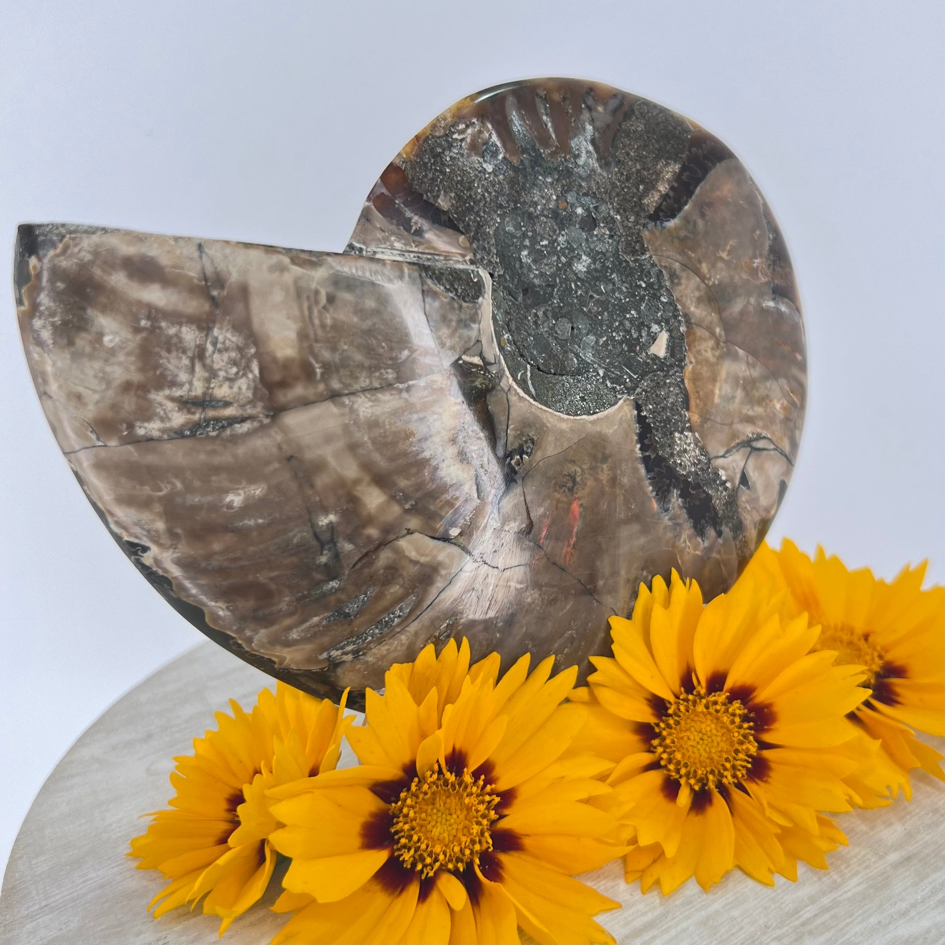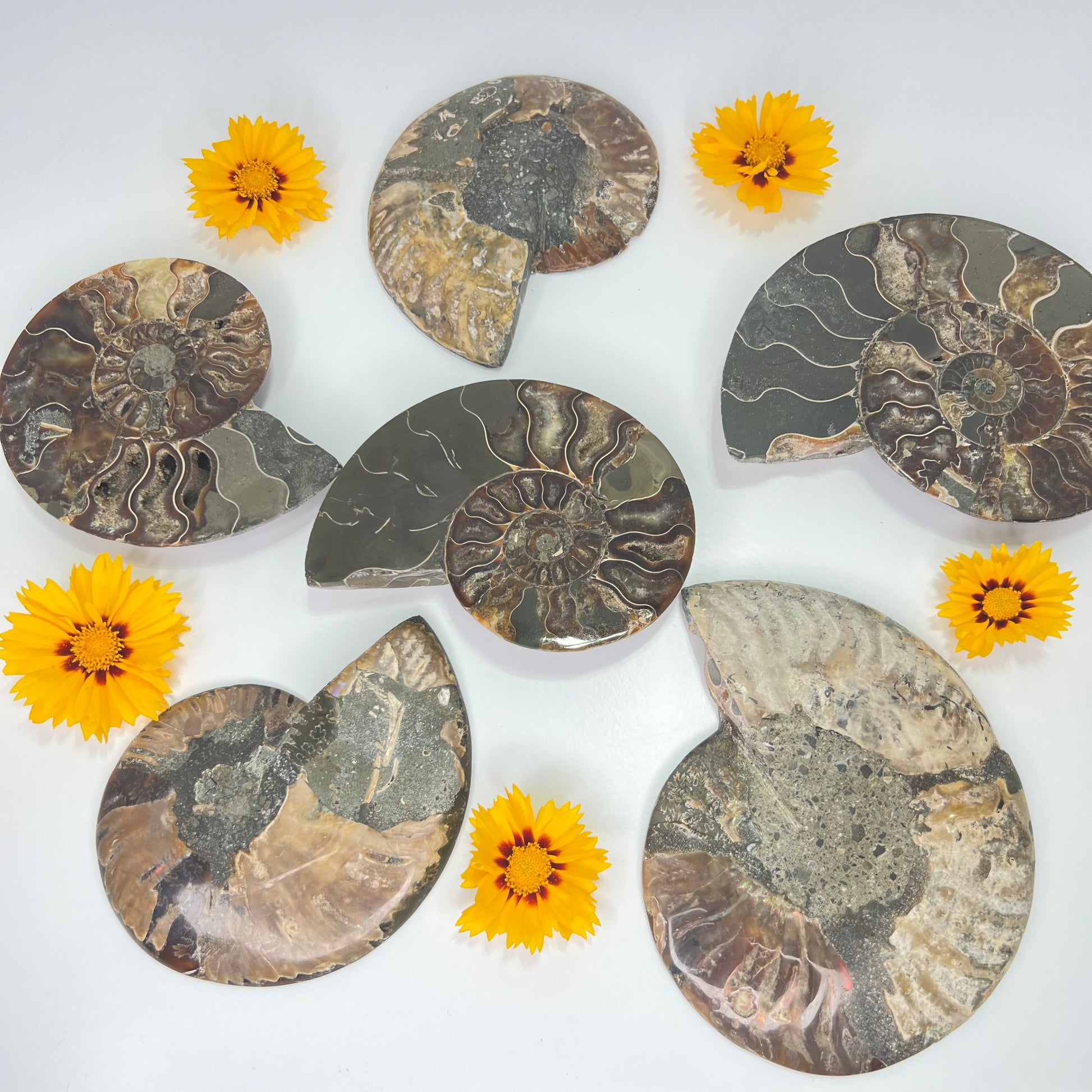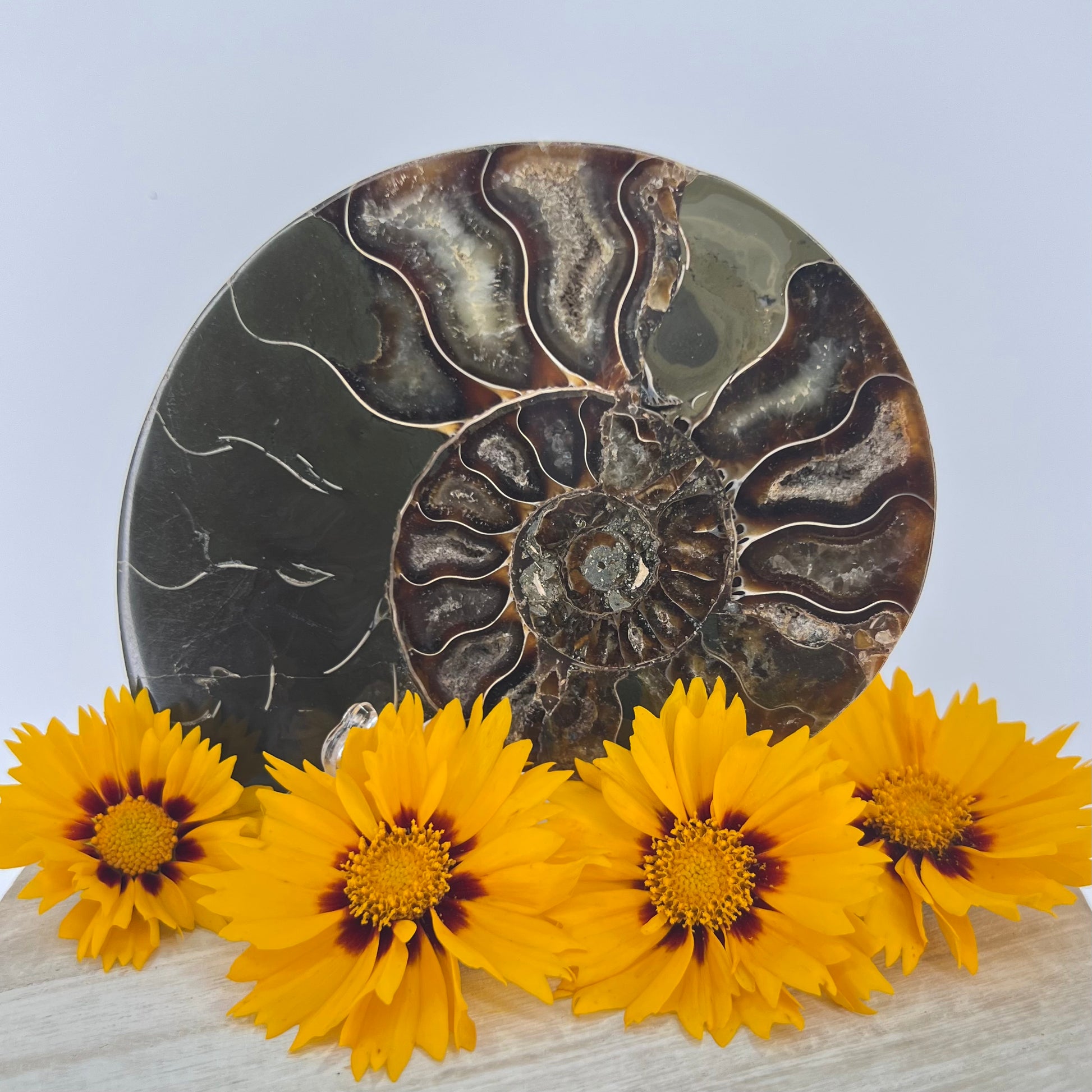 Fossils contain the energy of an ancient organism & the crystal energy they have formed over time // Ammonite shells include sacred geometry, where the spiral follows the Golden Ratio. This unwinding of the spiral indicates things happen in divine time // Can help one understand how life unfolds & how everything happens in divine time. This can bring tremendous patience & understanding of larger forces at work // Ammonites can help with trust, belief & manifestation.