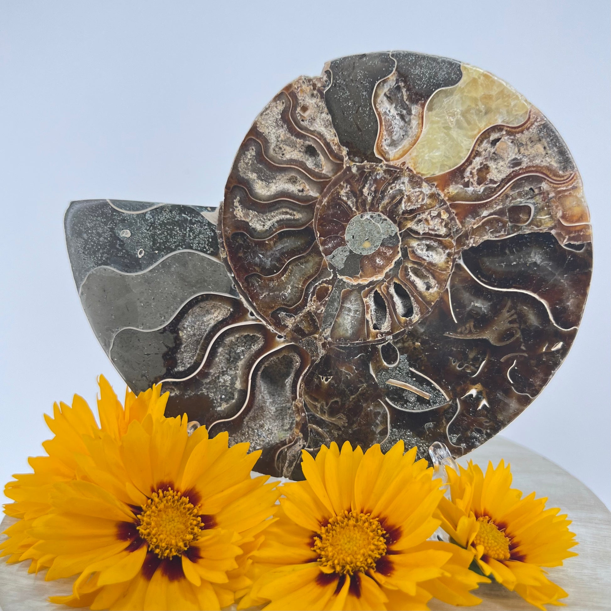 Fossils contain the energy of an ancient organism & the crystal energy they have formed over time // Ammonite shells include sacred geometry, where the spiral follows the Golden Ratio. This unwinding of the spiral indicates things happen in divine time // Can help one understand how life unfolds & how everything happens in divine time. This can bring tremendous patience & understanding of larger forces at work // Ammonites can help with trust, belief & manifestation..