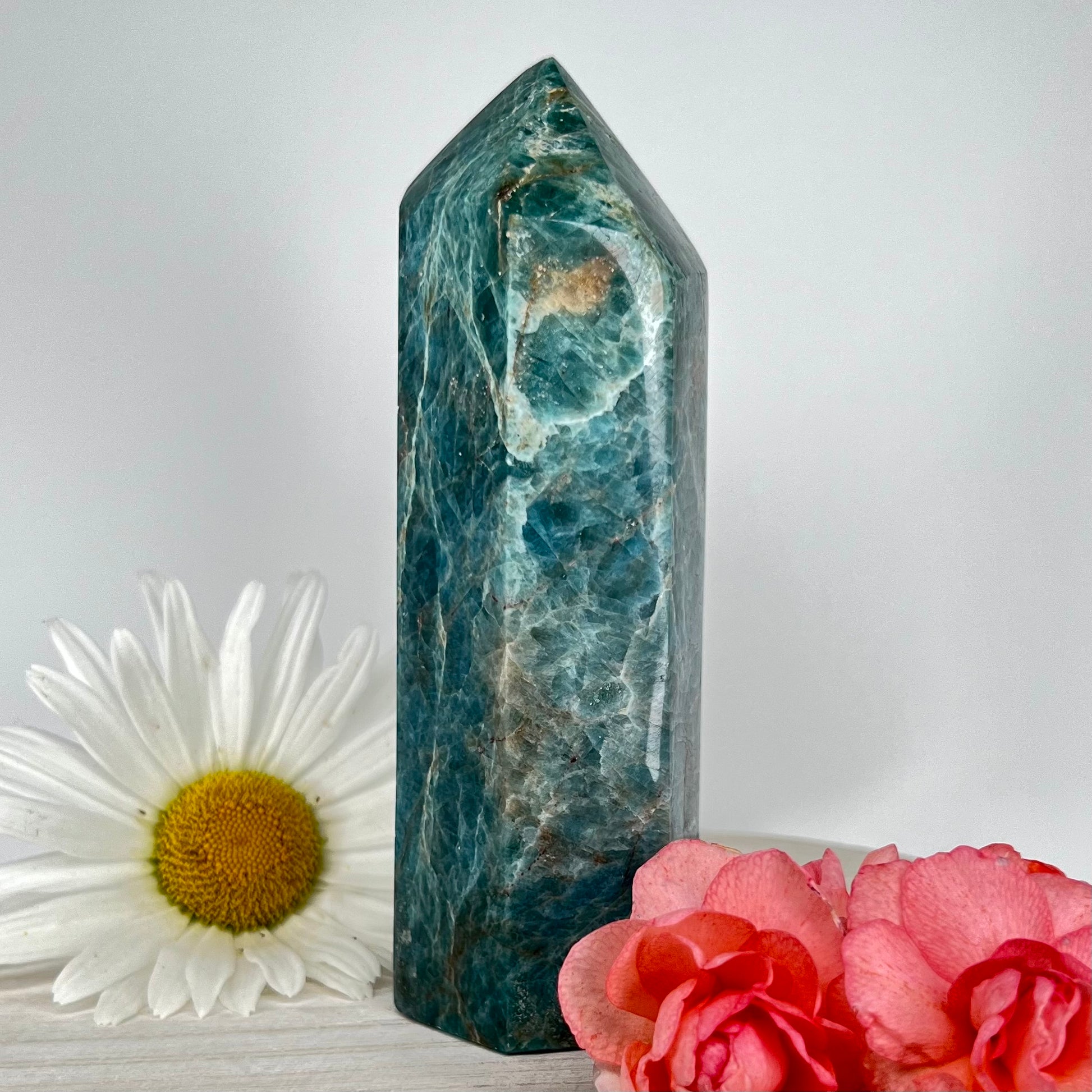 A stone of truth, clarity, and personal empowerment // Blue Apatite balances the energy system, evening out areas of overactivity or depletion, while strengthening your energetic reserves // It helps you own and express your authentic truth with confidence, especially when speaking from both the heart and gut // This stone stimulates creativity, encourages self-expression, and supports the pursuit of knowledge and understanding.