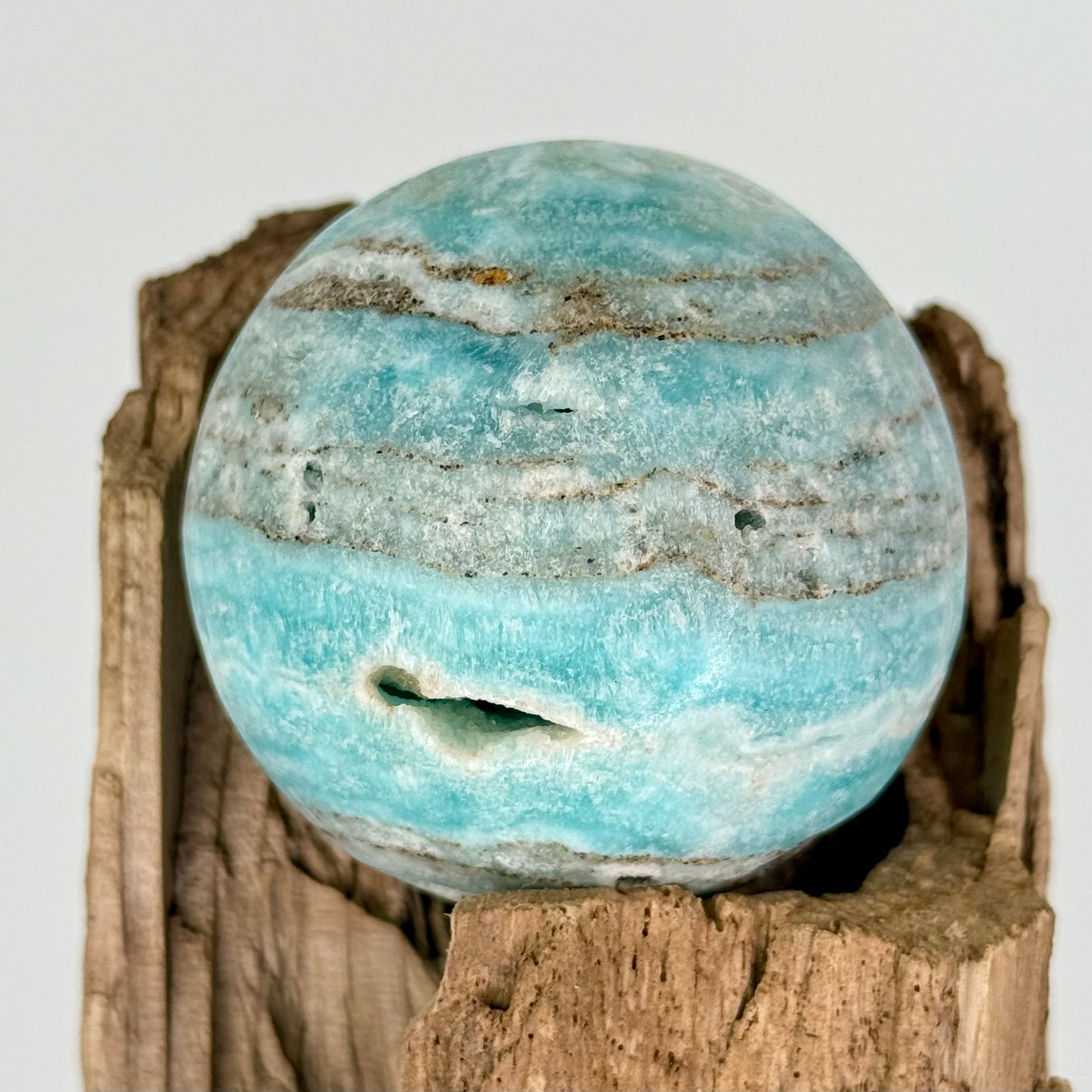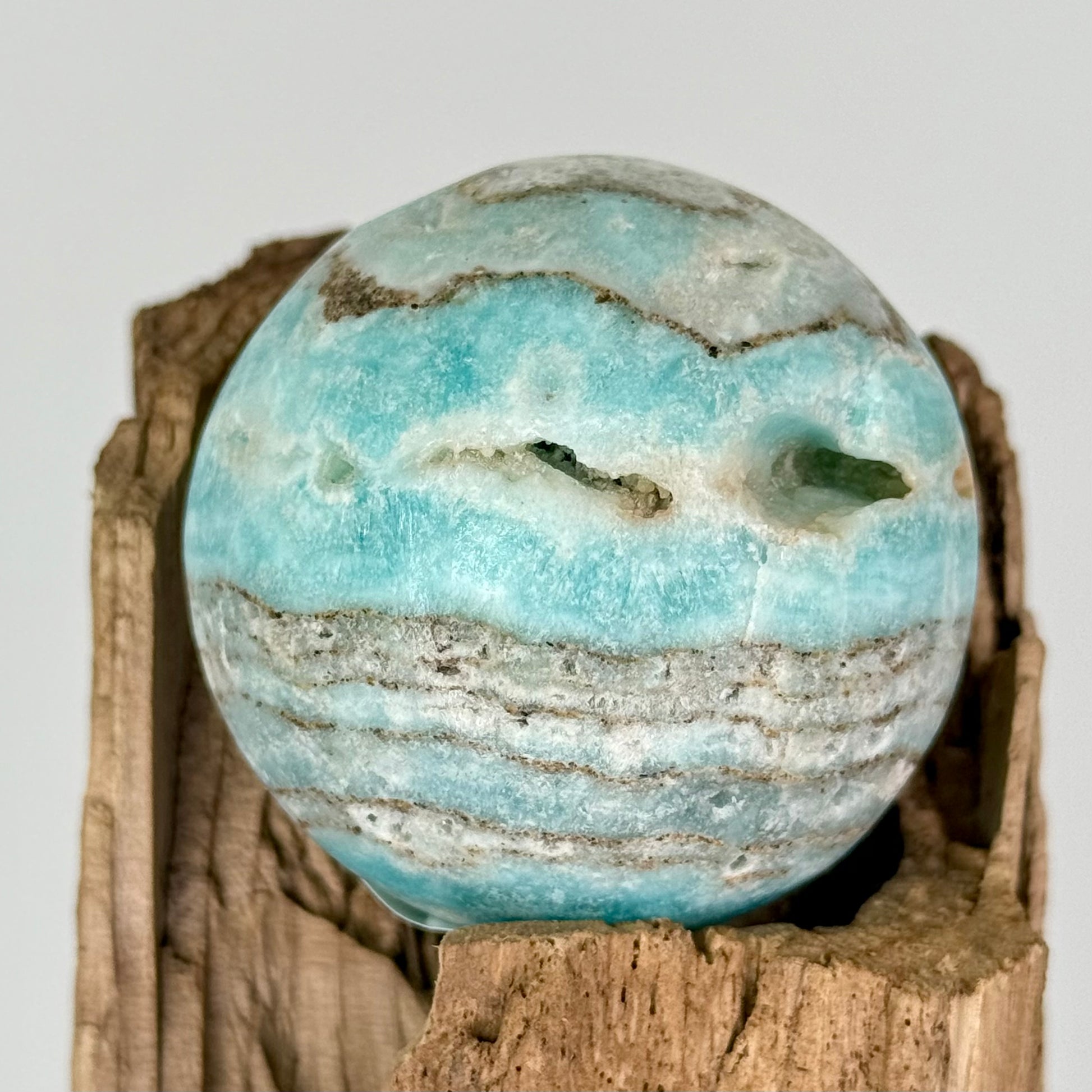 Blue Aragonite is a calming calcium carbonate mineral that forms in sedimentary environments and limestone caves // Found in countries like China, Peru, Pakistan, and Spain, it shares the same core properties as traditional Aragonite, but with an added layer of emotional depth and softness due to its tranquil blue hue.