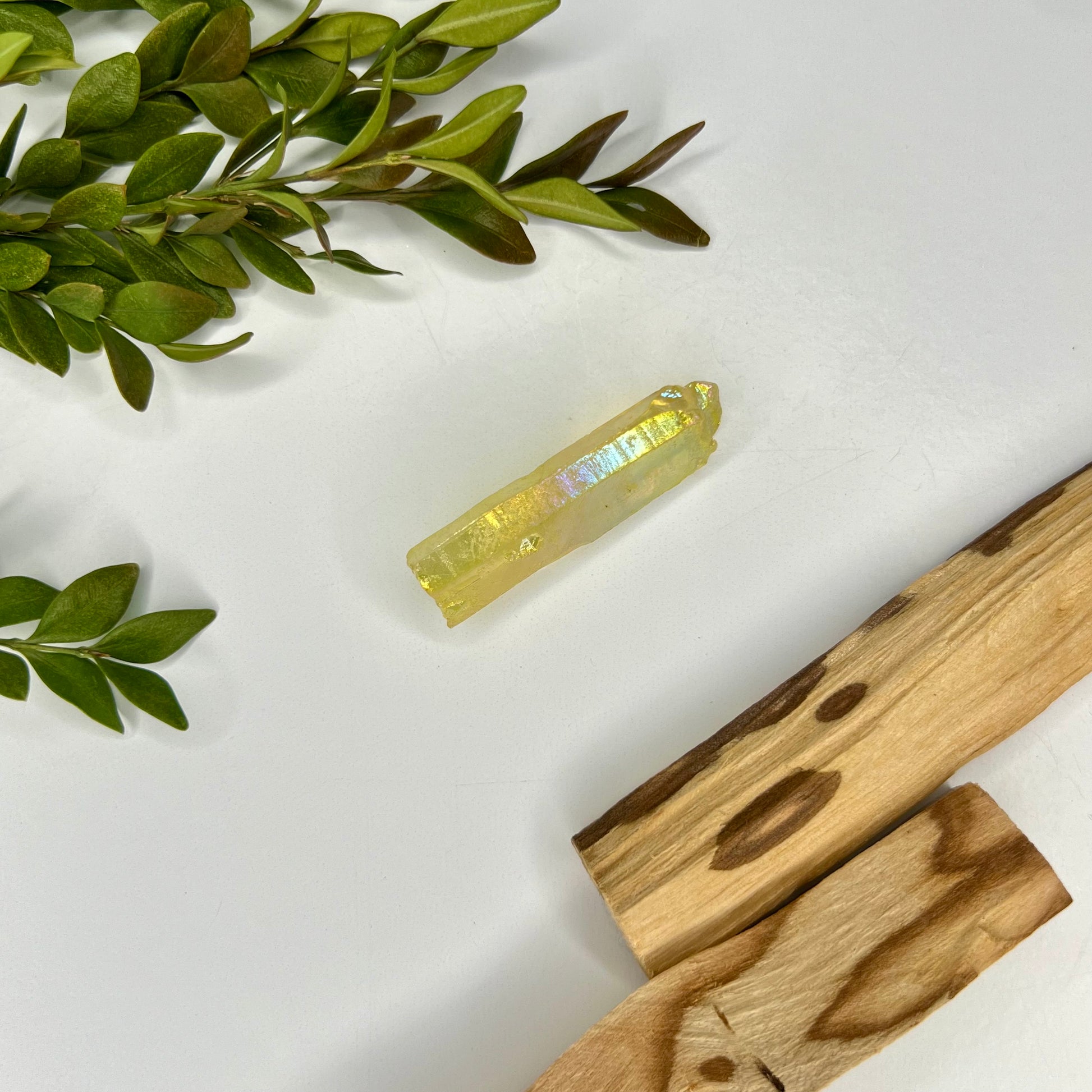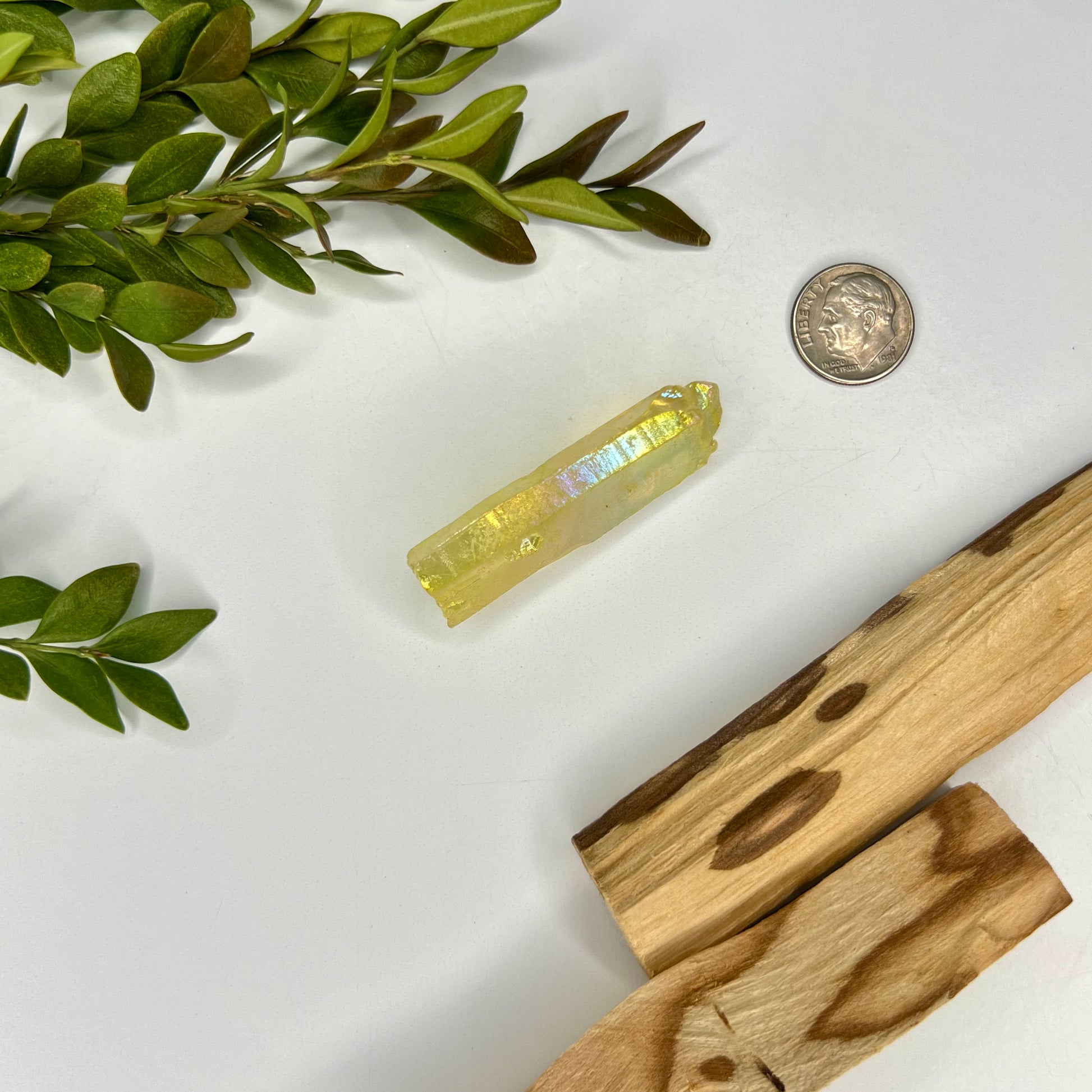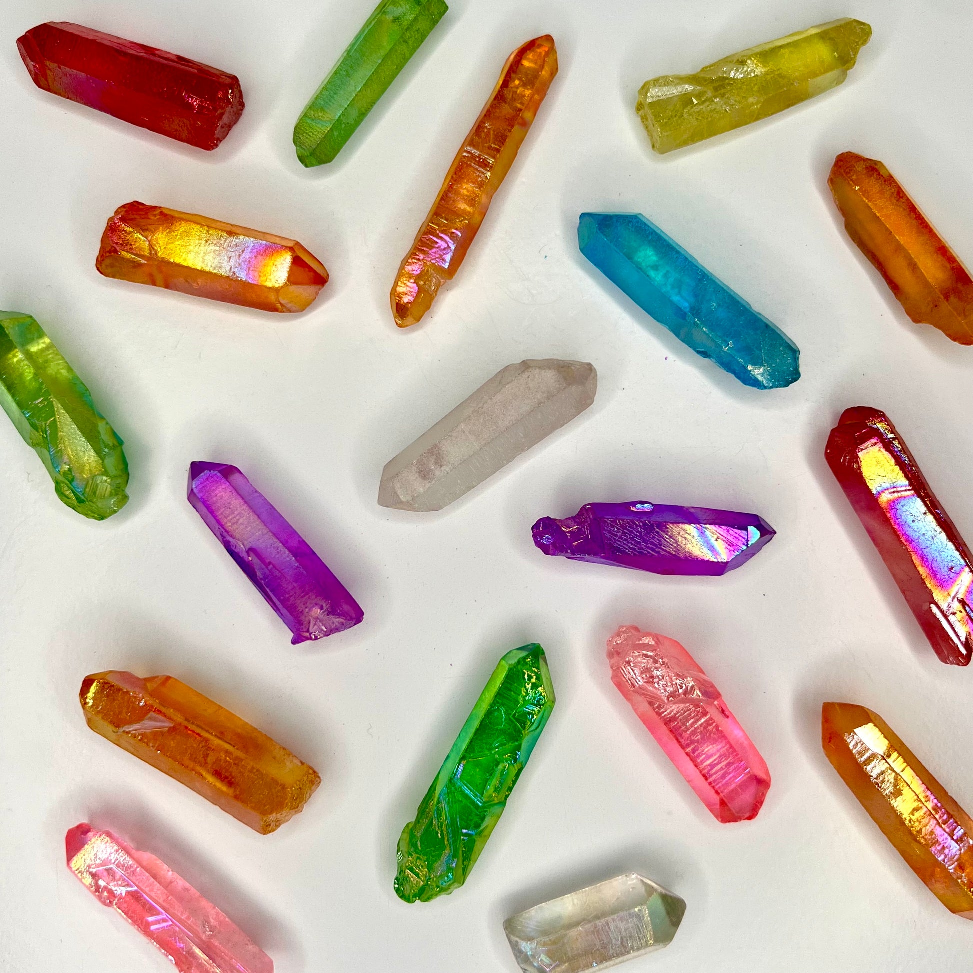 Aura Quartz // Produced when clear Quartz points go through a special treatment process in which their surfaces are bonded with vaporized or finely powered pure metal // Examples; gold, nickel, platinum, silver // The resulting crystals exhibit vivid surfaces with subtle flashes of iridescent rainbow colors.