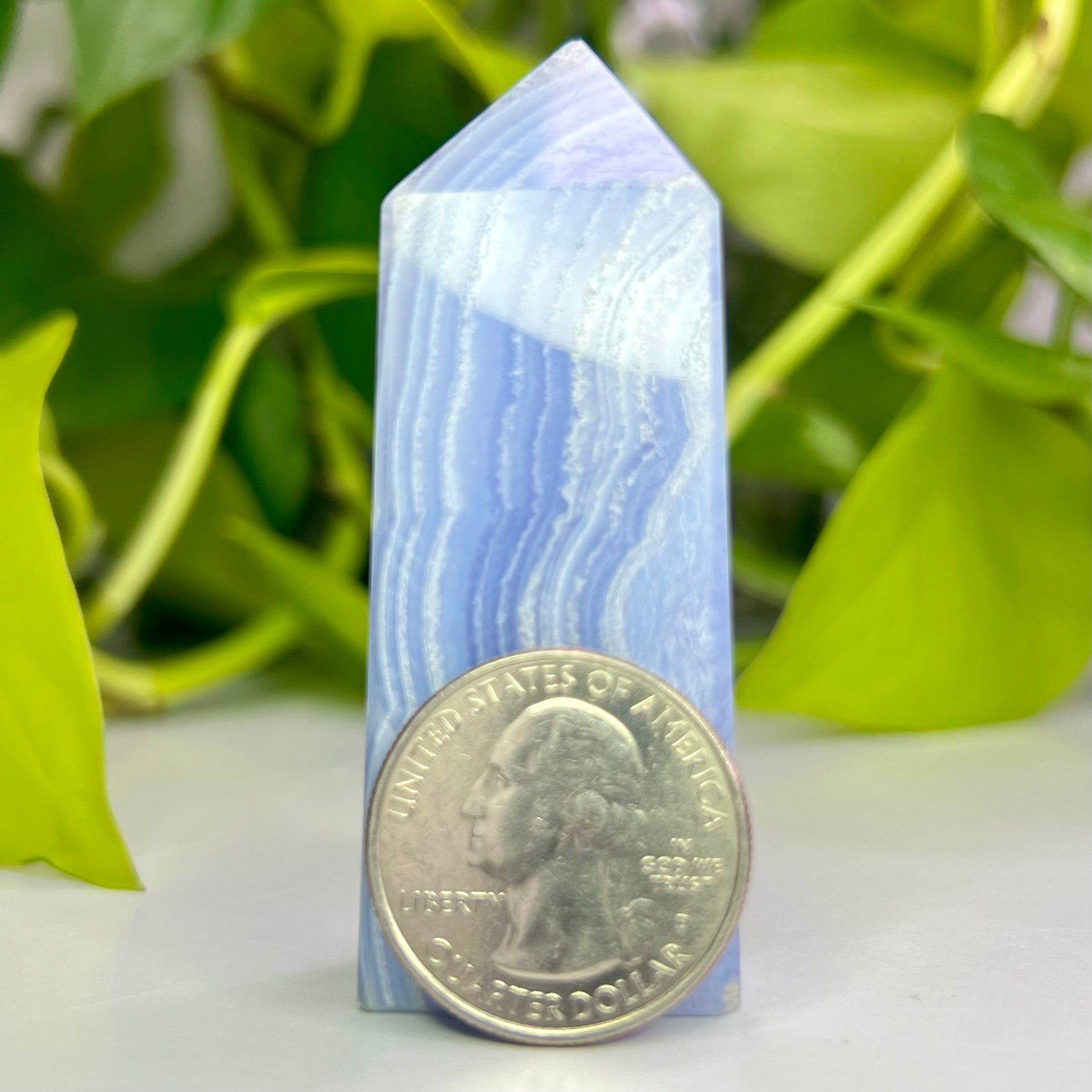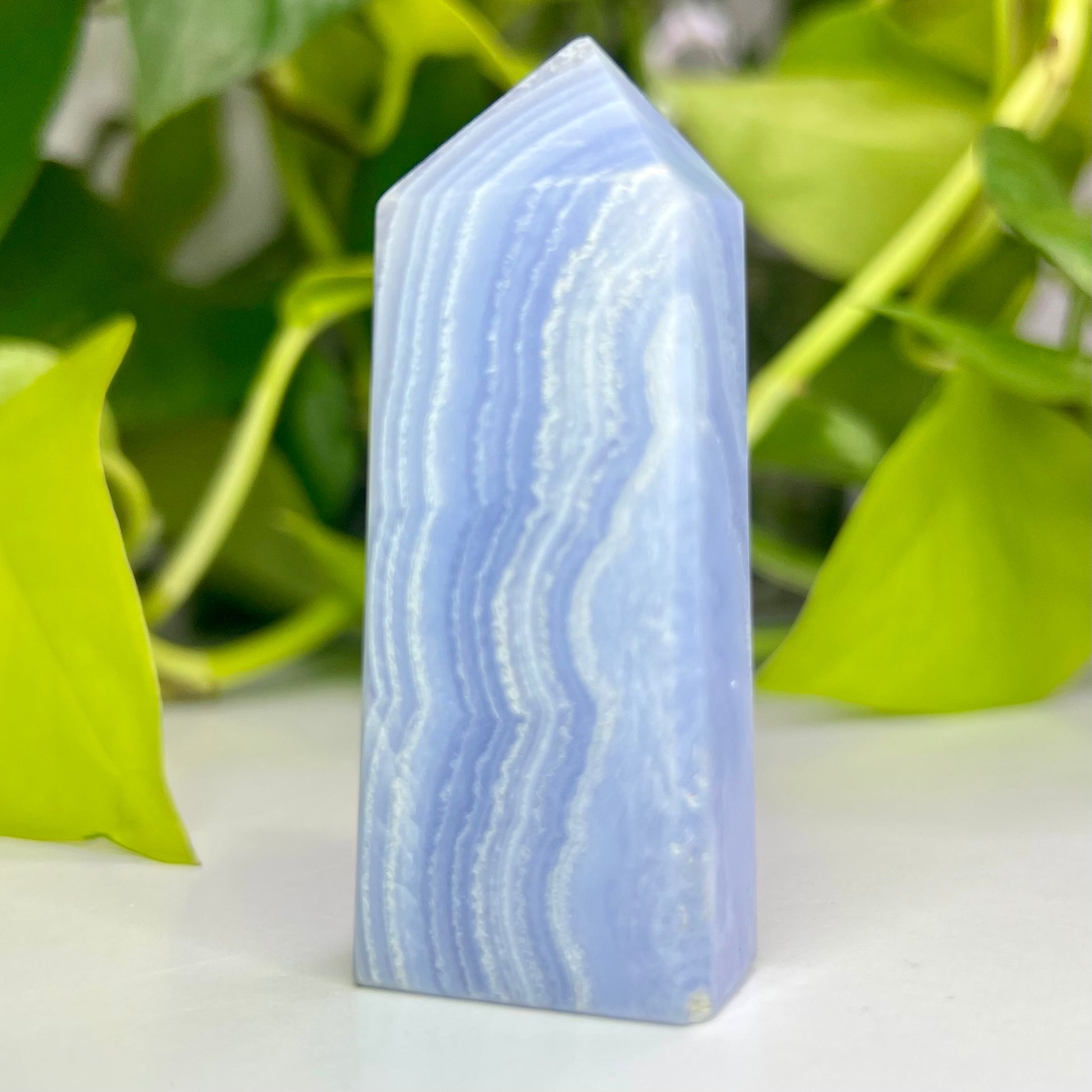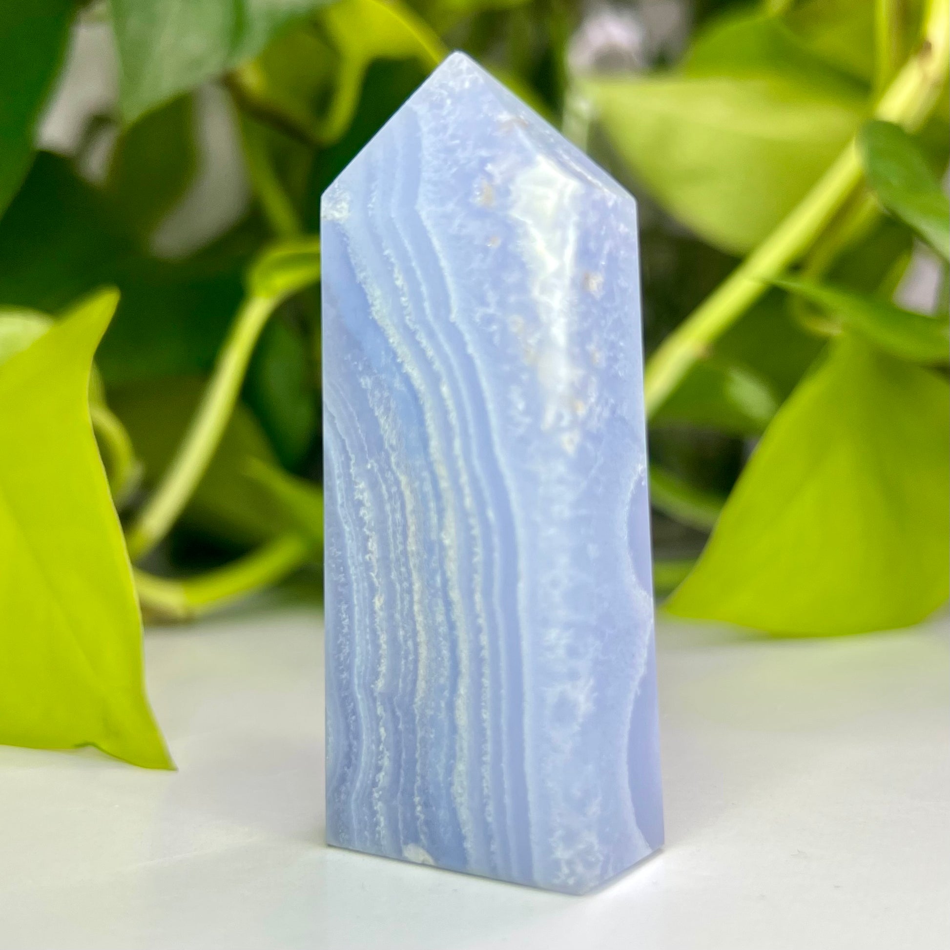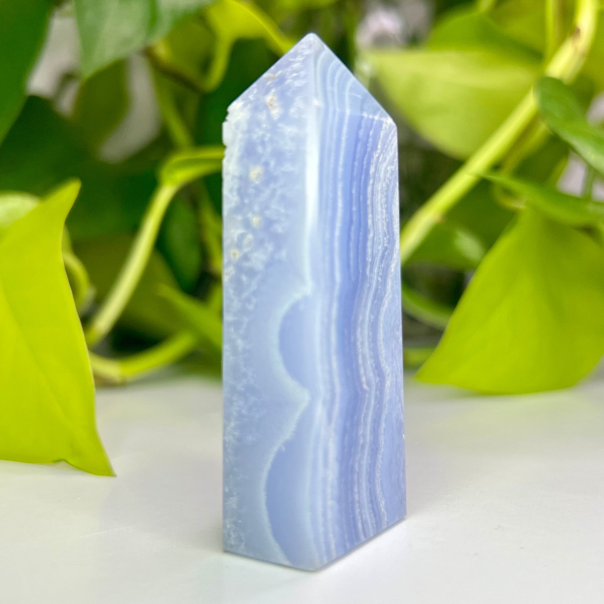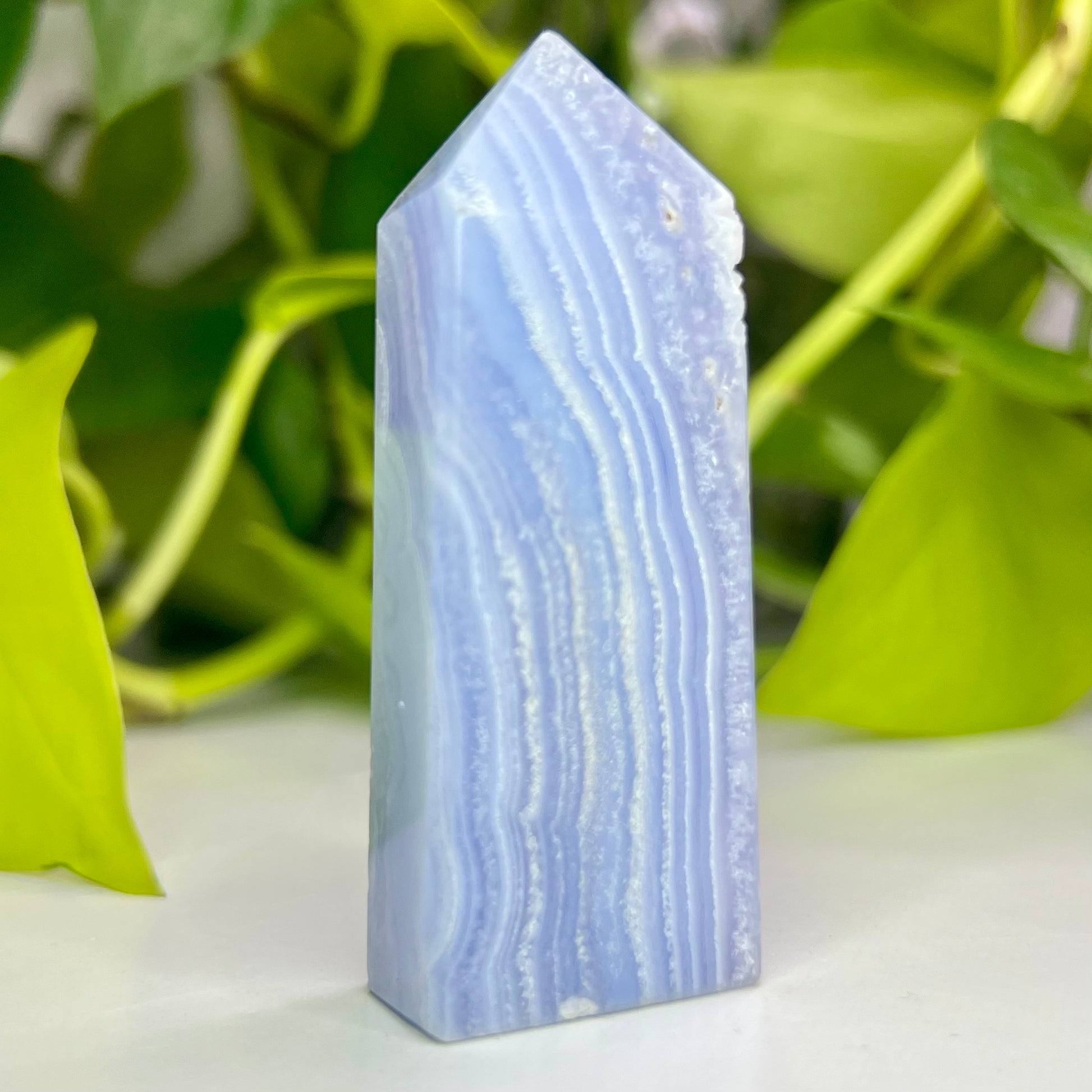 A gentle and soothing stone, known for its intricate patterns of light blue and white bands // Primarily sourced from South Africa, it sometimes features a sparkling druzy crystals.
