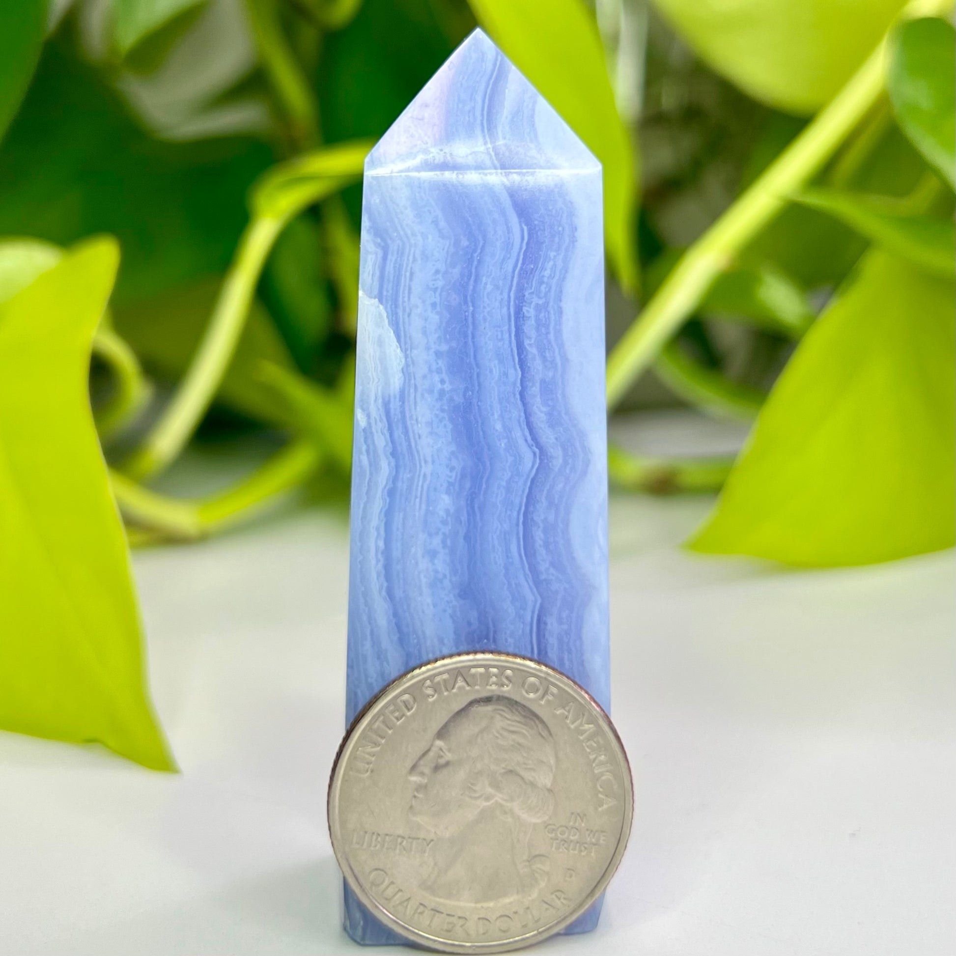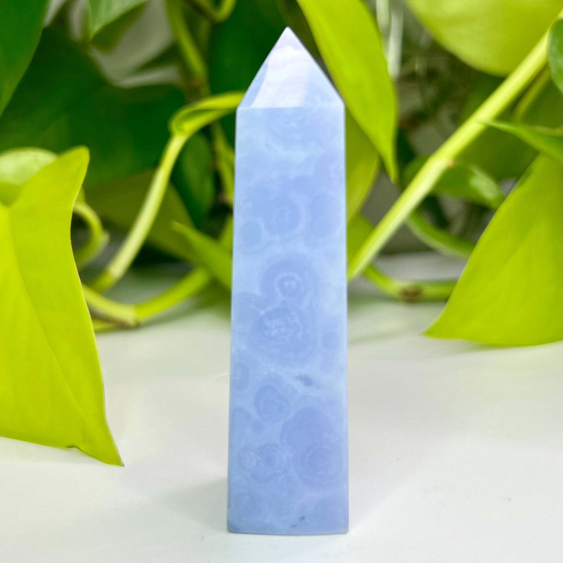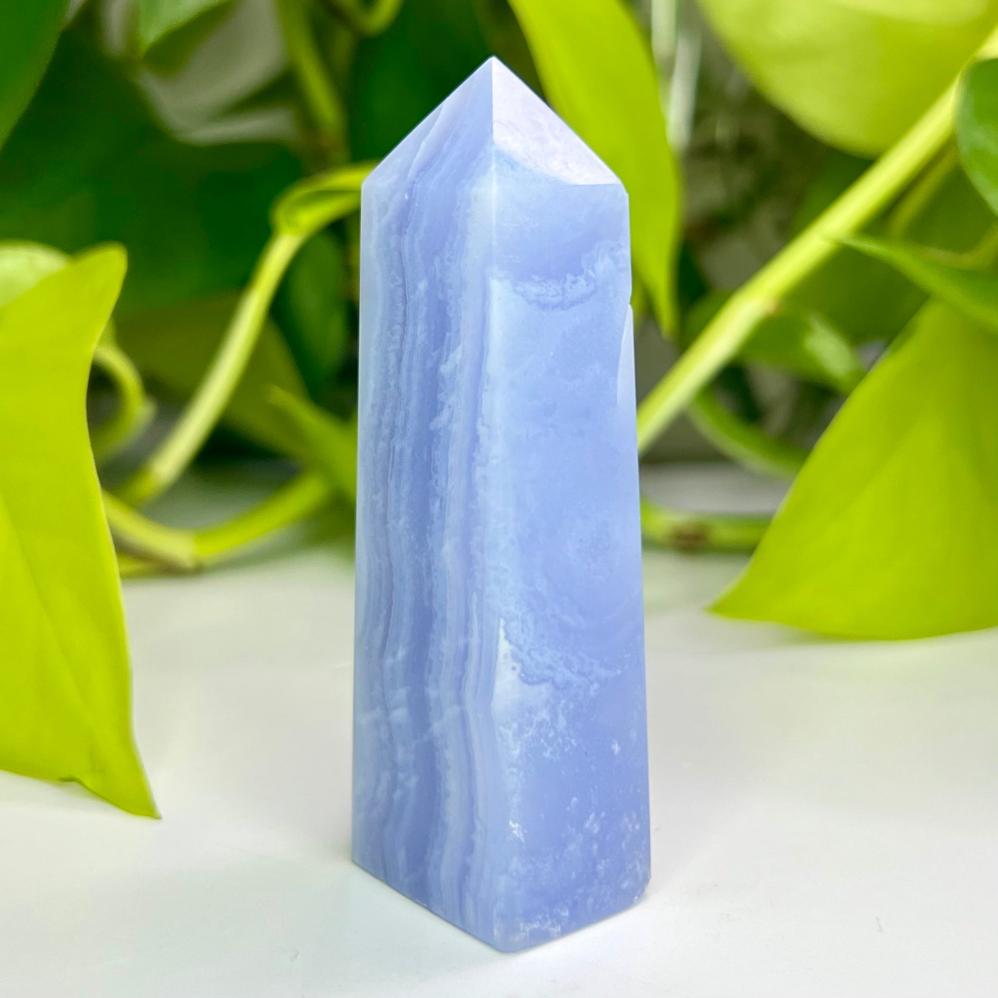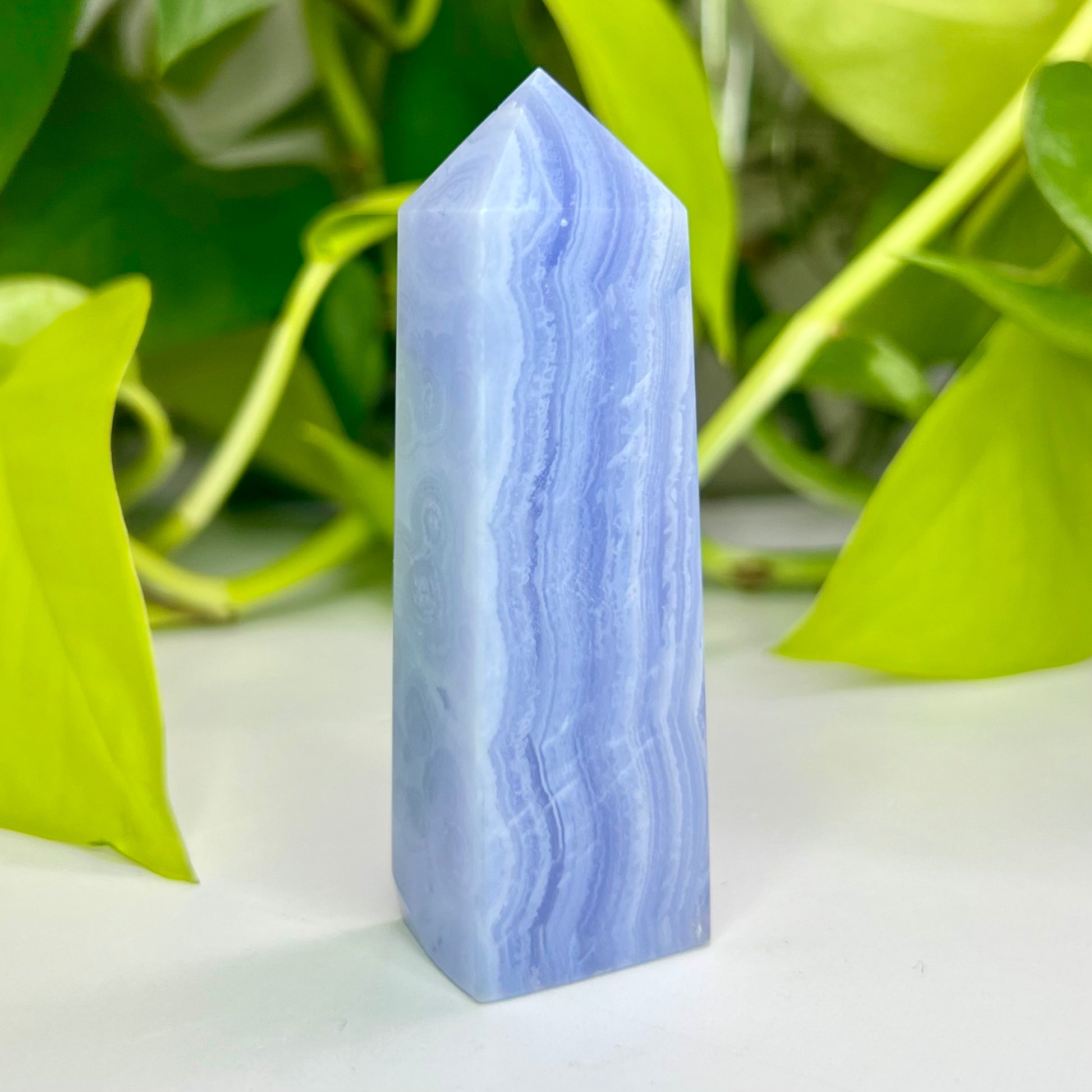 A gentle and soothing stone, known for its intricate patterns of light blue and white bands // Primarily sourced from South Africa, it sometimes features a sparkling druzy crystals.