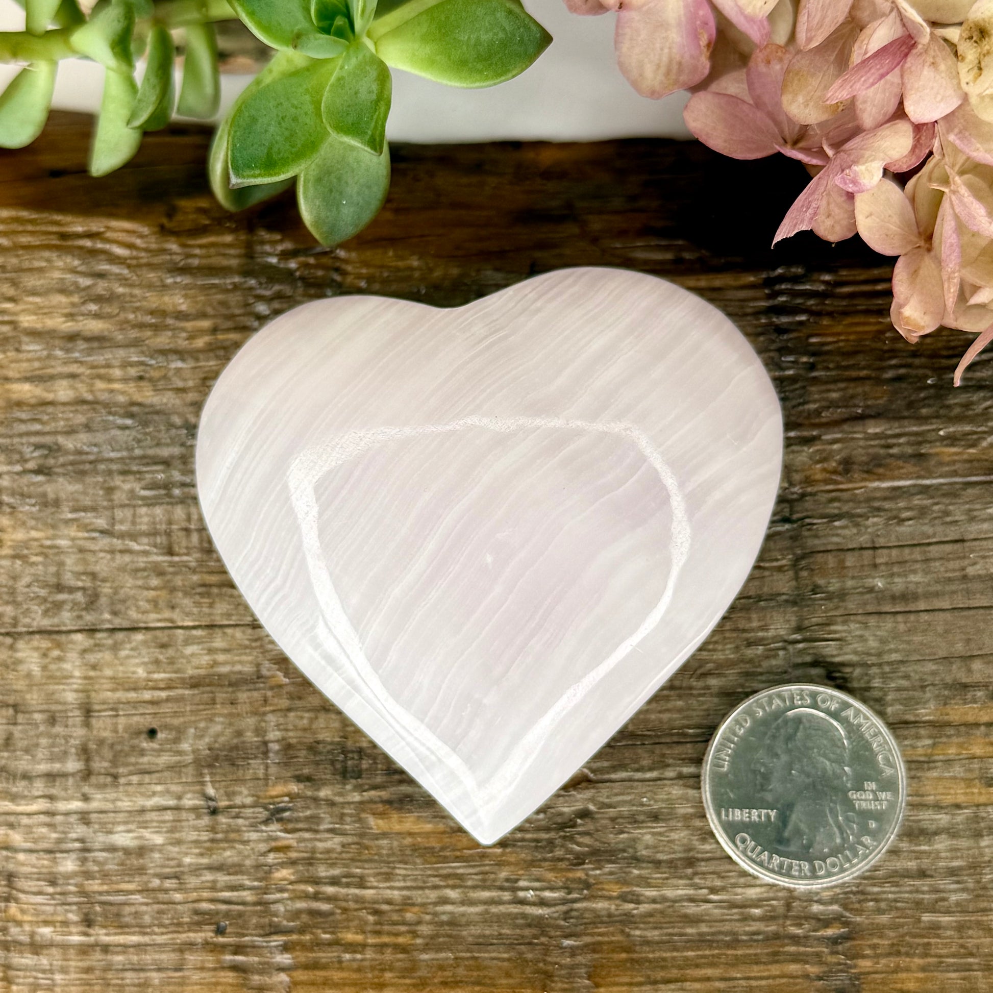 Pink Mangano Calcite is a soft, delicate variety of calcite known for its pale pink hue and subtle white banding or fluorescence under UV light // Its color and calming vibration come from trace amounts of manganese // Found primarily in Peru, Romania, and the U.S., this stone often forms in sedimentary environments and can be found alongside other calcium-rich minerals like gypsum and aragonite.