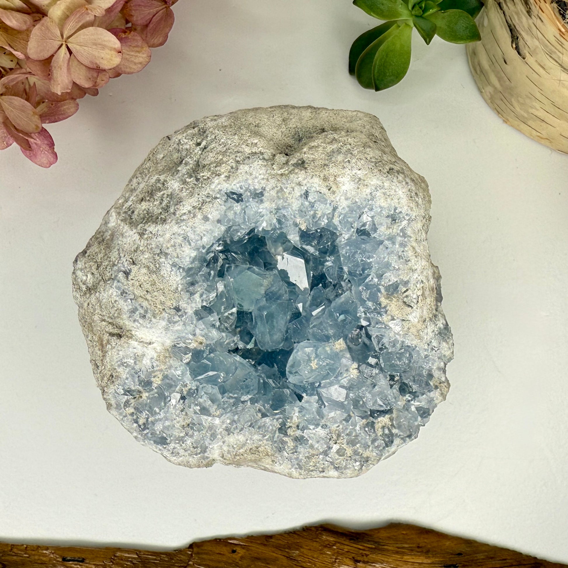 Celestite, also known as Celestine, is a strontium sulfate mineral best known for its soft sky-blue crystals and calming energy // Found in Madagascar, Mexico, and the United States, it often forms in sedimentary rock and is commonly found alongside gypsum, halite, and calcite // Its gentle color and vibration make it a favorite for creating peaceful, high-vibrational spaces.