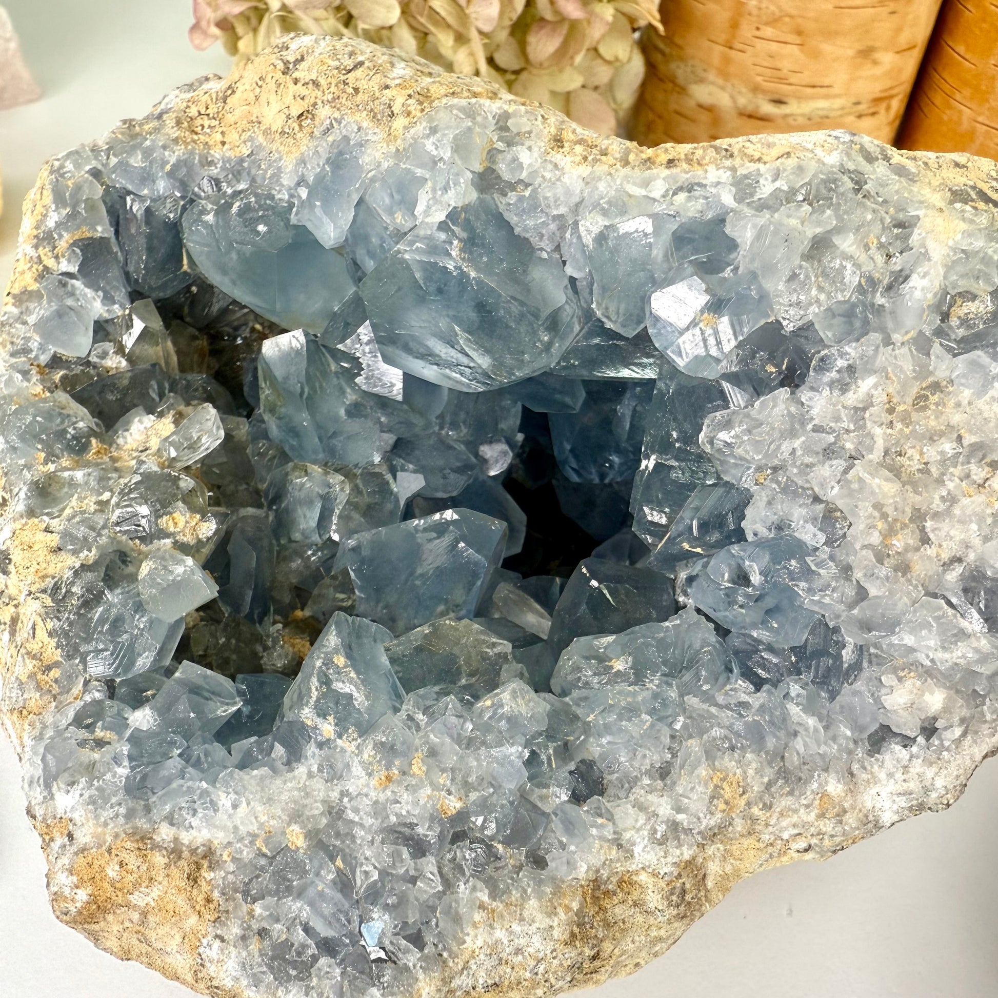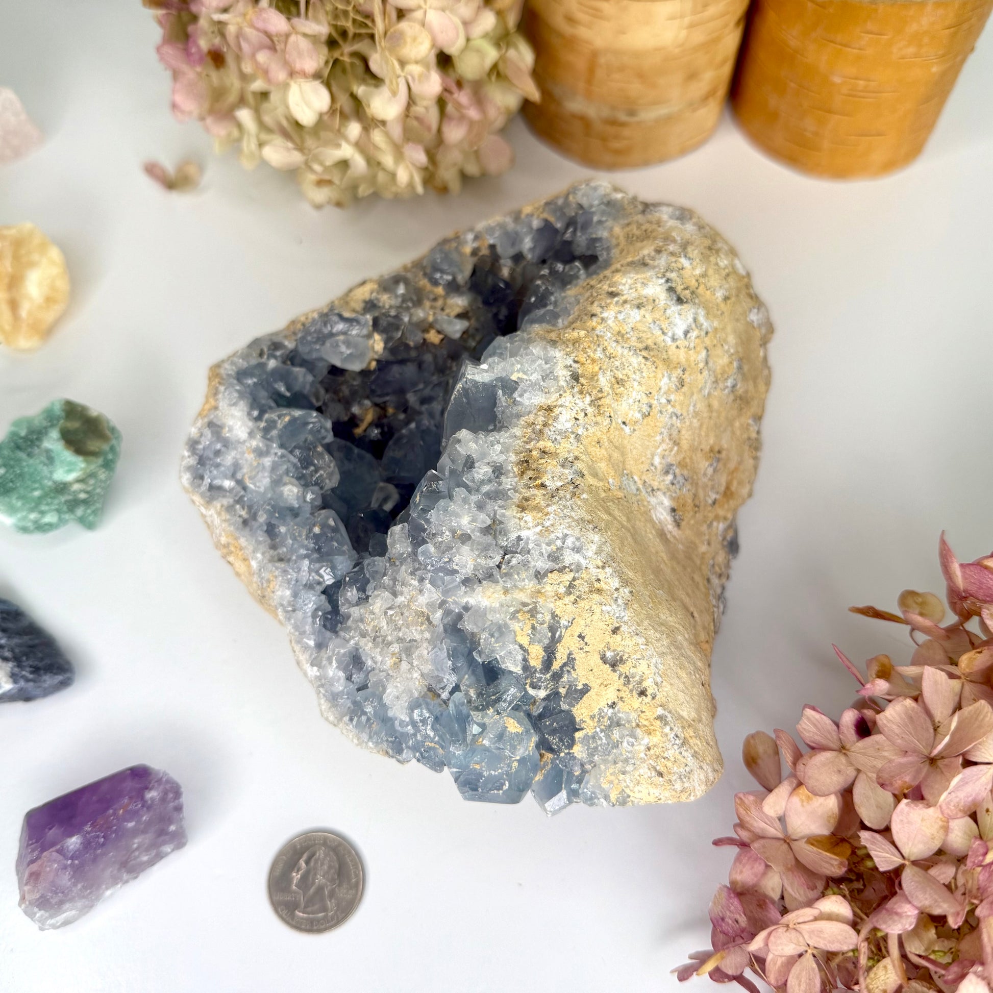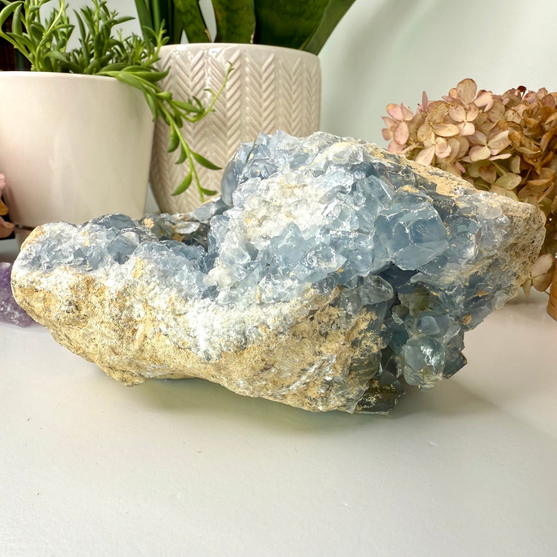 Celestite, also known as Celestine, is a strontium sulfate mineral best known for its soft sky-blue crystals and calming energy // Found in Madagascar, Mexico, and the United States, it often forms in sedimentary rock and is commonly found alongside gypsum, halite, and calcite // Its gentle color and vibration make it a favorite for creating peaceful, high-vibrational spaces.