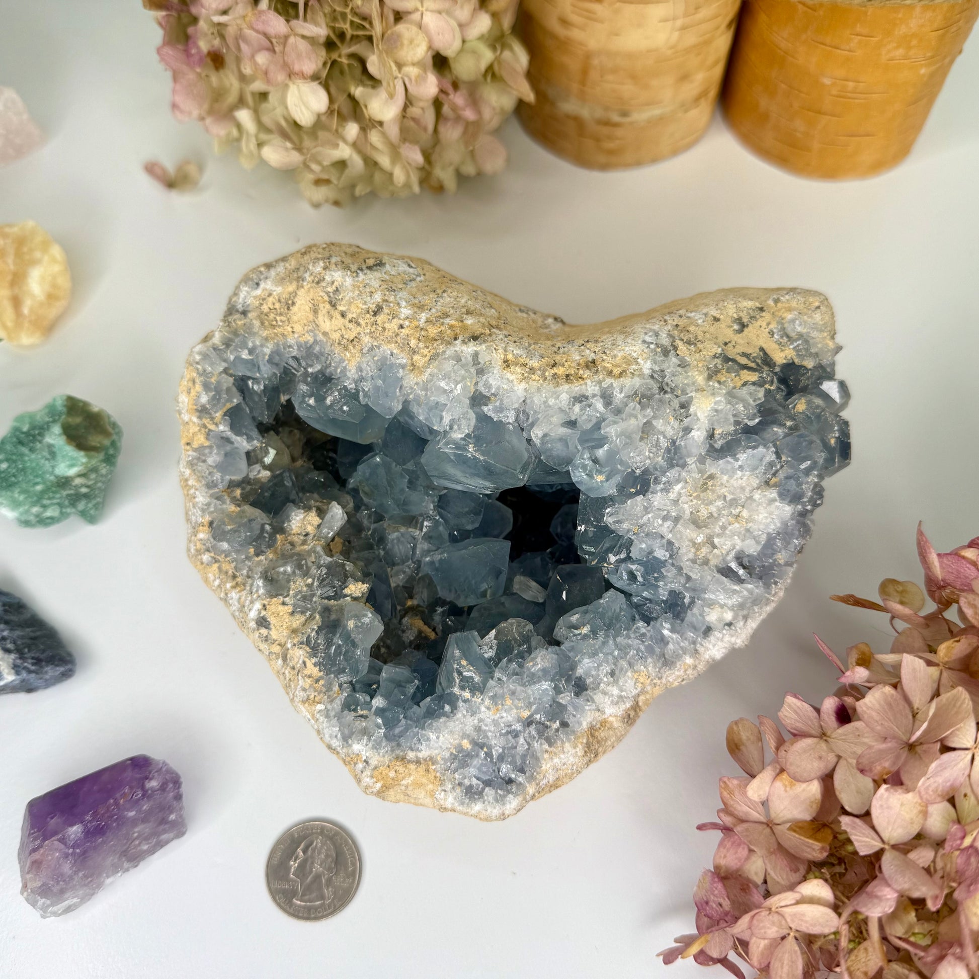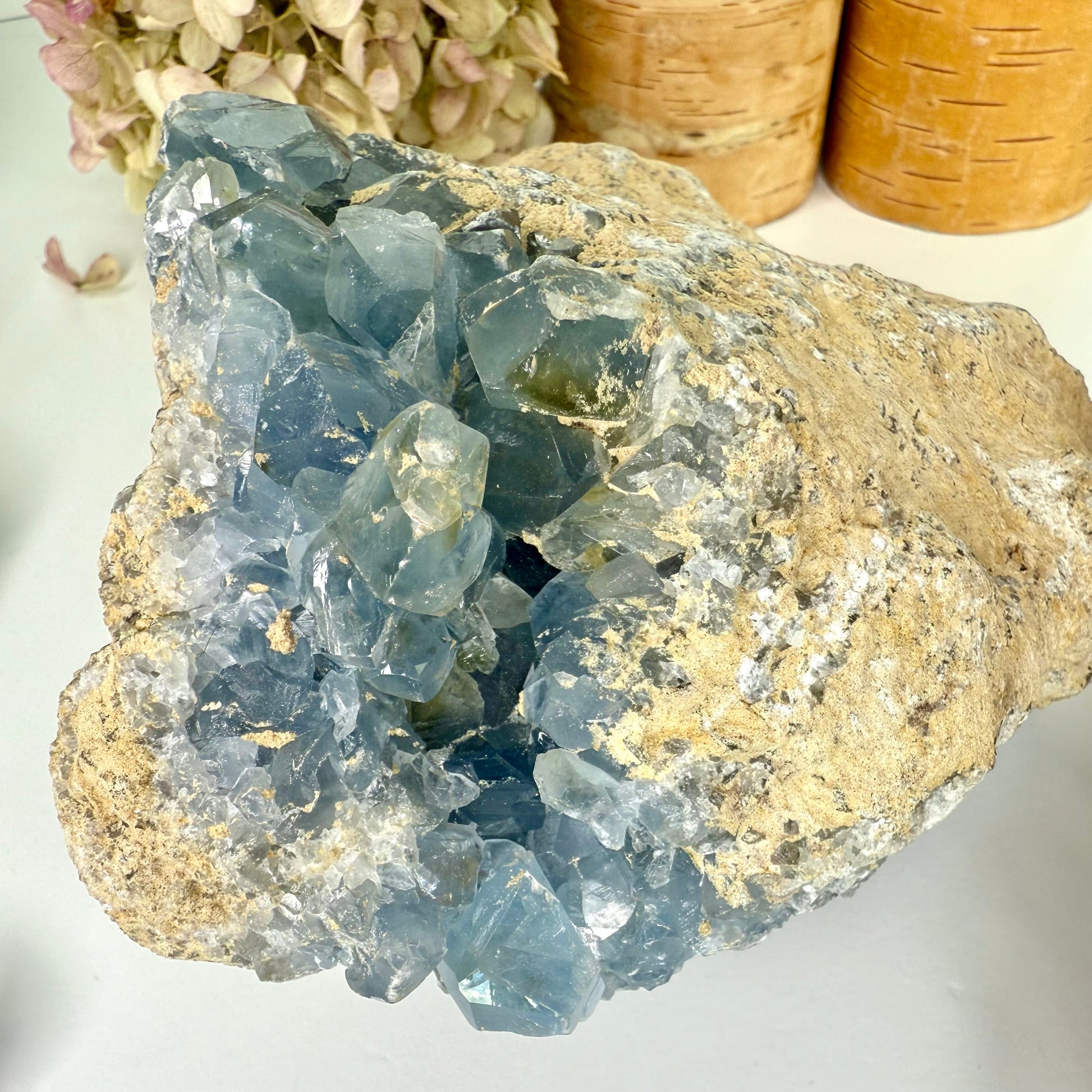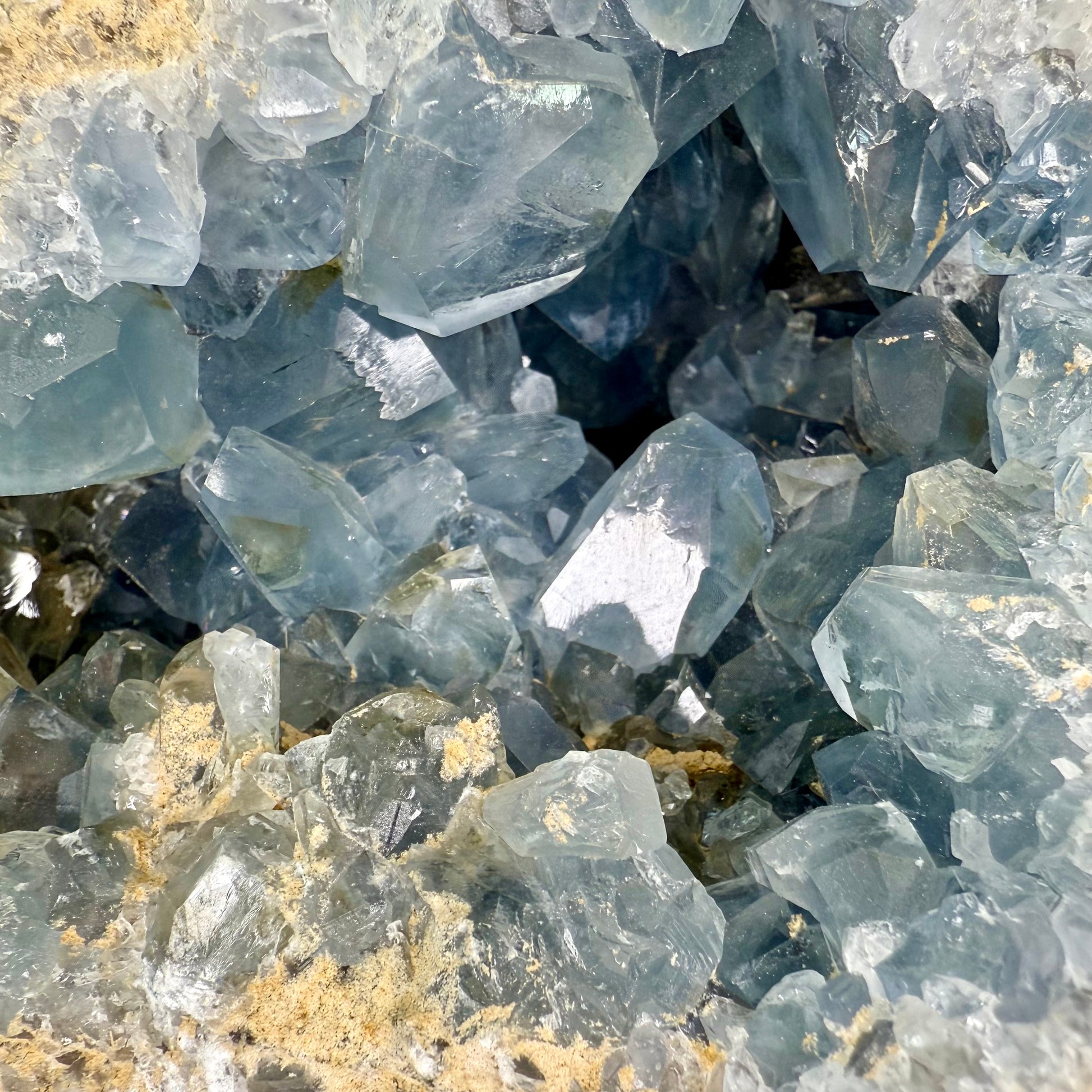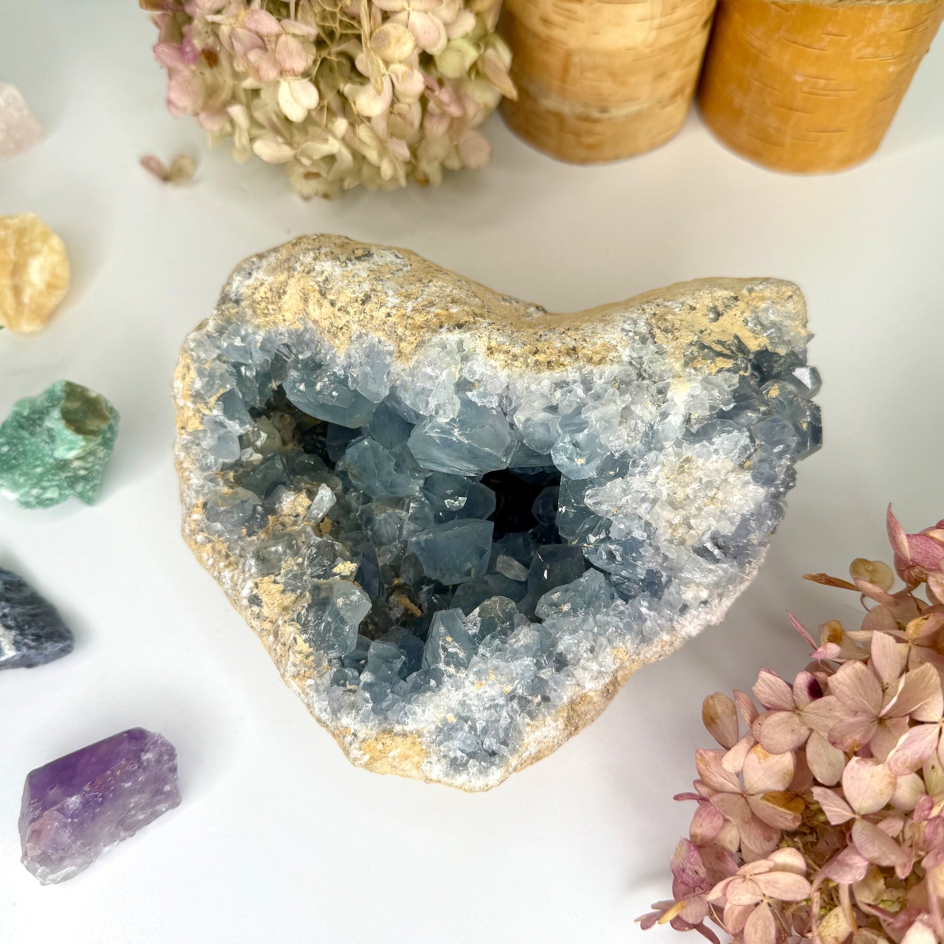 Celestite, also known as Celestine, is a strontium sulfate mineral best known for its soft sky-blue crystals and calming energy // Found in Madagascar, Mexico, and the United States, it often forms in sedimentary rock and is commonly found alongside gypsum, halite, and calcite // Its gentle color and vibration make it a favorite for creating peaceful, high-vibrational spaces.