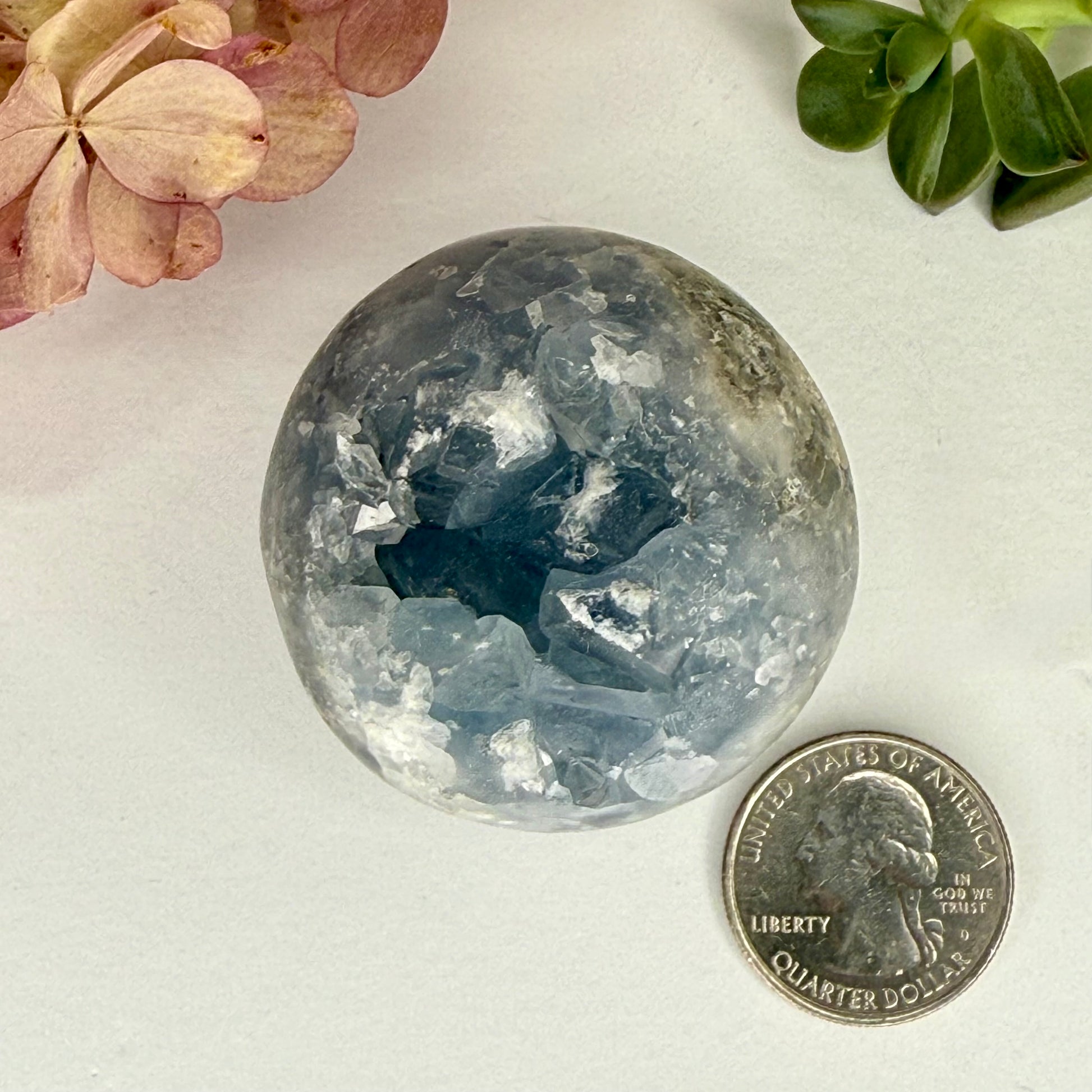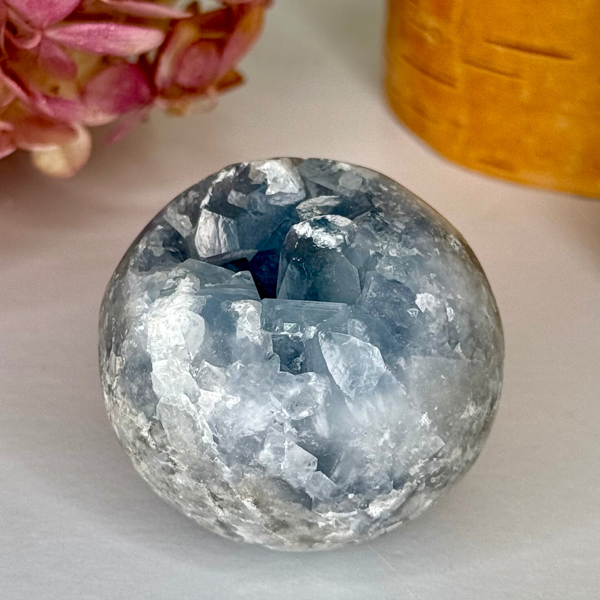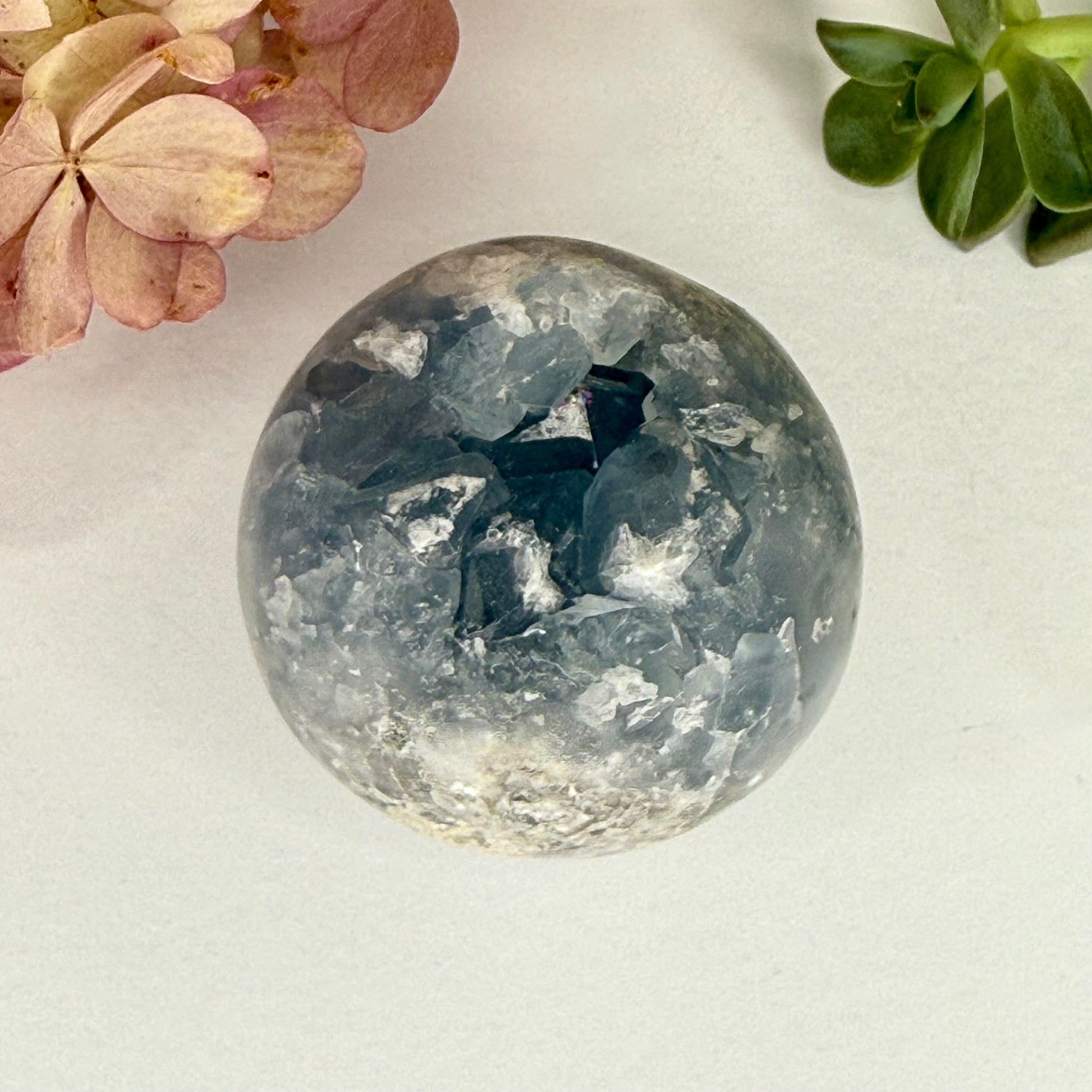 Celestite, also known as Celestine, is a strontium sulfate mineral best known for its soft sky-blue crystals and calming energy // Found in Madagascar, Mexico, and the United States, it often forms in sedimentary rock and is commonly found alongside gypsum, halite, and calcite // Its gentle color and vibration make it a favorite for creating peaceful, high-vibrational spaces.