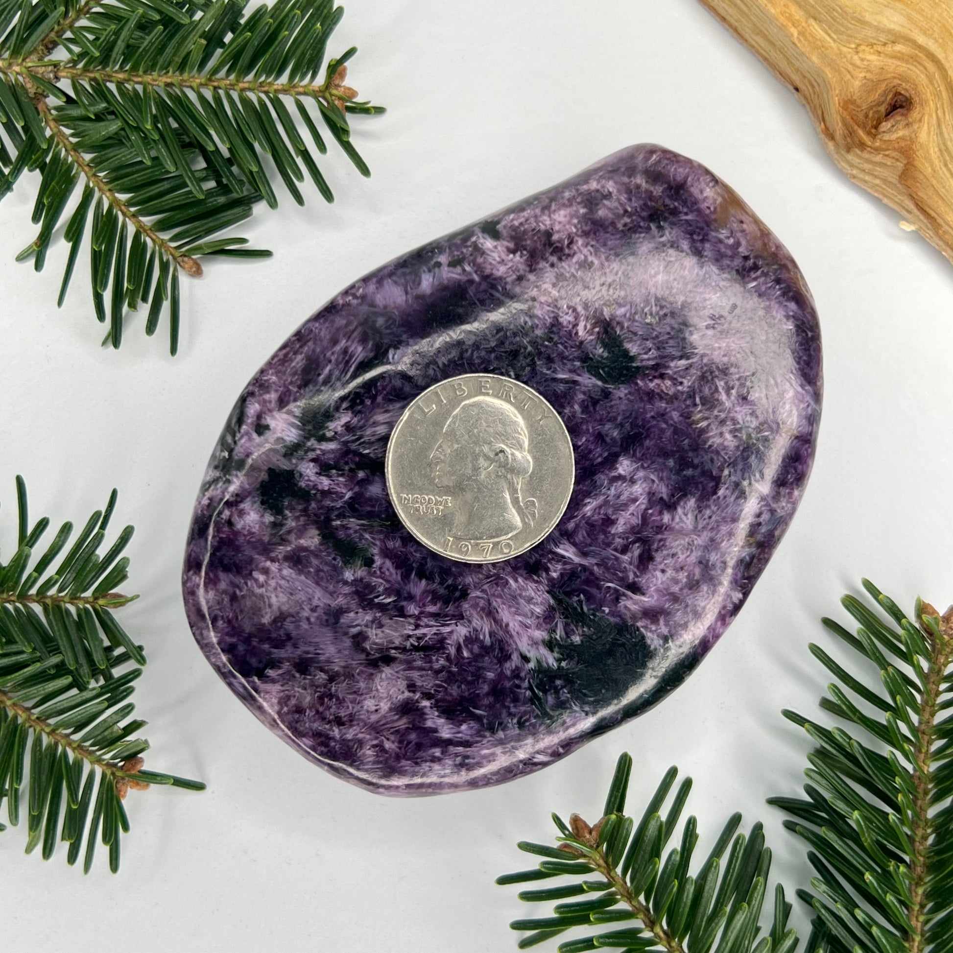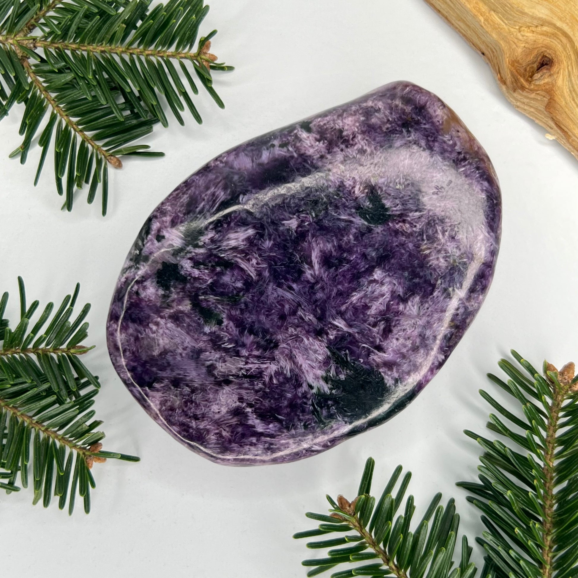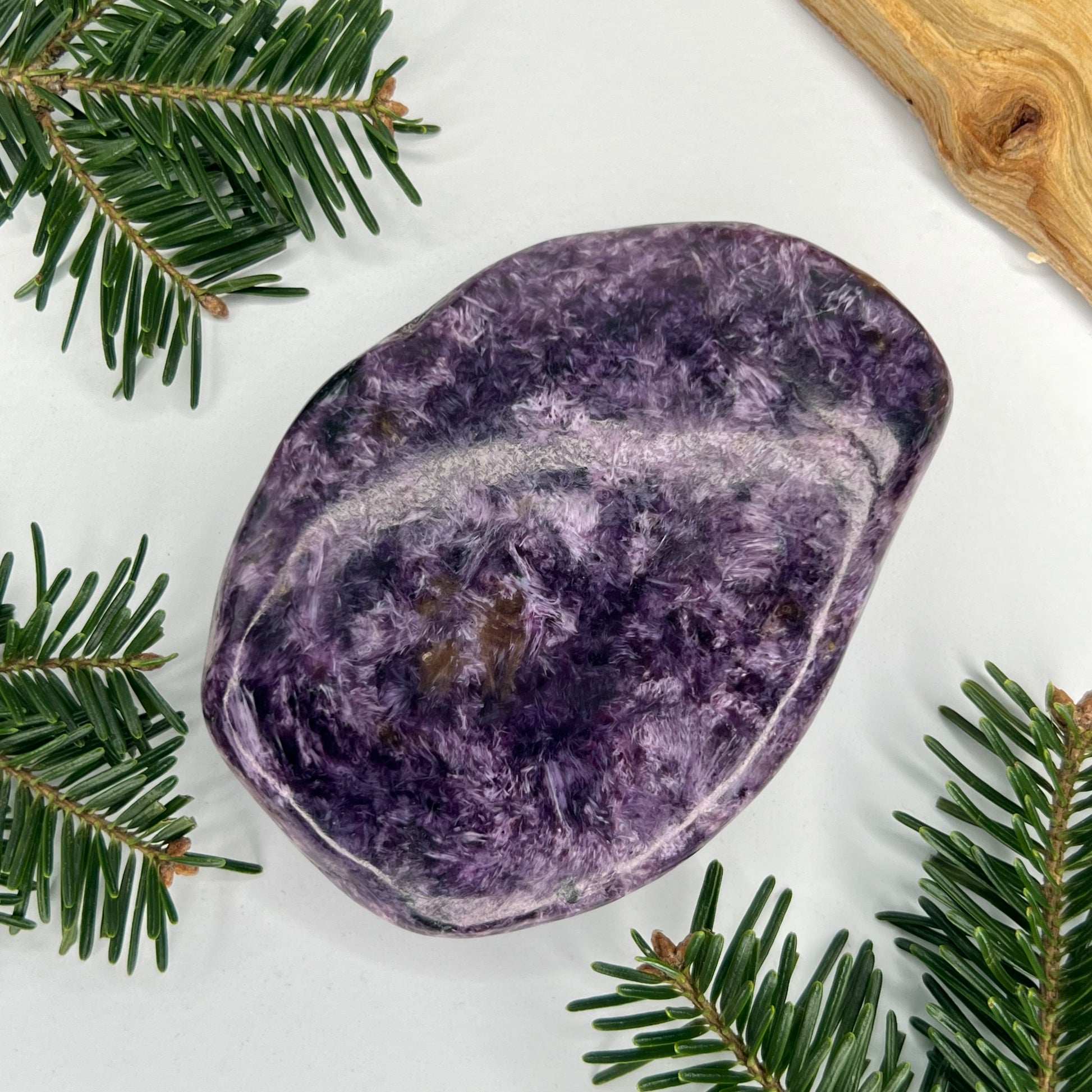 Known for its powerful emanation of the Purple Ray // Purifies & cleanses the etheric body // Protection // Releases disharmonies & dispels negativity // Strongly stimulates the Third Eye & Crown Chakras //Activates the Solar Plexus & Root Chakras // Stimulates intuitive & psychic abilities // Excellent for Healers, assists in both regulating their flow through the body in grounding excess energy to prevent psychic burn-out // Helps overcome resistance to your sacred path // Grounds higher frequency energy into the physical world with the black dendritic formations within Charoite // Assists with energetic boundaries.