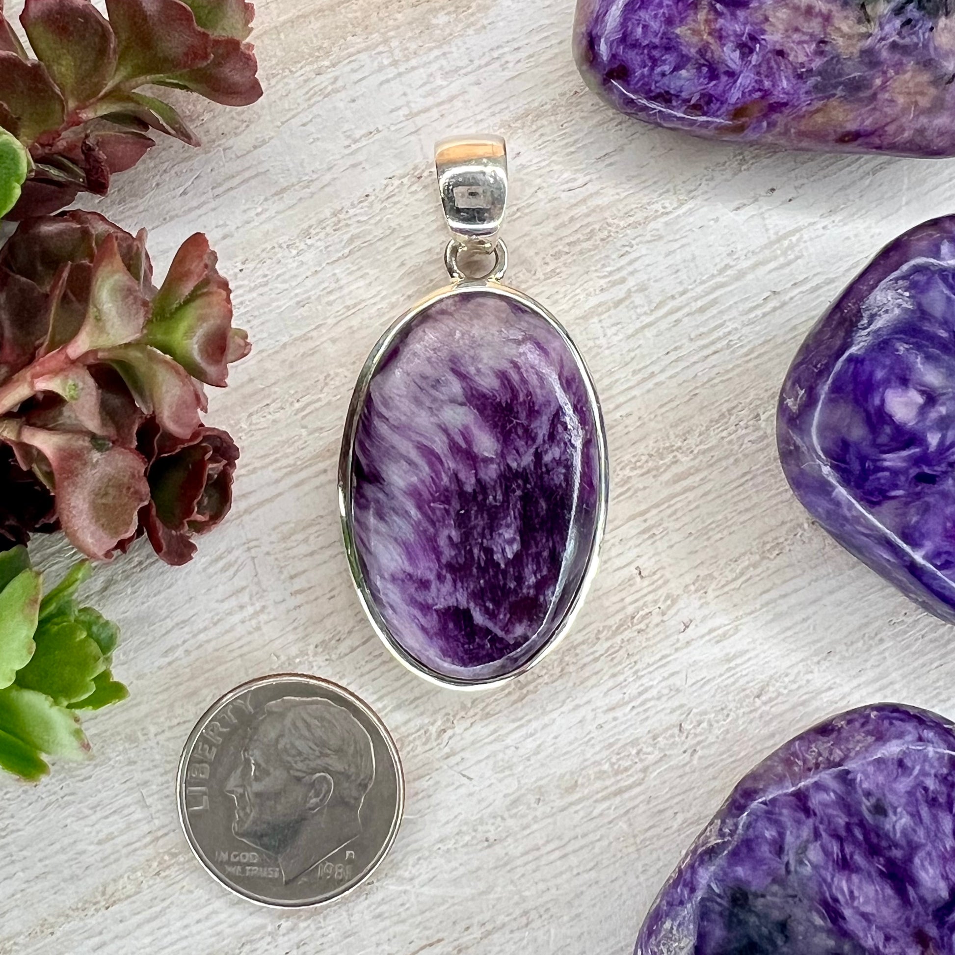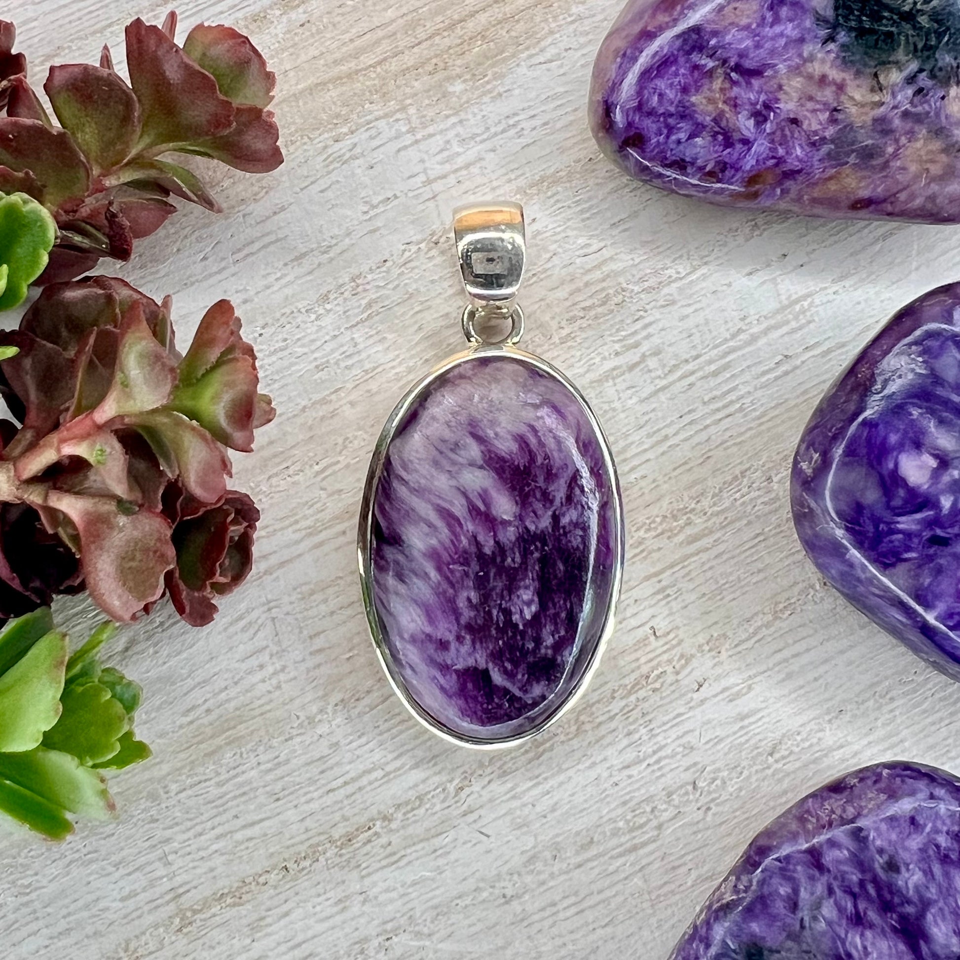 Known for its powerful emanation of the Purple Ray // Purifies & cleanses the etheric body // Protection // Releases disharmonies & dispels negativity // Strongly stimulates the Third Eye & Crown Chakras //Activates the Solar Plexus & Root Chakras // Stimulates intuitive & psychic abilities // Excellent for Healers, assists in both regulating their flow through the body in grounding excess energy to prevent psychic burn-out // Helps overcome resistance to your sacred path // Grounds higher frequency energy into the physical world with the black dendritic formations within Charoite // Assists with energetic boundaries.