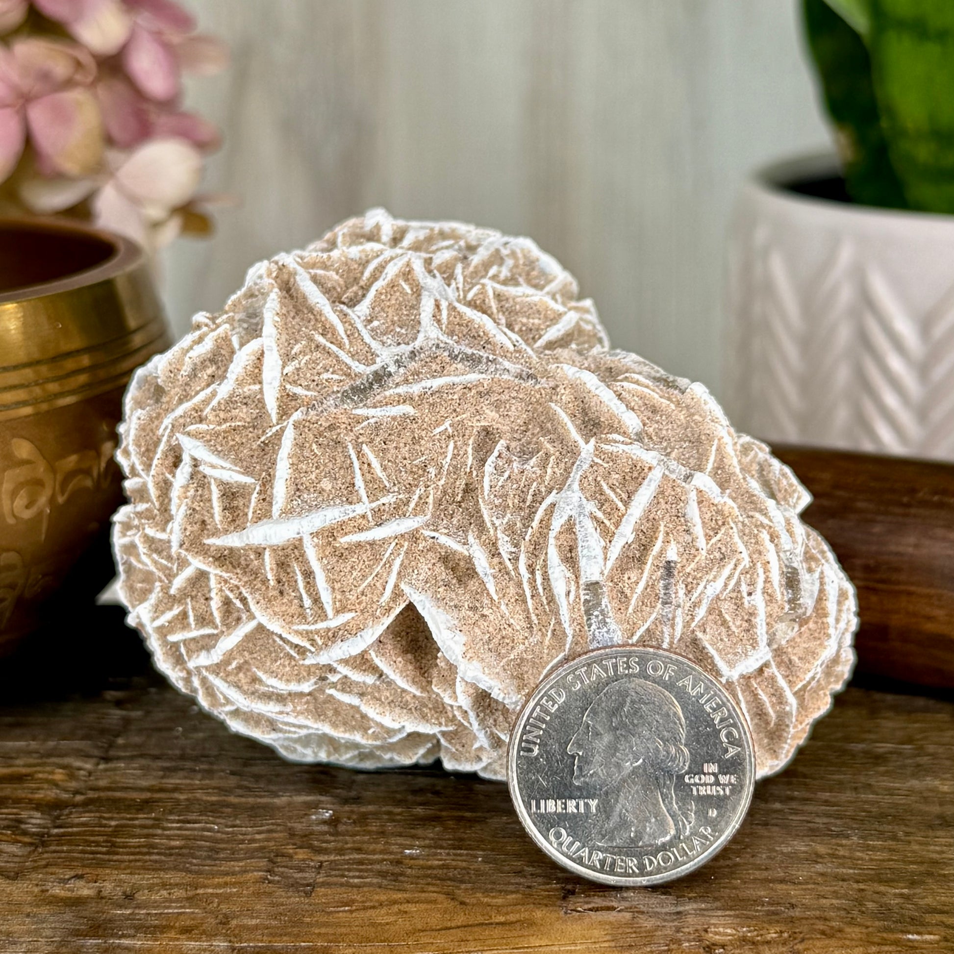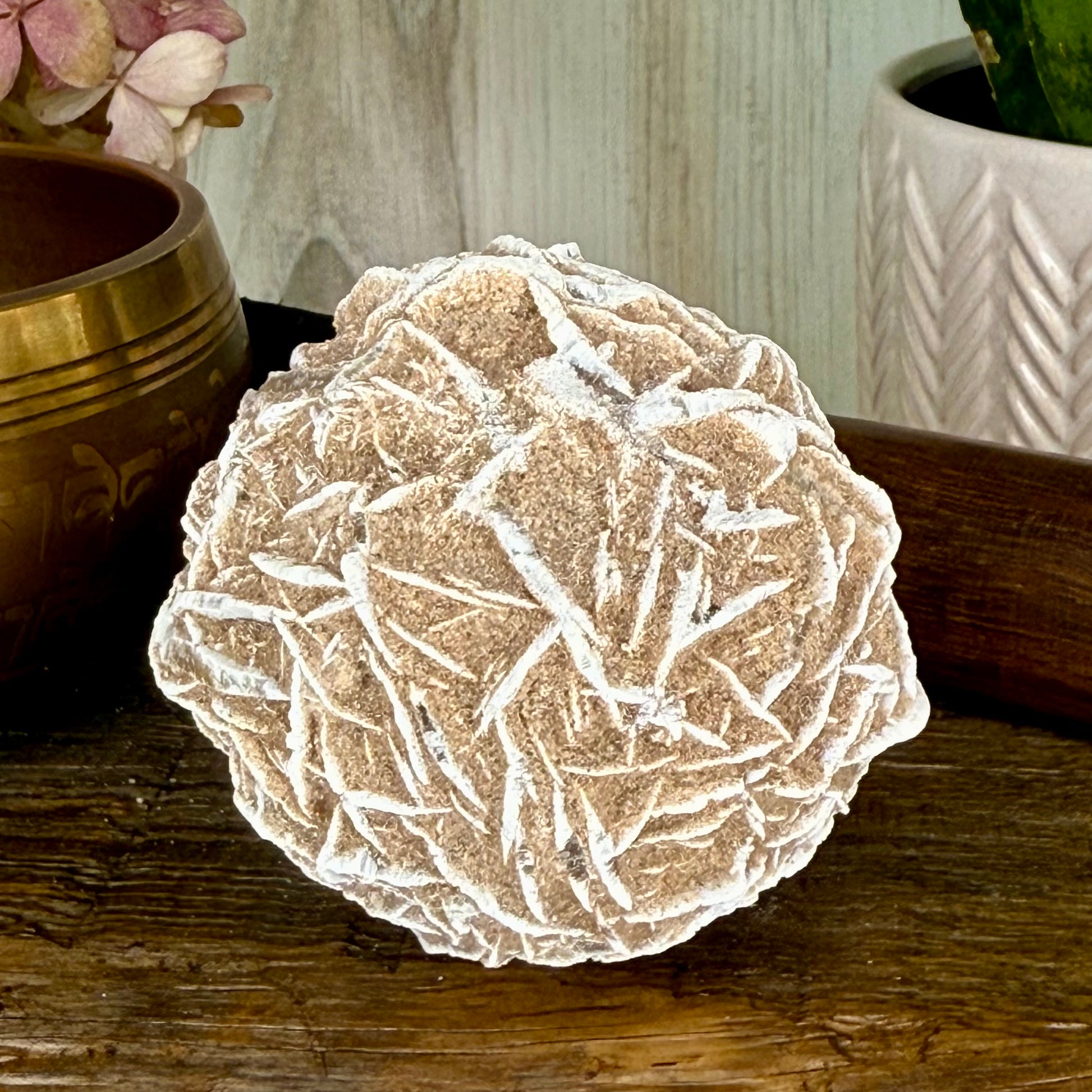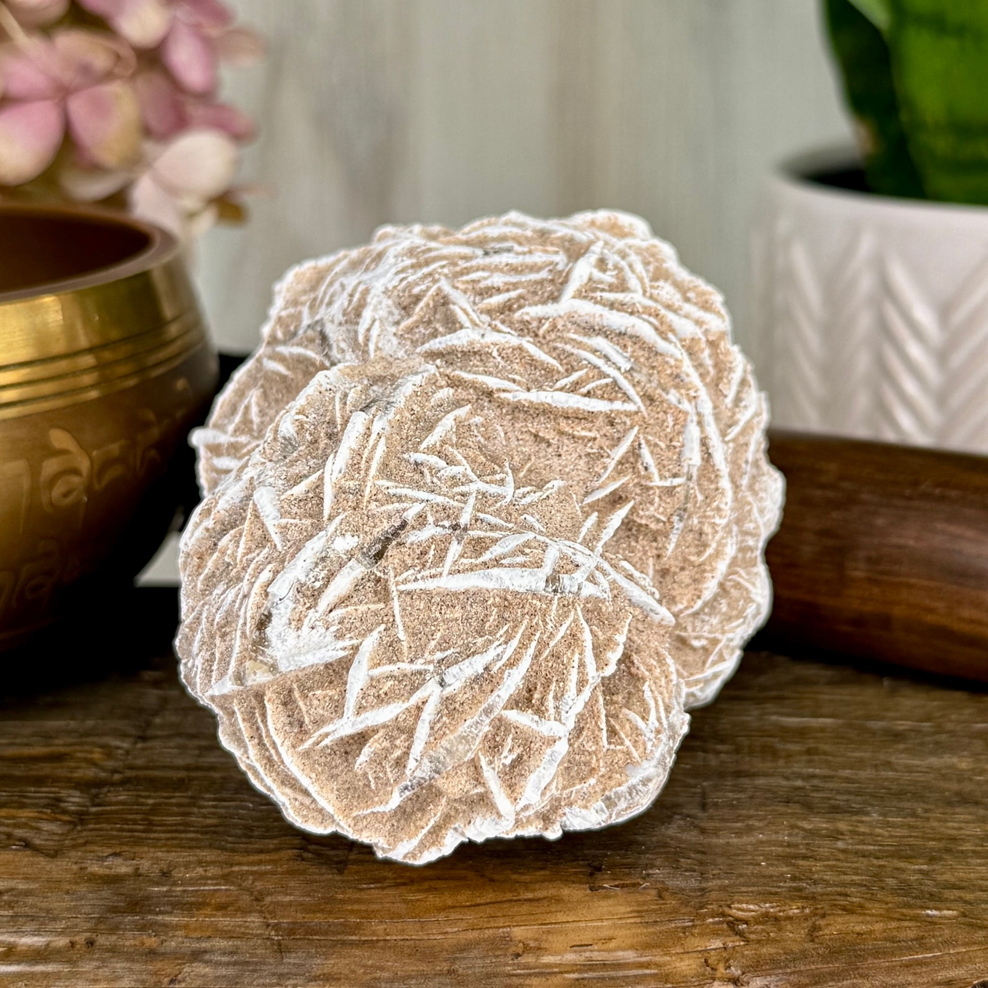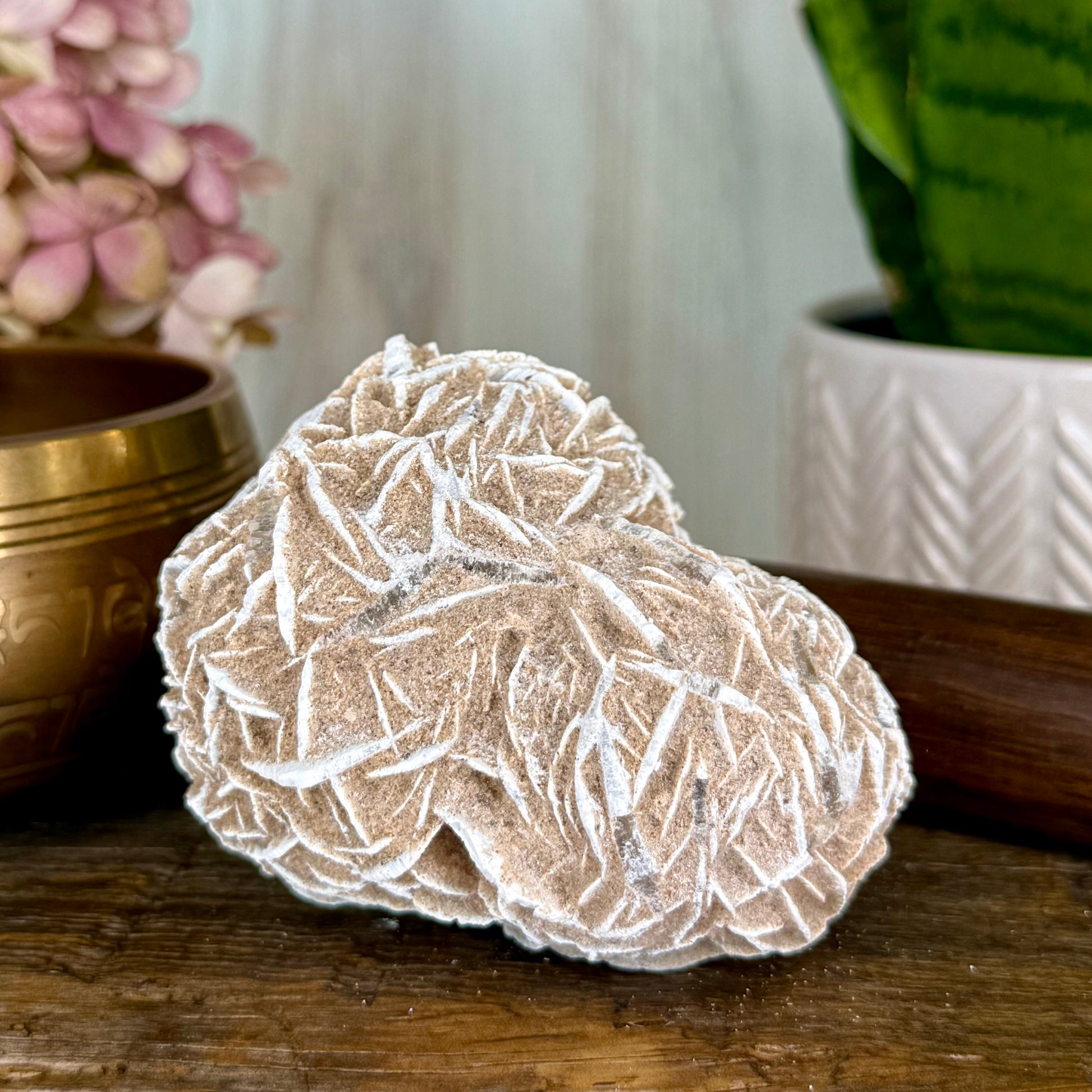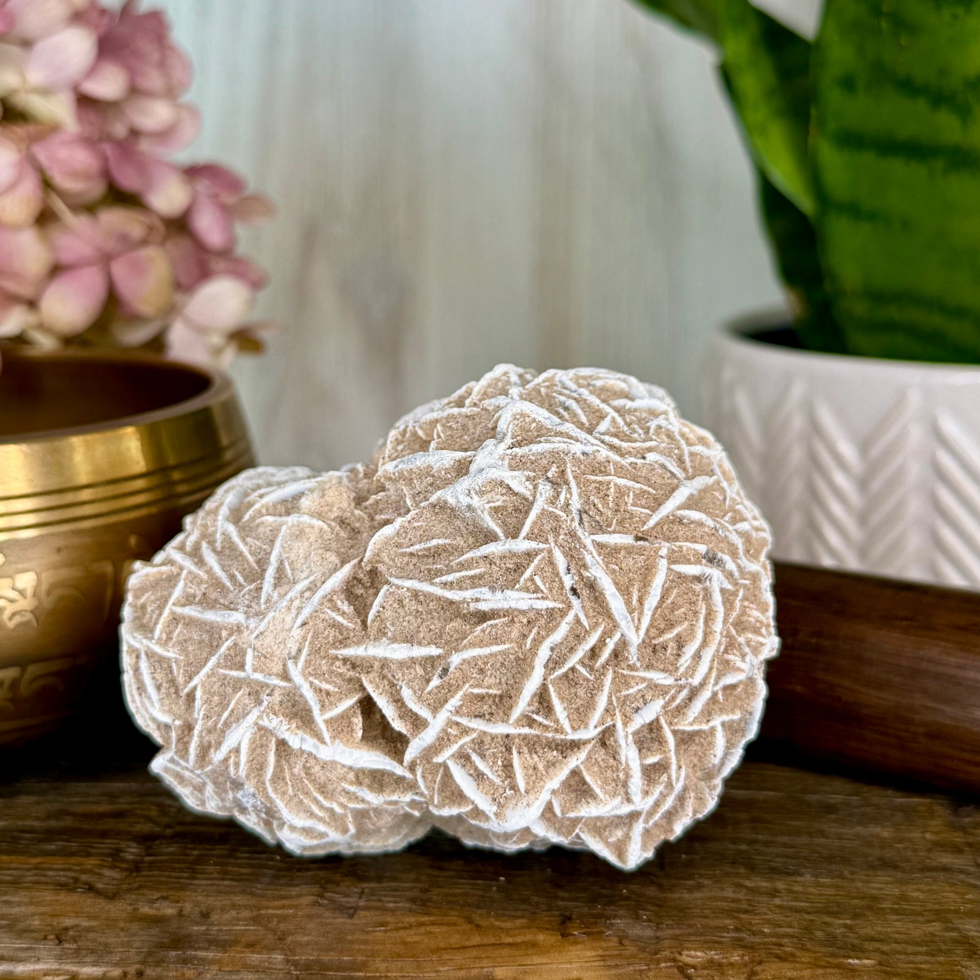 Desert Rose // Composed of various minerals such as gypsum, barite & selenite, boasts a captivating rose-like appearance // Serves as a catalyst for self-love, tranquility, and imaginative inspiration //This remarkable stone embodies wholeness, healing, and prosperity, ushering in new beginnings by aiding in the release of outdated patterns and behaviors // Functioning as a purification and transformational tool // Eliminates negative energies & emotional obstacles, effectively cleansing the auric field & fostering spiritual evolution // Plays a pivotal role in emotional equilibrium, offering solace during stressful periods, fostering forgiveness & nurturing compassion by dissolving feelings of anger, resentment & bitterness // Aligned with the Sacral Chakra, this stone taps into our reservoir of sexual & creative energy, as well as pleasure, enjoyment & sensuality // Stimulates the Crown Chakra, heightening spiritual awareness & facilitating profound spiritual growth.