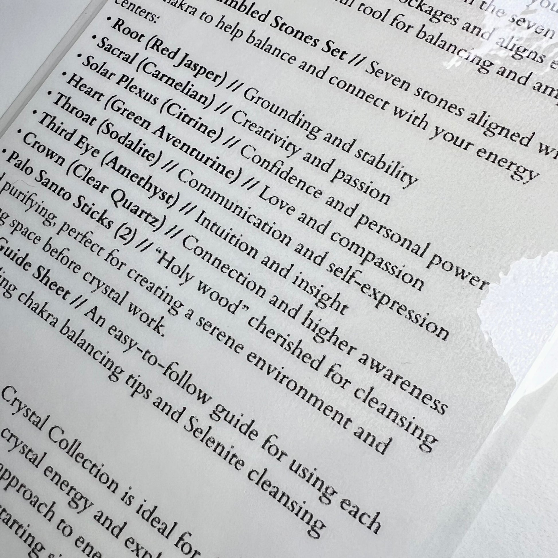 • Basic Guide Sheet // Get started with an easy-to-follow guide on how to use each item in this kit. From chakra balancing techniques to using Selenite for cleansing, this guide provides tips to help you make the most of your new tools.