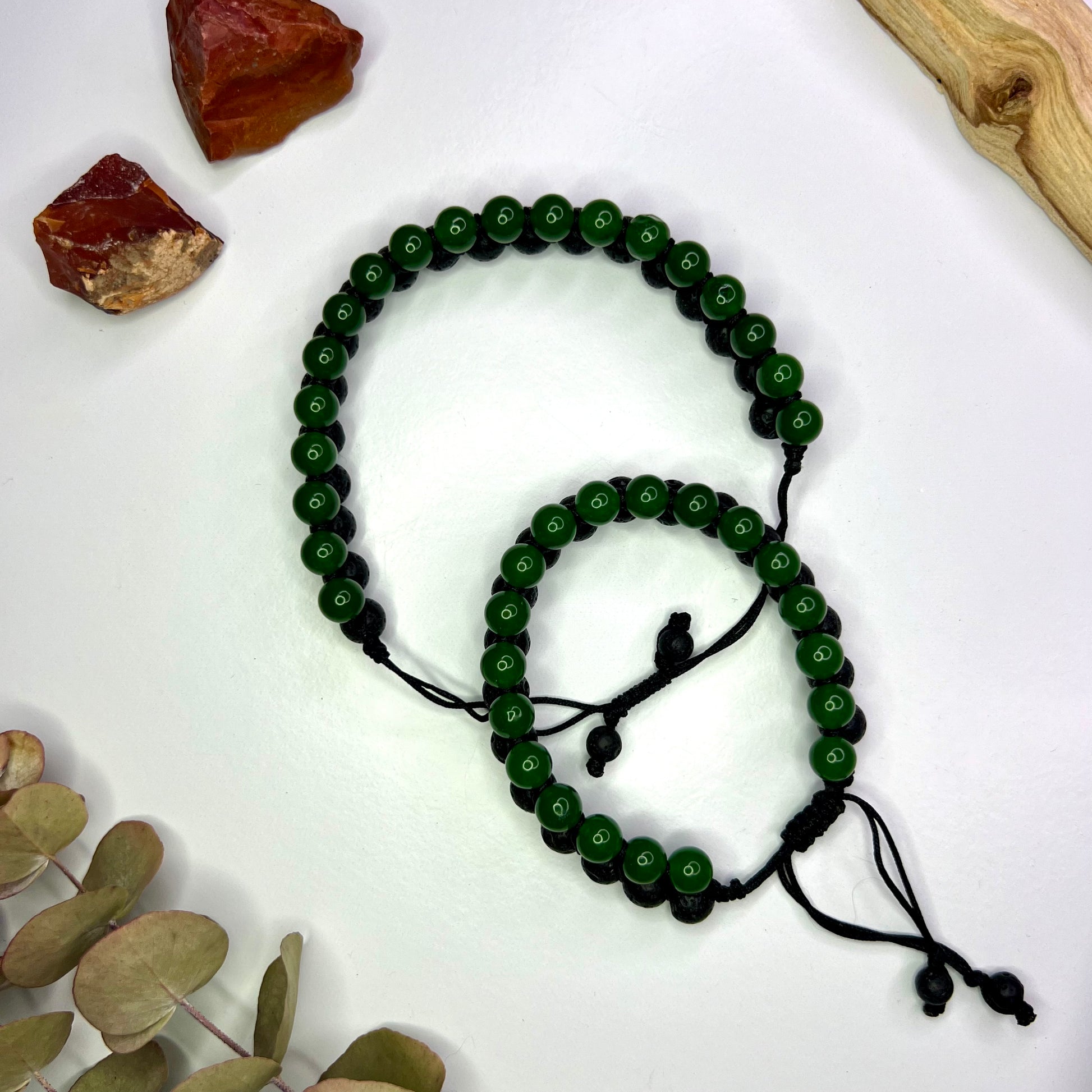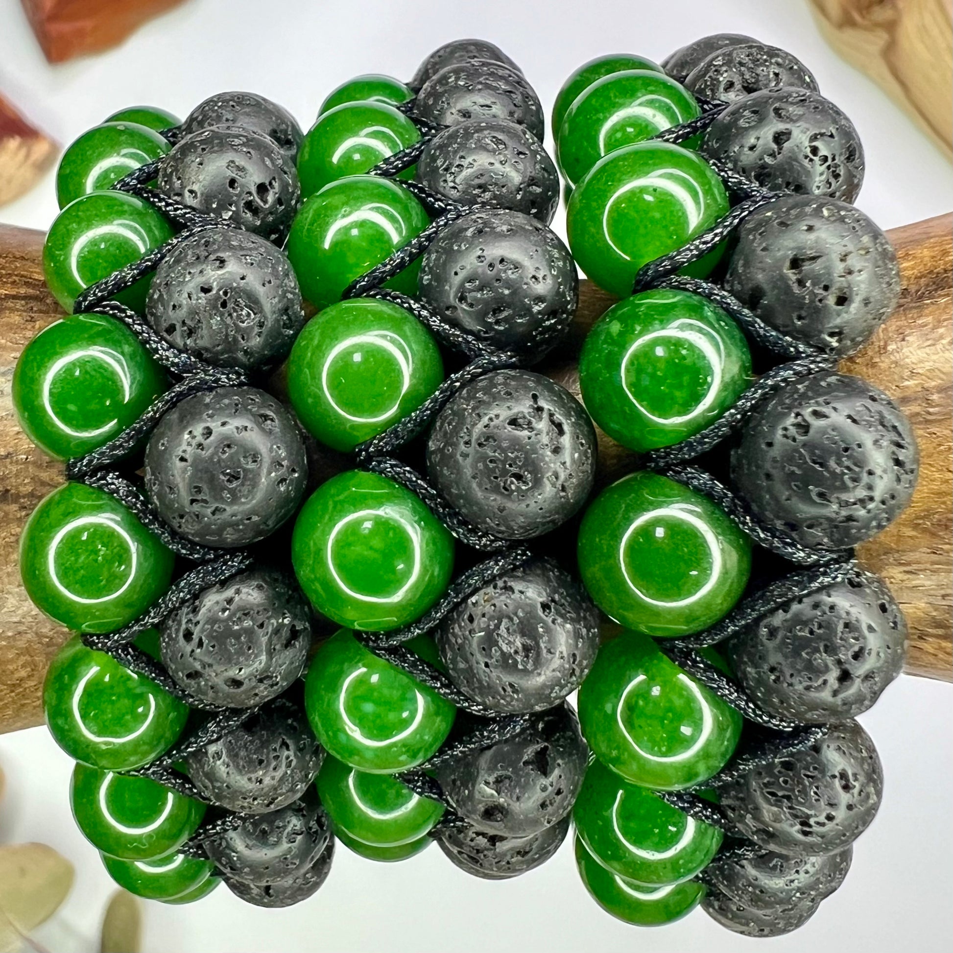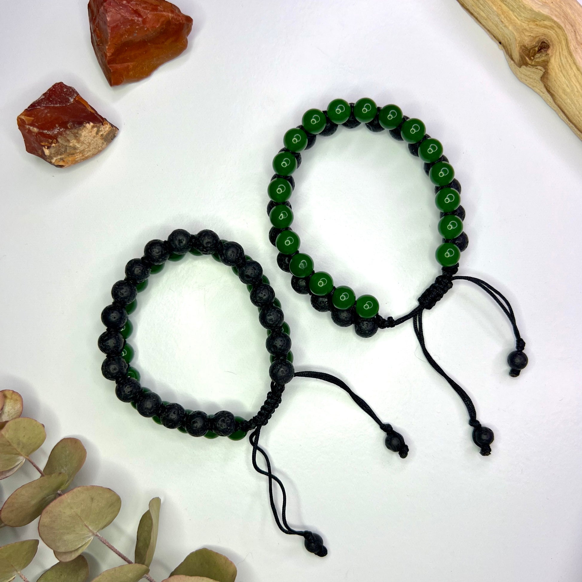 Jade with Lava stone, adjustable bracelet with toggles // Commonly found in China, Myanmar & New Zealand, it is often found near minerals like serpentine & nephrite // Associated with the Heart Chakra, which can help balance emotions, promote love, compassion & emotional healing. By aligning the heart chakra, Jade encourages openness to both giving & receiving love, fostering harmony in relationships & a deeper connection to oneself // A nurturing stone known for bringing peace, emotional healing & balance // Helps release negative thoughts, promoting serenity & well-being, while also attracting good luck & prosperity // Enhances wisdom and insight, aiding decision-making & self-discovery // A powerful protector, warding off negative energy & fostering harmony in relationships // Associated with Taurus, Jade’s grounding energy supports this sign’s focus on stability & patience.