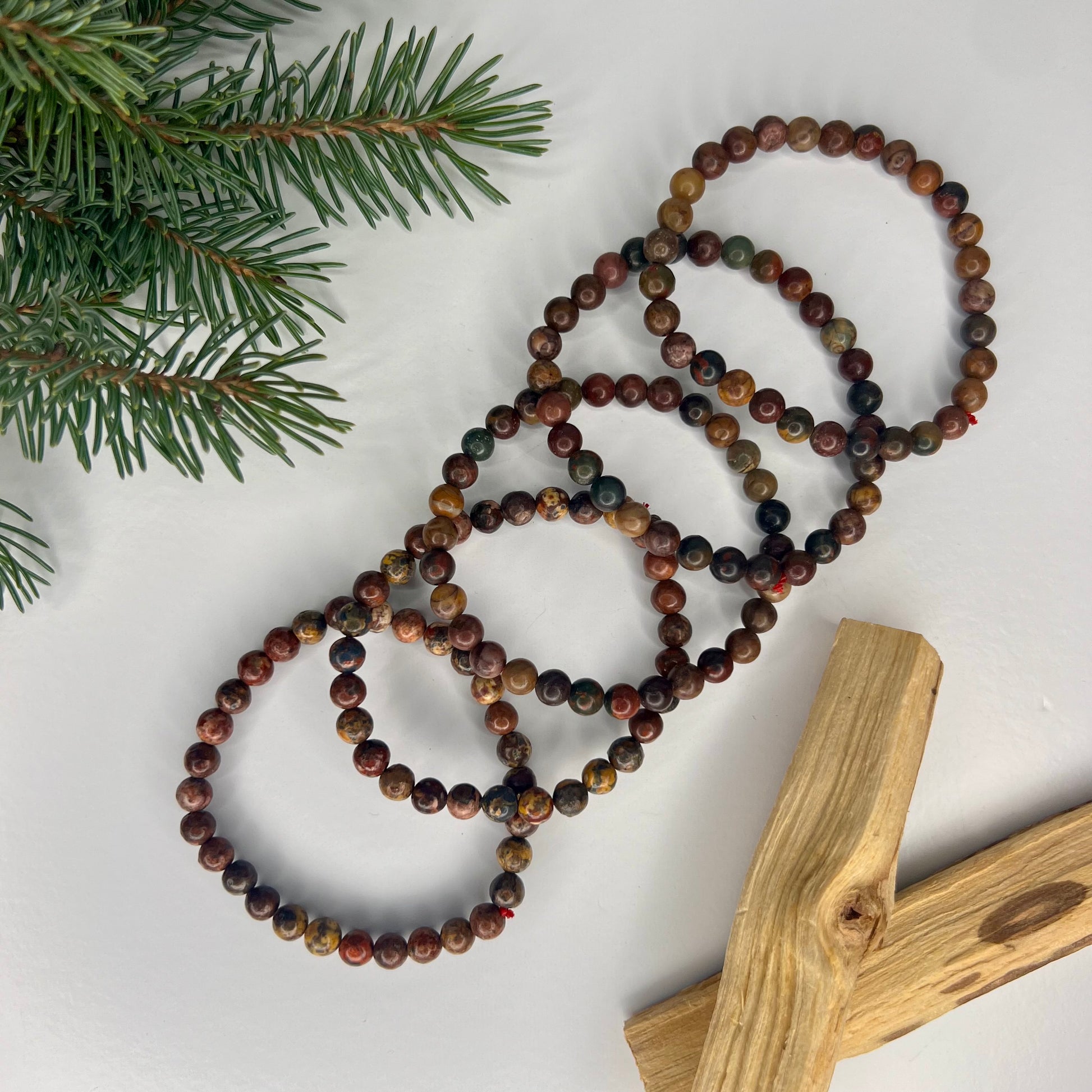 Cherry Creek Jasper, also known as Red Creek Jasper, is a colorful form of jasper discovered in China, known for its intricate patterns and warm tones of red, yellow, olive, and gray // Its unique beauty and balanced energy make it a favorite for grounding, emotional harmony, and inner peace // The stone's soothing presence supports both personal and energetic healing.