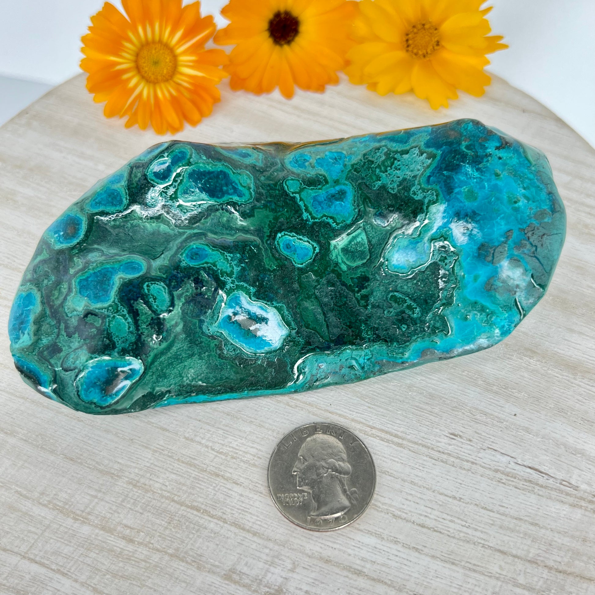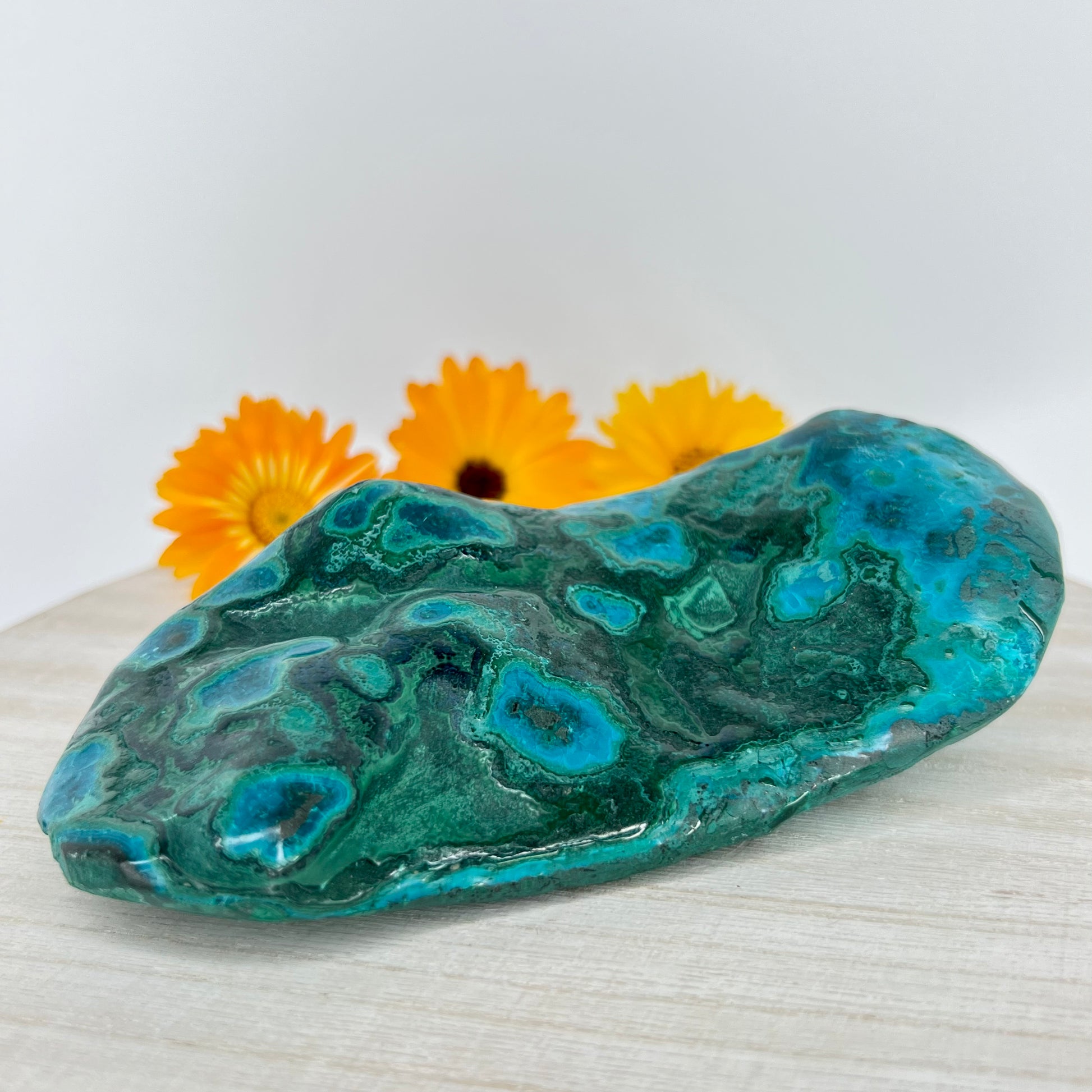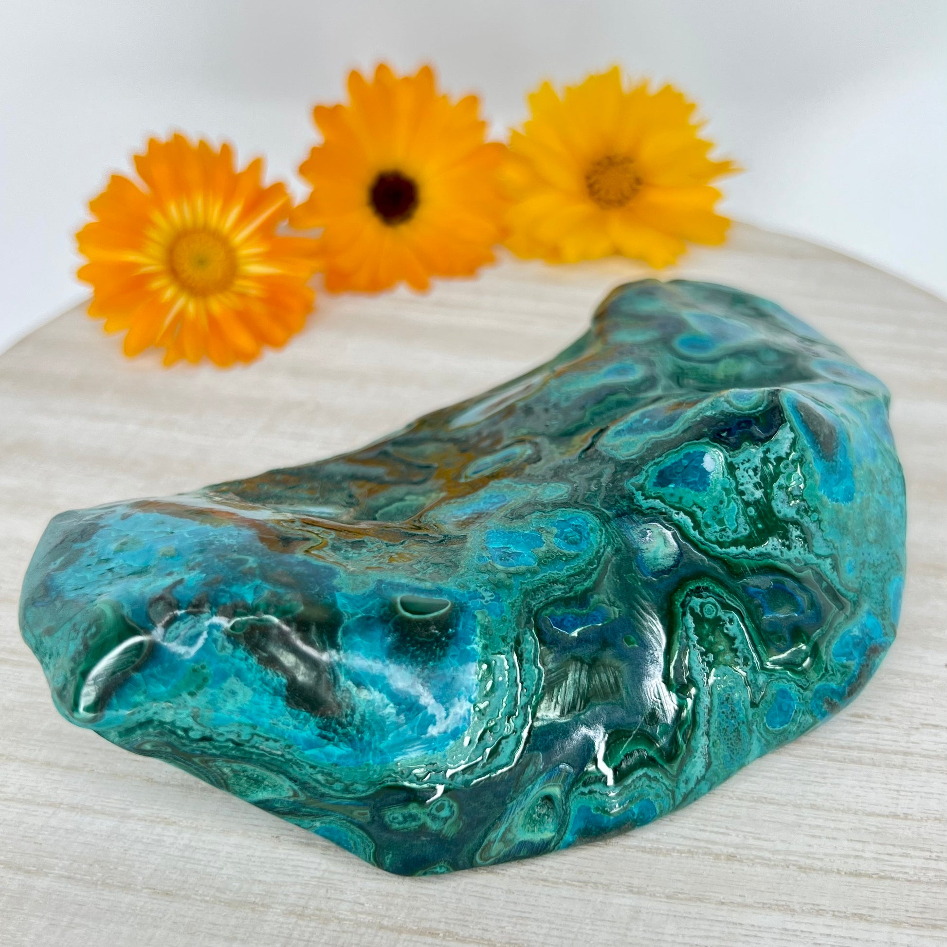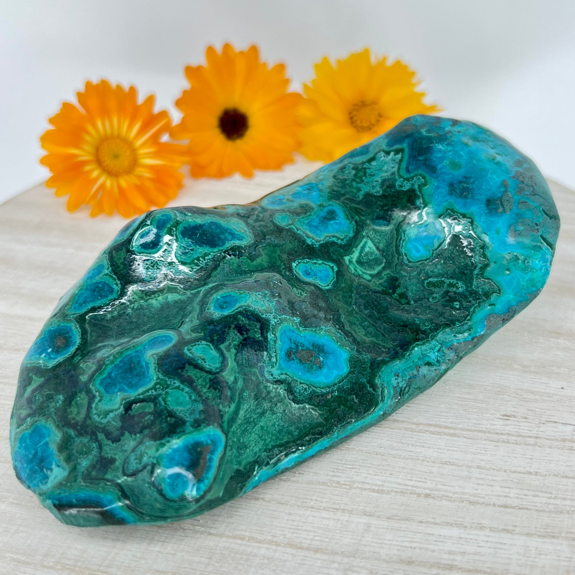 Malacholla combines Malachite & Chrysocolla in one stone, offering a blend of their properties // It's ideal for initiating rebirth, new projects & fresh starts // Aids in managing mood swings, enhancing emotional communication & fostering individualism & self-expression // It promotes self-worth, confidence & compassion while releasing old thoughts that hinder progress // This supportive stone brings calm during times of change or stress, fostering emotional awareness & balance // Harmonizes with the Throat Chakra for heartfelt communication & with the Heart Chakra to align with one's truth.
