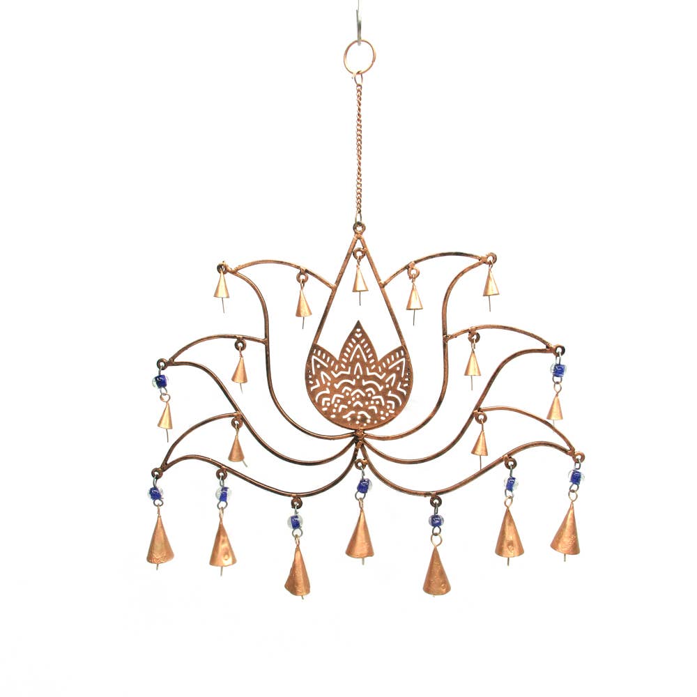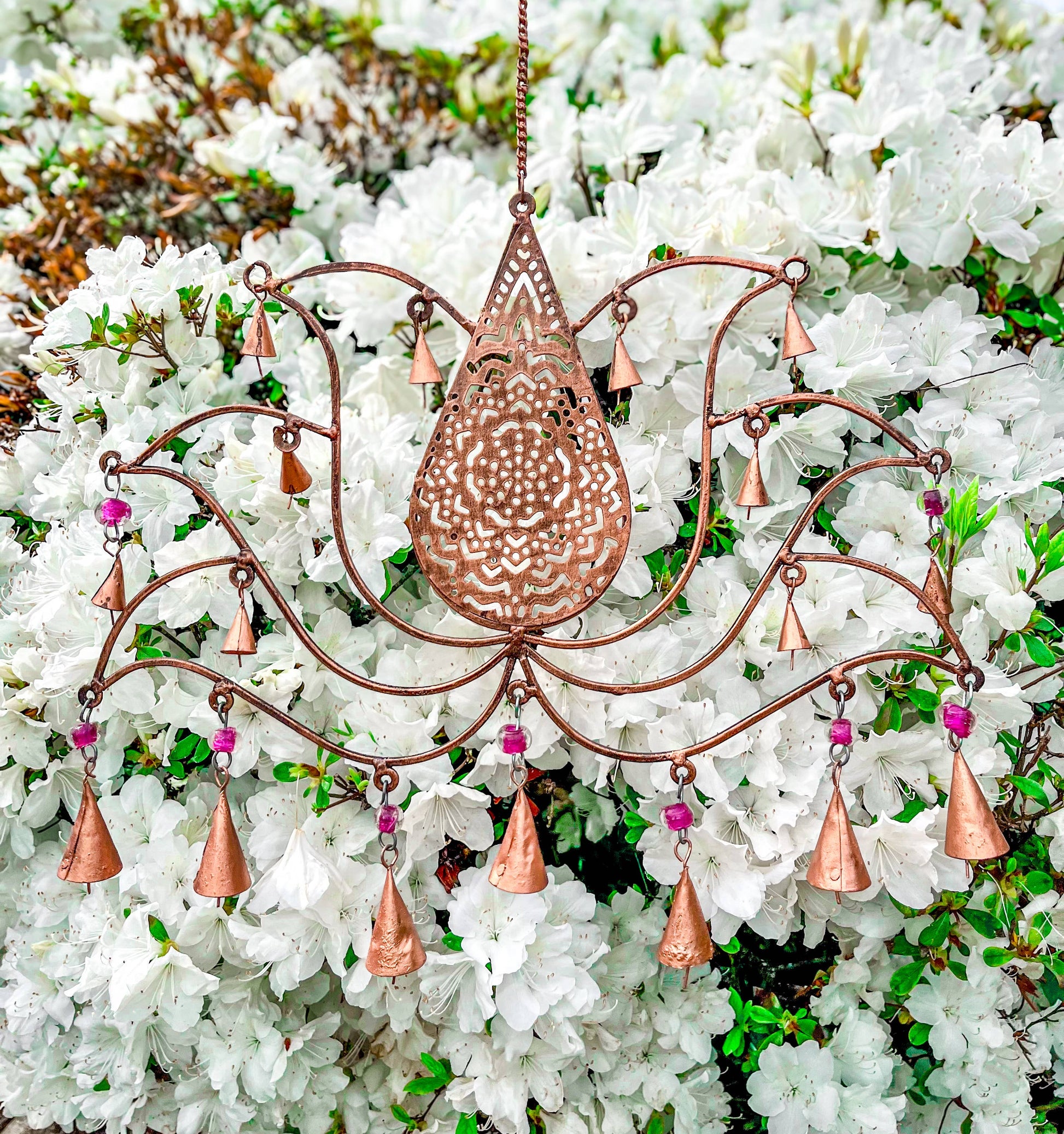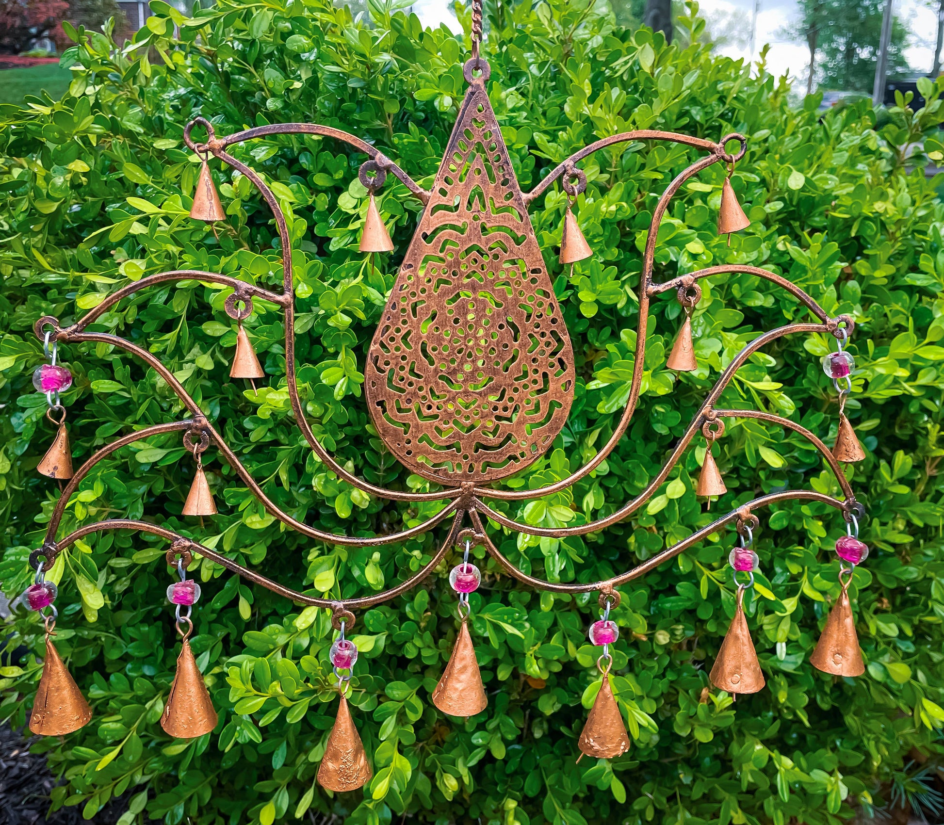 Pink Version // This pink version of the chime features copper-colored metal with beautiful pink beads as accents and a beautiful full mandala cut out in the center main petal. Metal chimes are made from flat sheets/pieces of scrap metal and created by using basic hand tools and machinery. Metal work is a craft practiced in Behat in the northern state of Uttar Pradesh, India. Made from reused metal Soldered together for strength and durability.