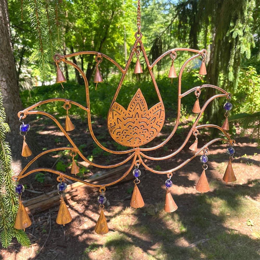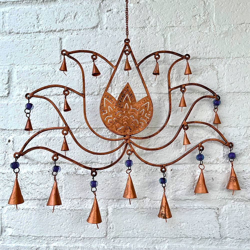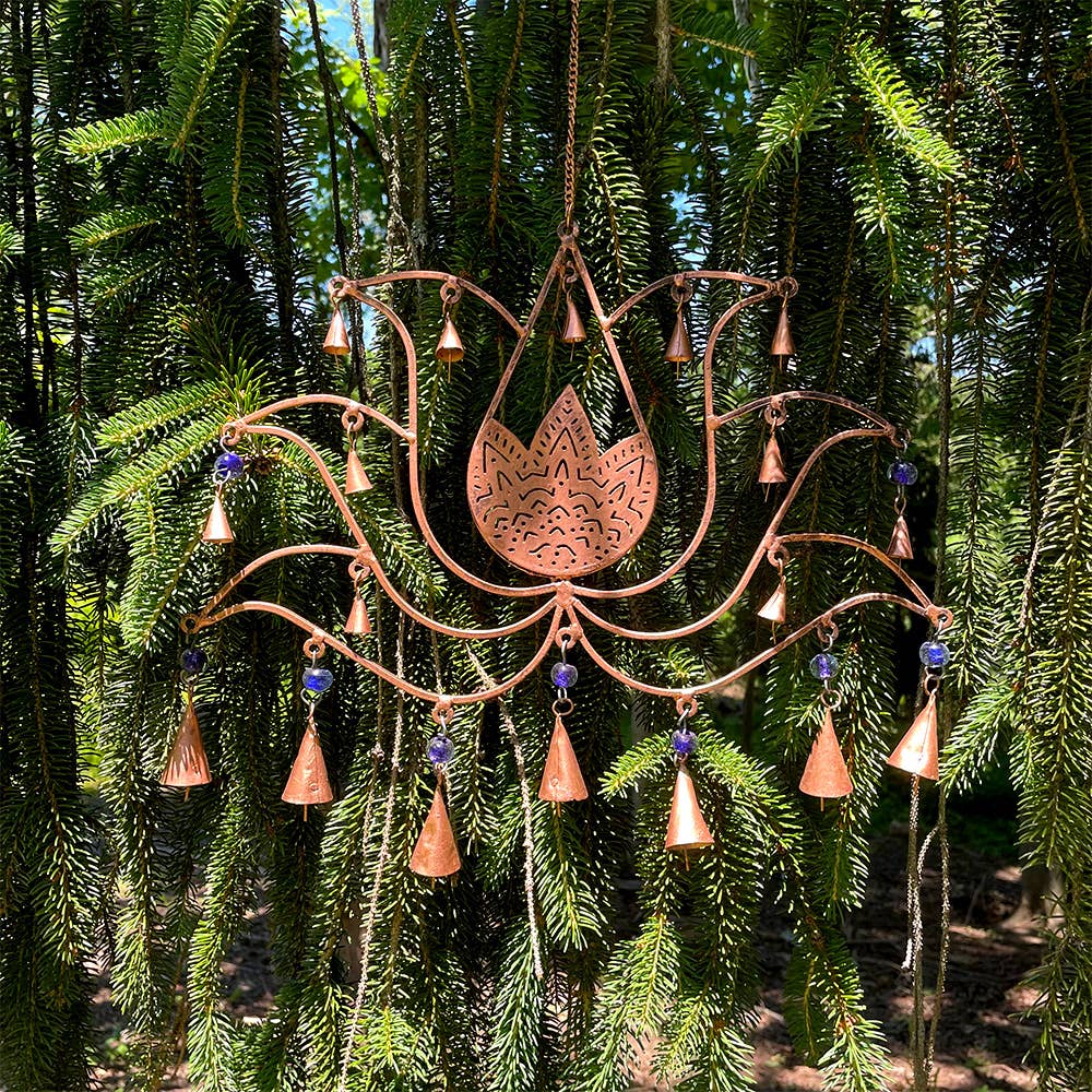 Pink Version // This pink version of the chime features copper-colored metal with beautiful pink beads as accents and a beautiful full mandala cut out in the center main petal. Metal chimes are made from flat sheets/pieces of scrap metal and created by using basic hand tools and machinery. Metal work is a craft practiced in Behat in the northern state of Uttar Pradesh, India. Made from reused metal Soldered together for strength and durability.