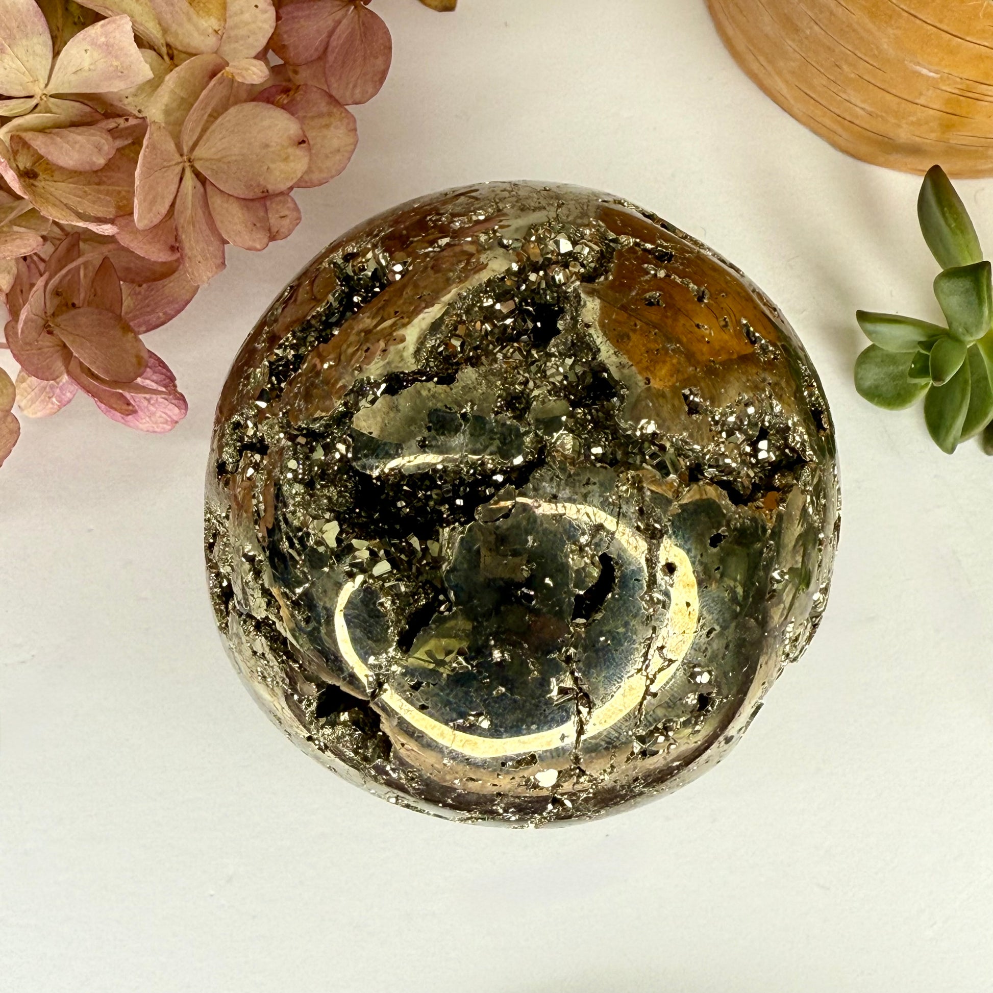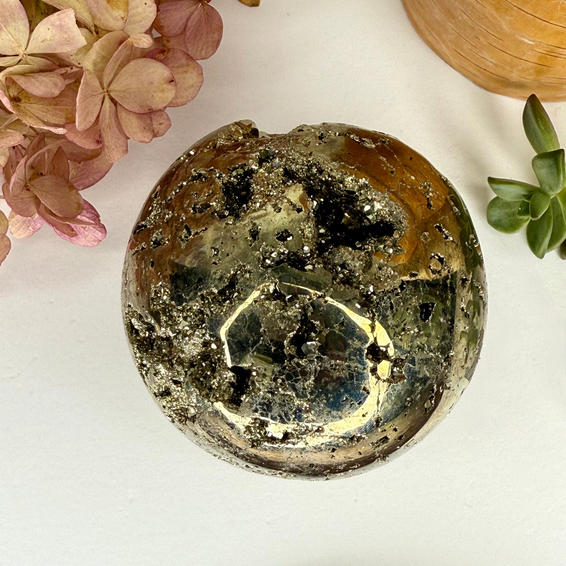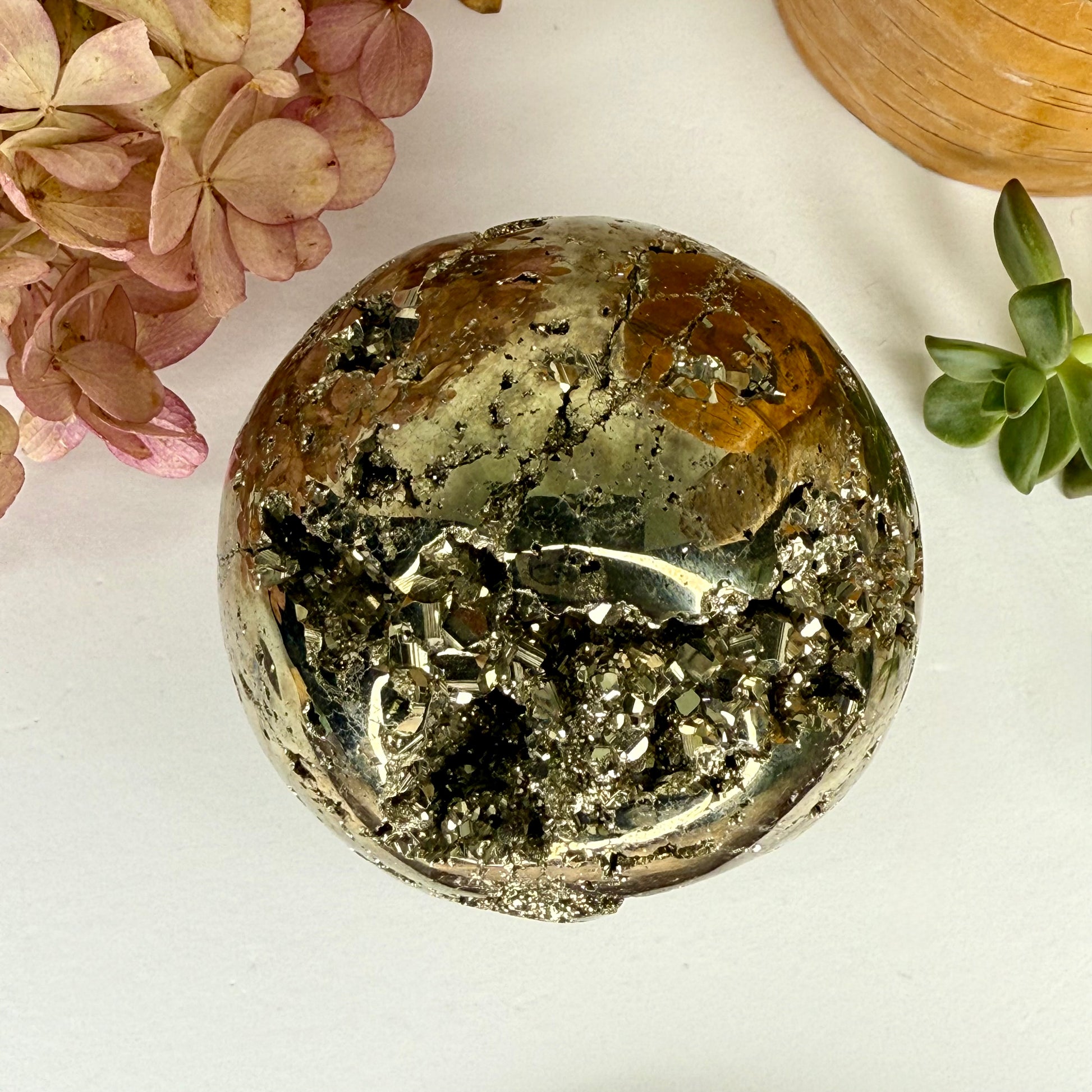 A stone of protection, determination, and focused manifestation // Pyrite shields the aura, strengthens boundaries, and helps remove negative influences or self-sabotaging patterns // Encourages a mindset rooted in confidence, resilience, and optimism, especially useful when setting goals or launching a new business or project // Known to promote follow-through, it keeps you aligned with your intentions and supports steady progress until your goals are realized.