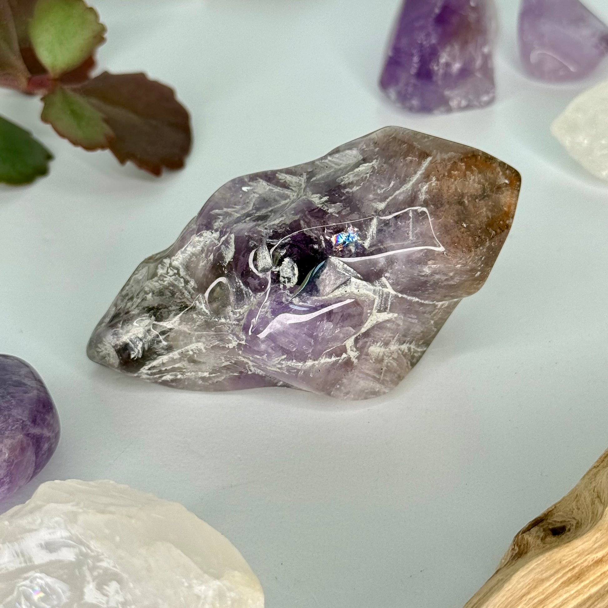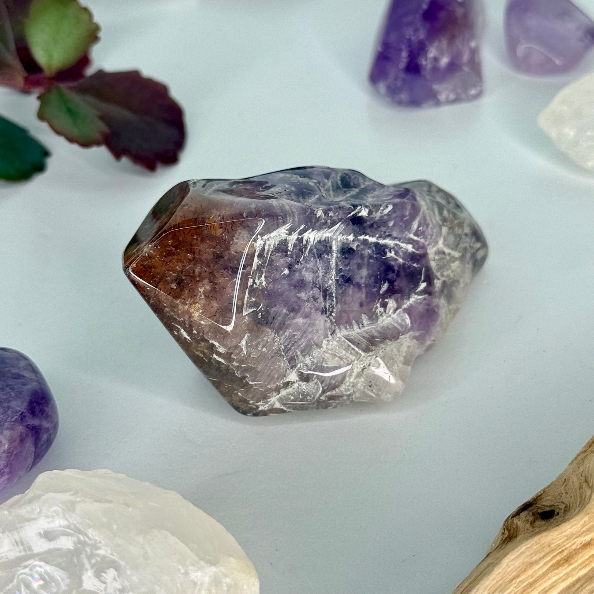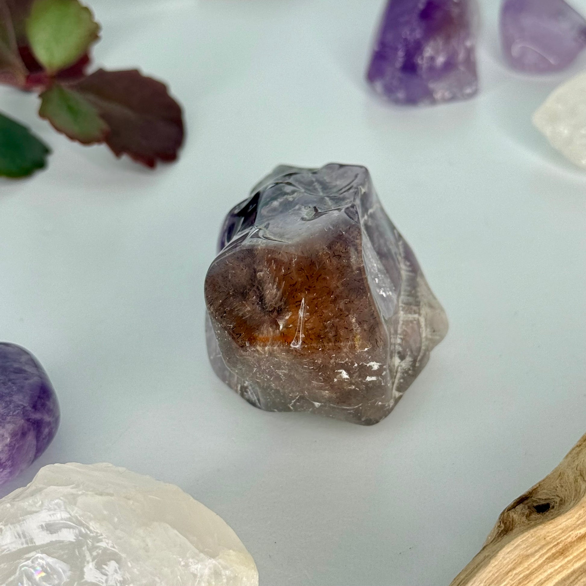 A stone of protection, spiritual activation, and grounded awareness // Red Cap Amethyst helps anchor your energy during spiritual work, allowing for deeper insight without losing your connection to the body or the Earth // Encourages the healthy flow of energy through the body and aura, helping to move blockages and strengthen overall vitality // Its healing frequency supports balance during transformation and can be especially beneficial during emotional integration or shadow work.