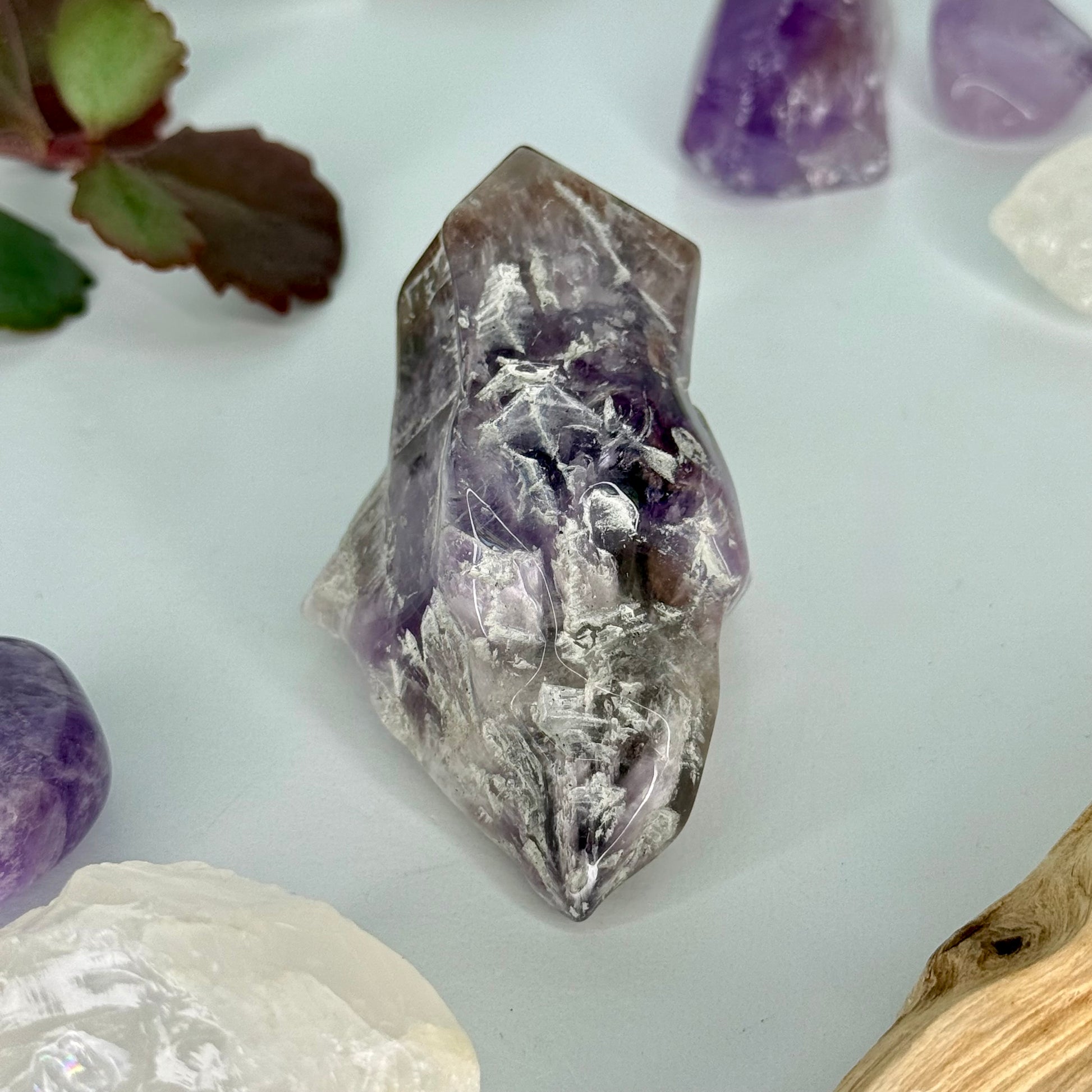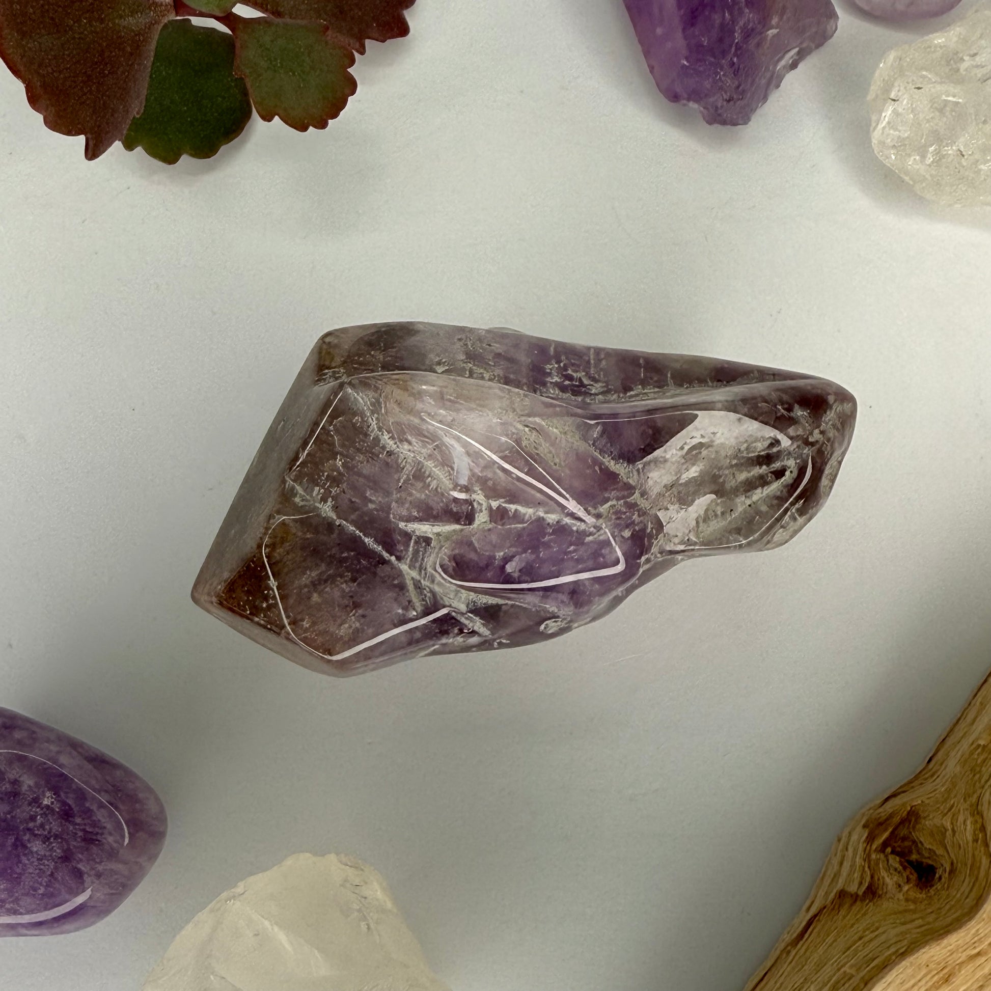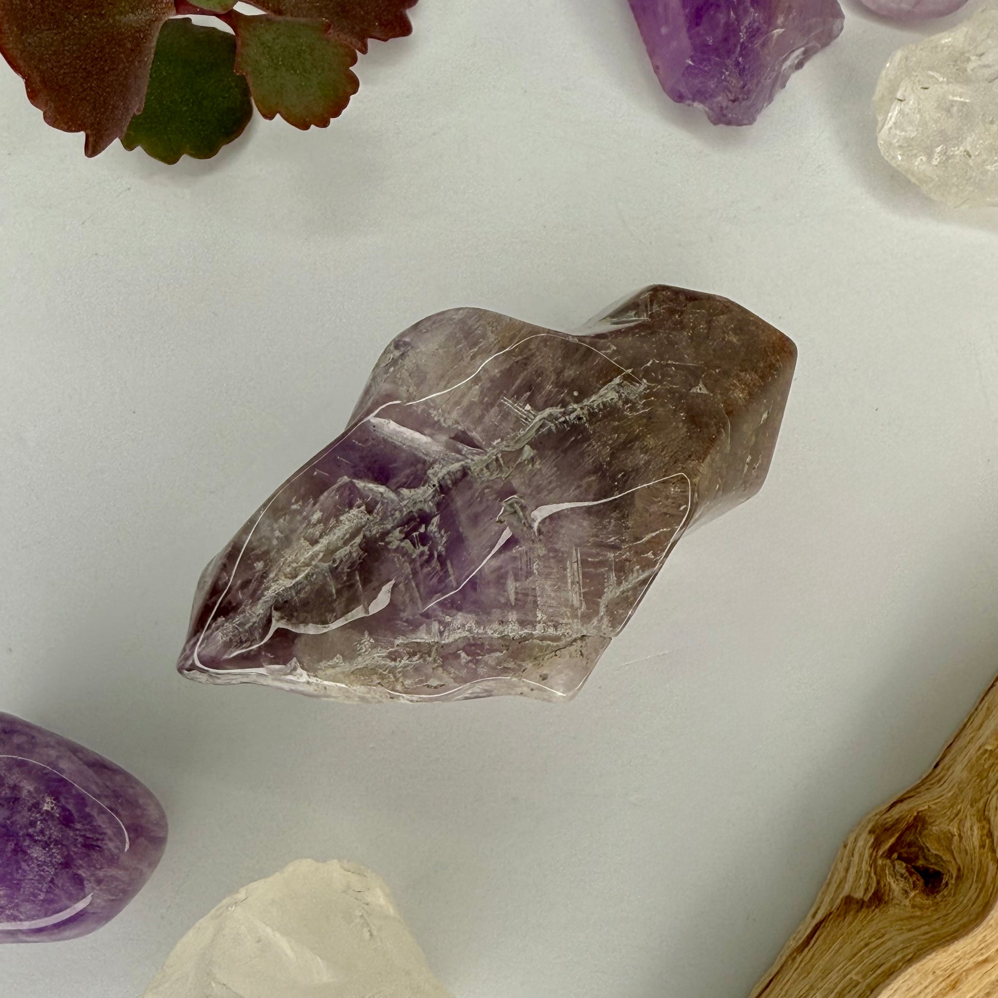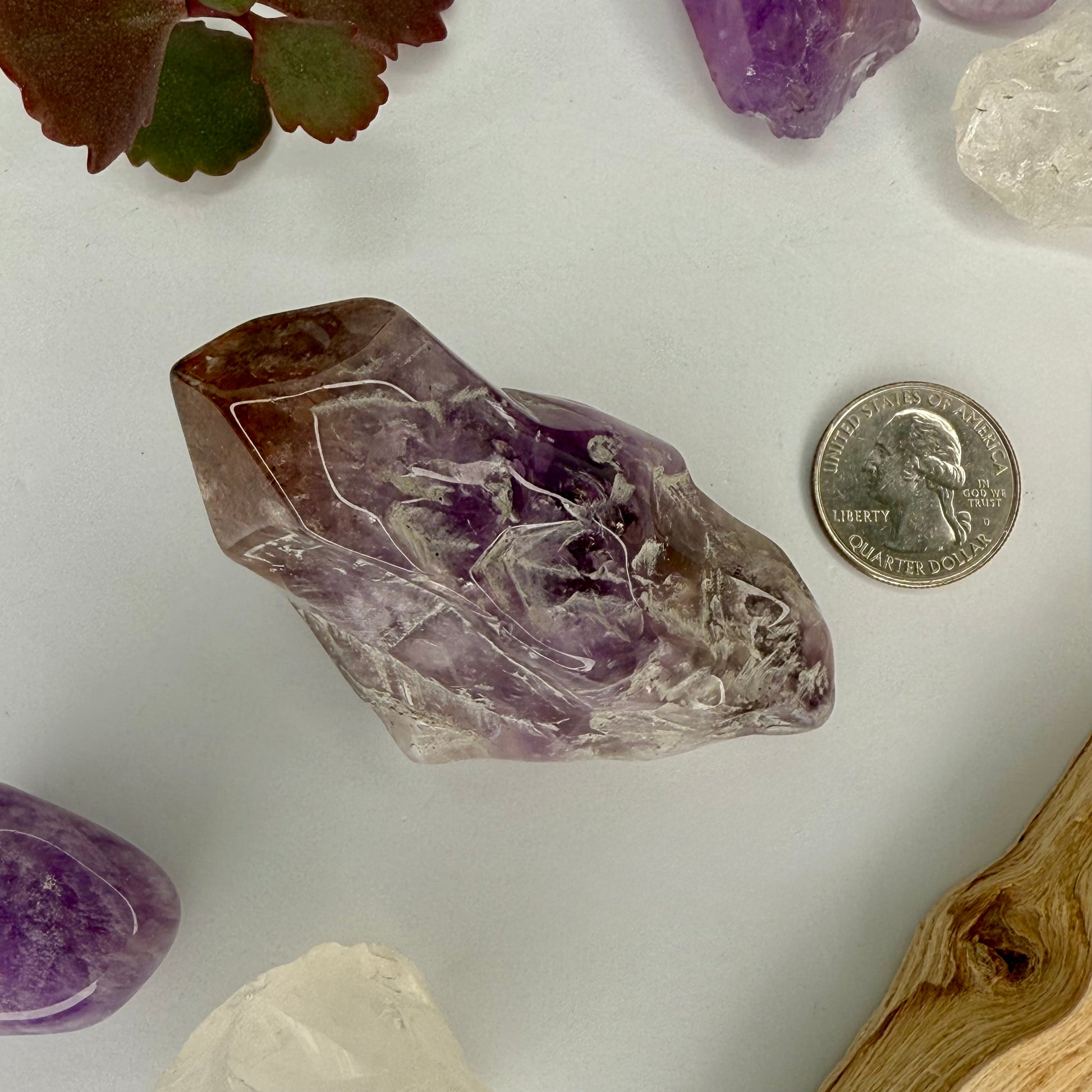 A stone of protection, spiritual activation, and grounded awareness // Red Cap Amethyst helps anchor your energy during spiritual work, allowing for deeper insight without losing your connection to the body or the Earth // Encourages the healthy flow of energy through the body and aura, helping to move blockages and strengthen overall vitality // Its healing frequency supports balance during transformation and can be especially beneficial during emotional integration or shadow work.