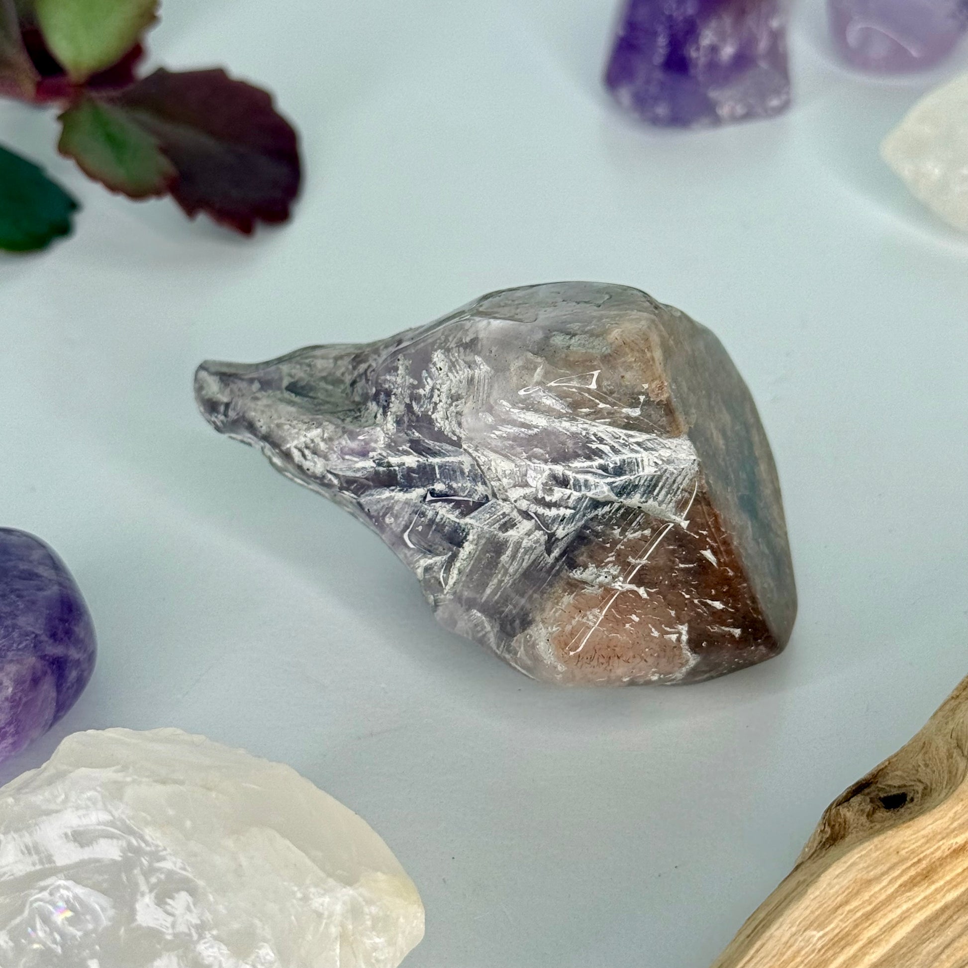 A stone of protection, spiritual activation, and grounded awareness // Red Cap Amethyst helps anchor your energy during spiritual work, allowing for deeper insight without losing your connection to the body or the Earth // Encourages the healthy flow of energy through the body and aura, helping to move blockages and strengthen overall vitality // Its healing frequency supports balance during transformation and can be especially beneficial during emotional integration or shadow work.