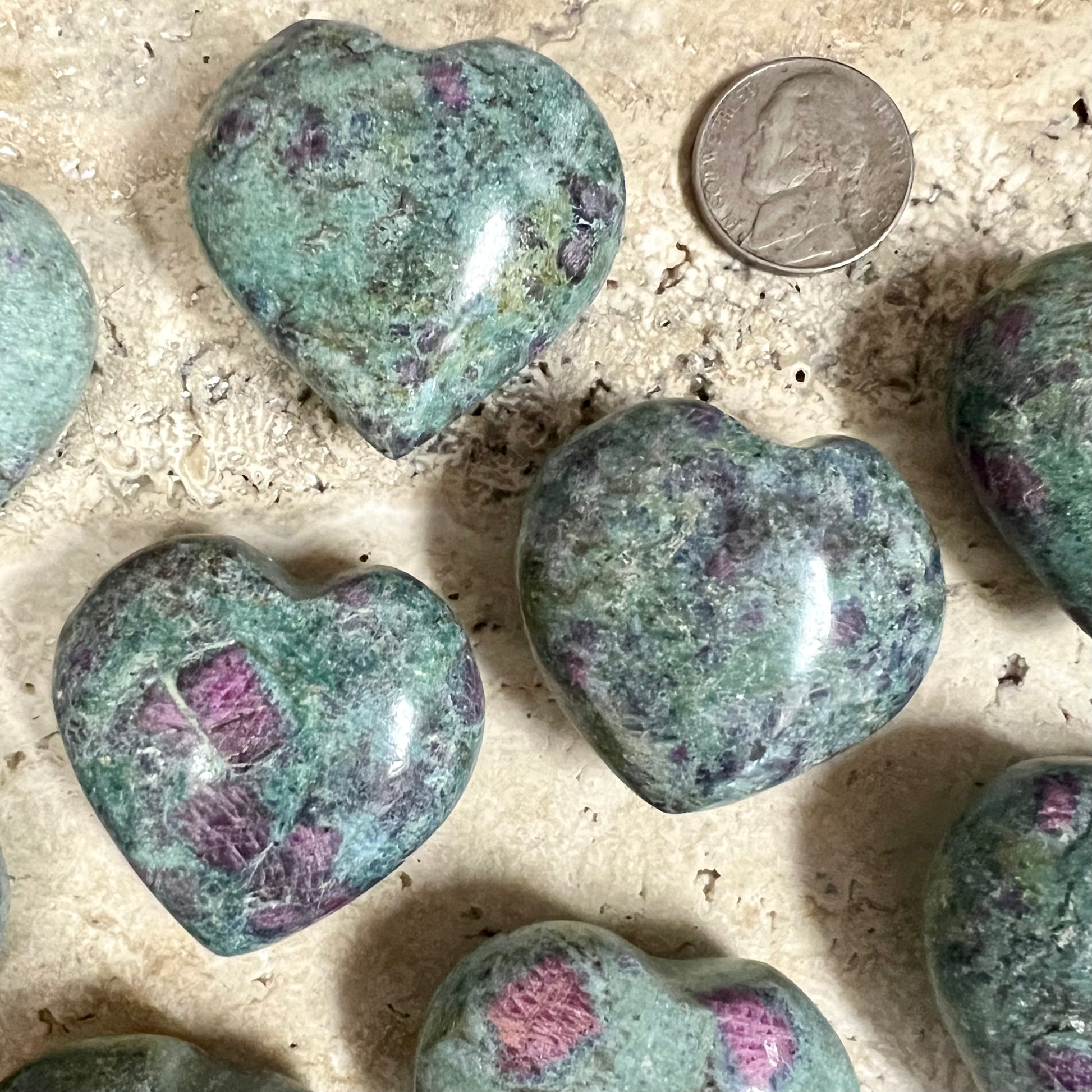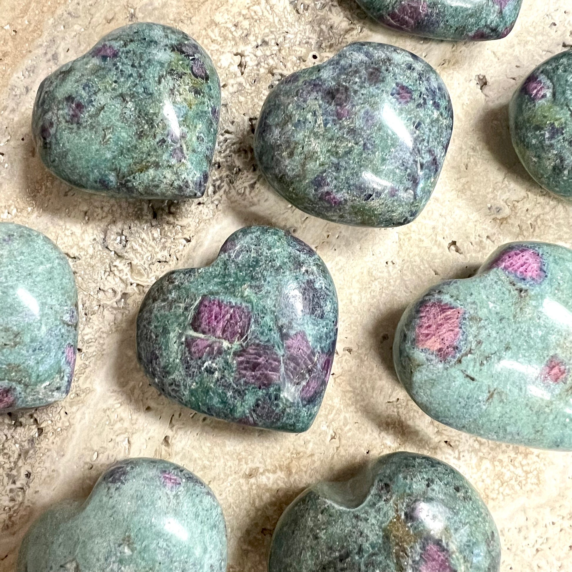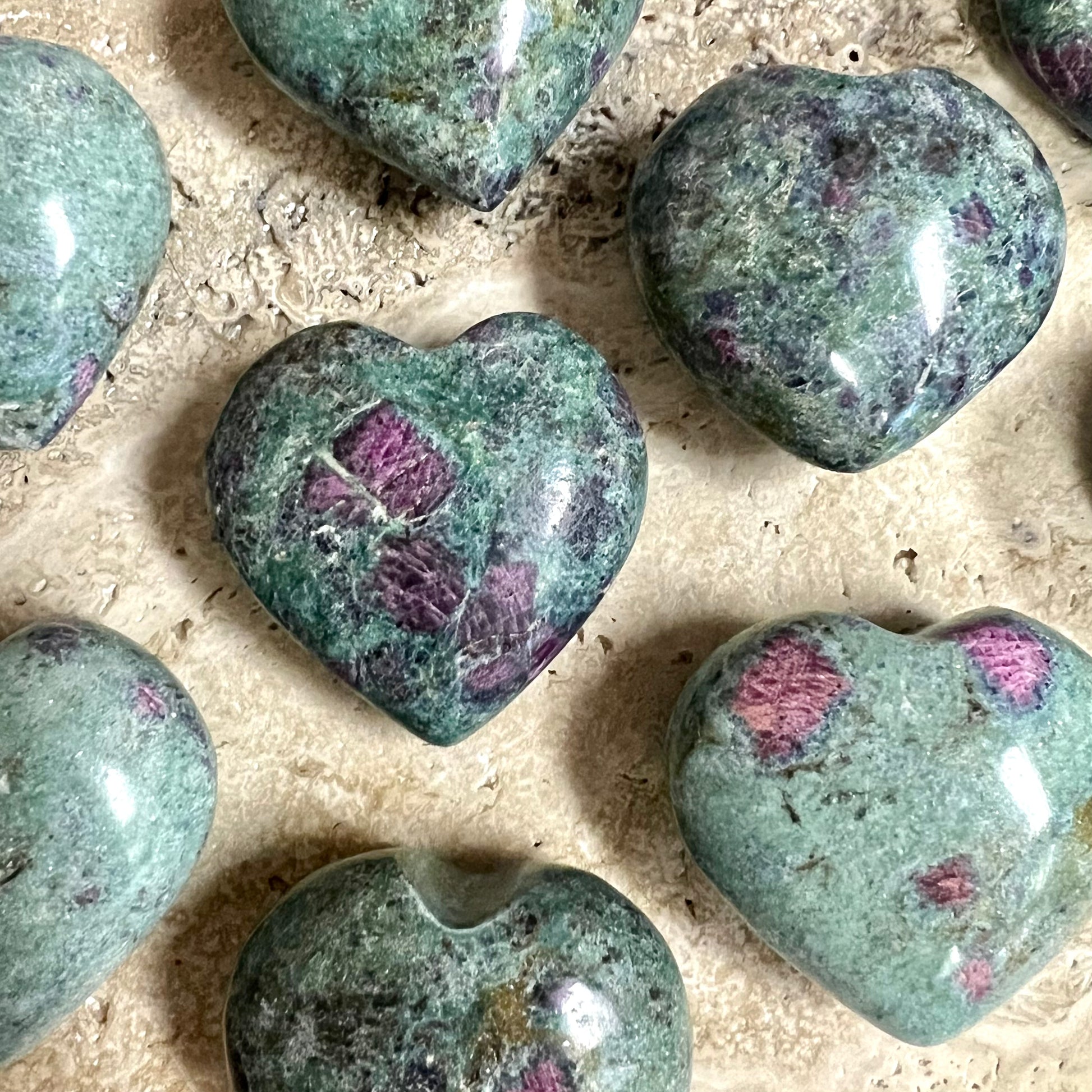 Ruby Fuchsite // A blend of Green Fuchsite & Ruby // Brings together the courage of Ruby with the soothing energy of Fuchsite // It taps into the Earth's vitality, refreshing our spirit with its vibrant vibrations // When we hold this stone, we reconnect with the Earth, grounding ourselves while embracing a heart that is healing & growing stronger // With its roots in the Root Chakra, Ruby fosters courage, strength & protection, anchoring us firmly to the present moment // Its presence in the Heart Chakra encourages us to embody our highest virtues & embrace selfless love // Fuchsite complements this journey by infusing our being with love & compassionate energy, offering a gentle yet powerful healing touch to body & soul // Together, Ruby Fuchsite harmonizes our energies, nurturing our growth and guiding us towards a more balanced & fulfilling existence.