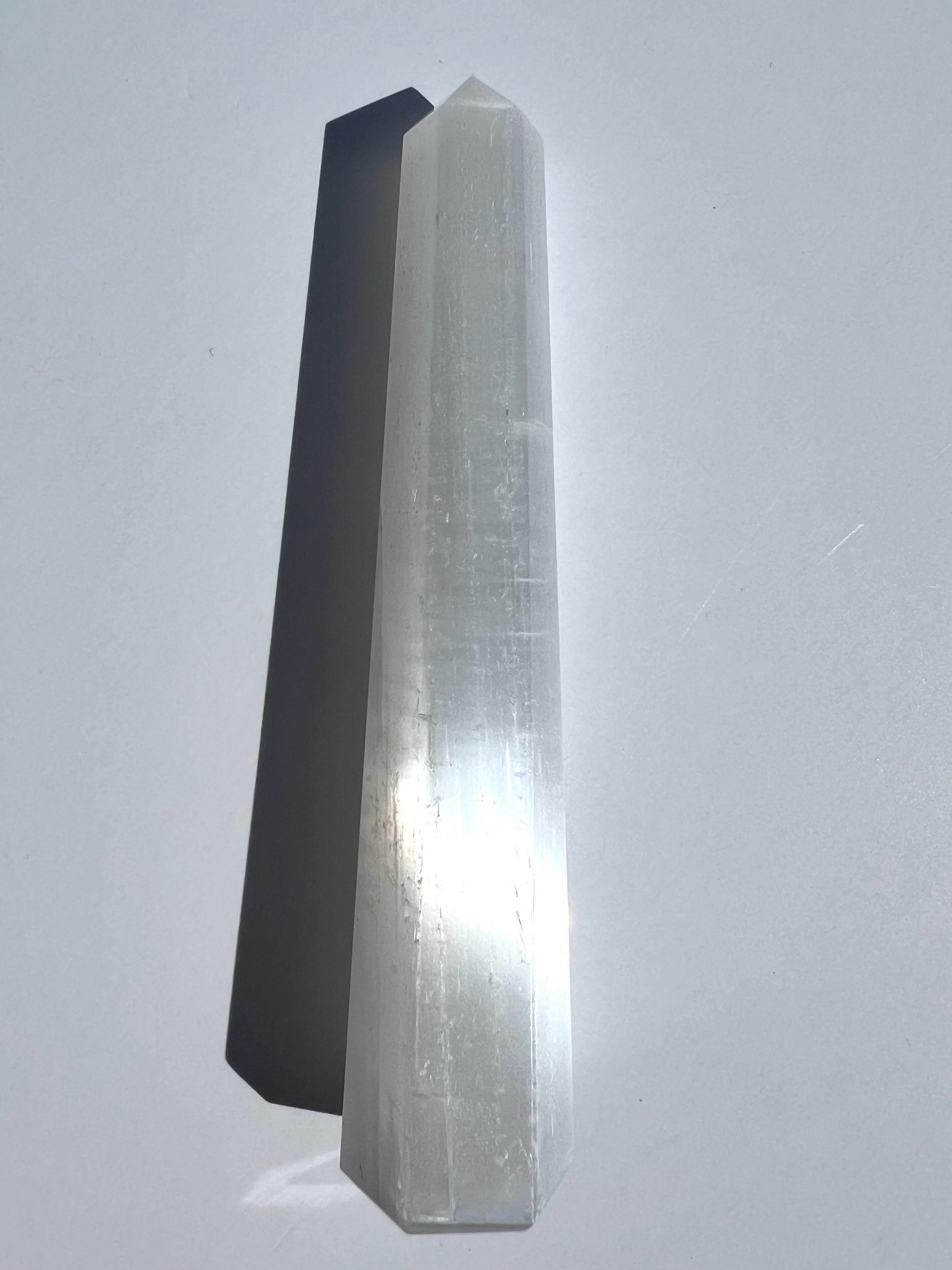 Selenite is a form of gypsum crystal, known for its translucent, silky sheen and powerful energetic clarity // Most commonly found in Morocco, Mexico, and the United States, Selenite forms in desert environments and often occurs near other evaporative minerals like halite and barite // Its name comes from the Greek word for “moon,” reflecting its luminous, high-frequency vibration.