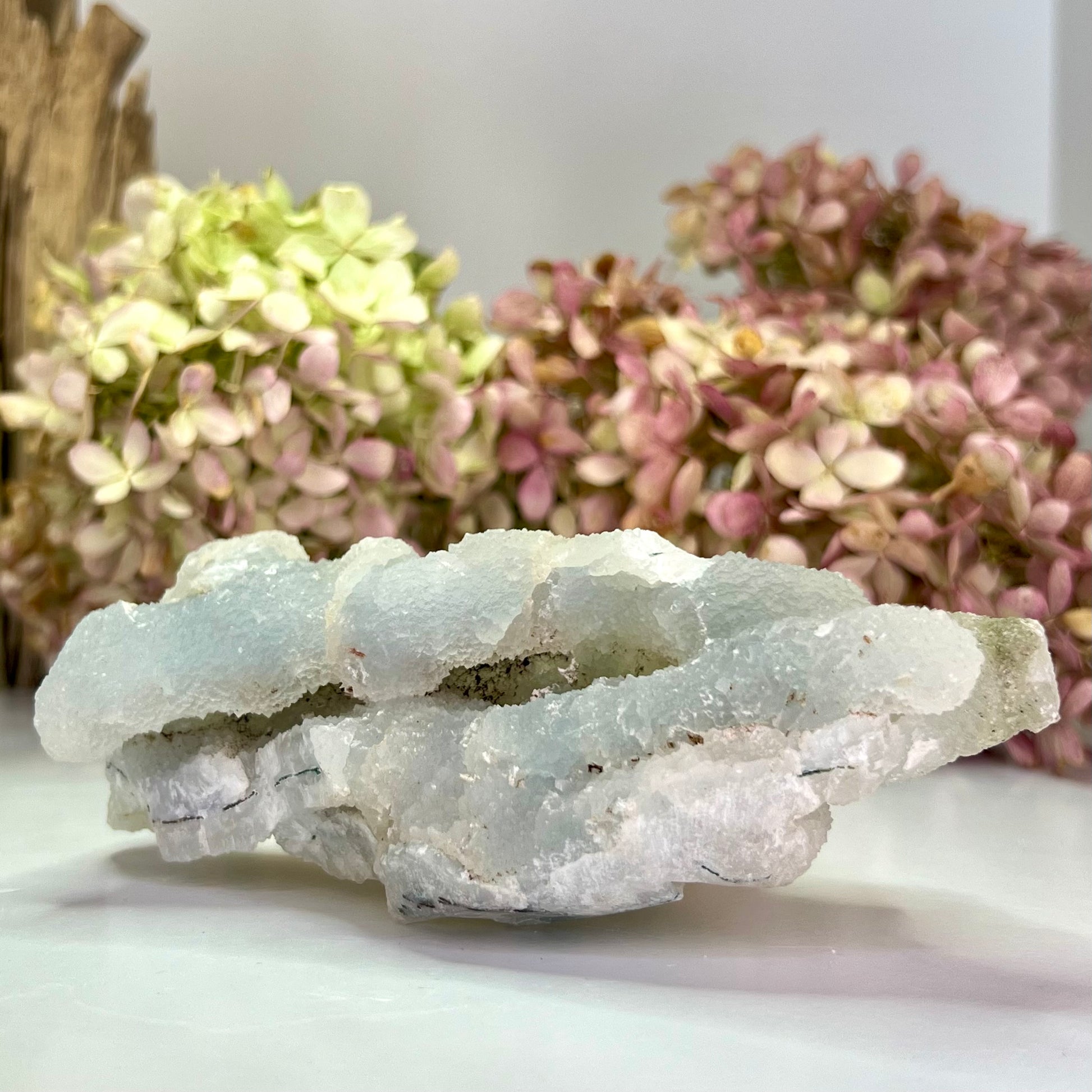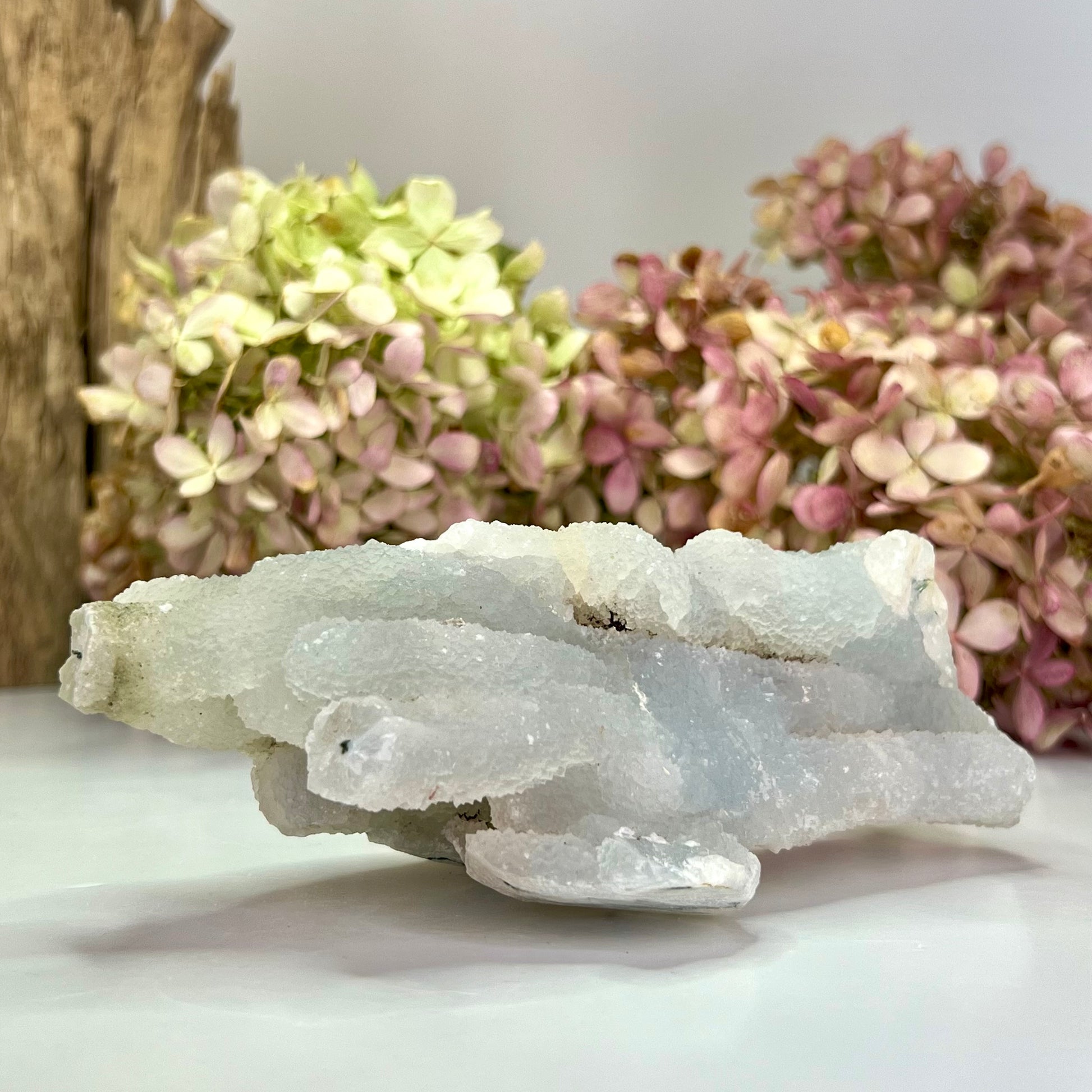 White Spirit Quartz, also known as Cactus Quartz // A silicon dioxide crystal with a unique stalactite formation, featuring a central crystal surrounded by smaller, sparkling points // Typically found in South Africa, it often forms alongside Amethyst and Clear Quartz.