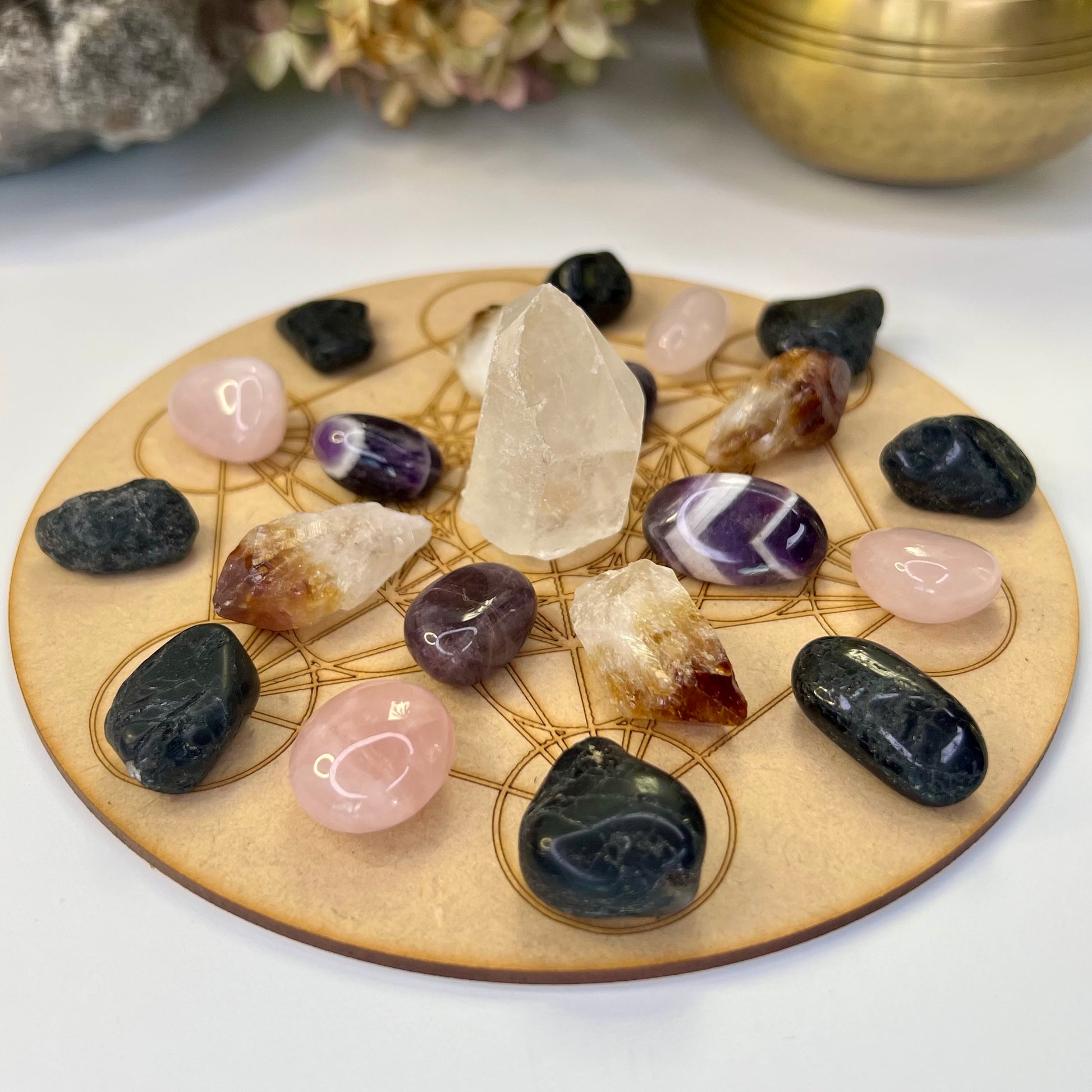 Synergy and Intentions // Each stone within this set has been carefully chosen to support and amplify different aspects of your intentions, creating a balanced and dynamic energy field. As you arrange these stones in the grid, their unique energies combine, working together to reinforce your desired outcomes—whether they’re centered on abundance, love, spiritual growth or protection.