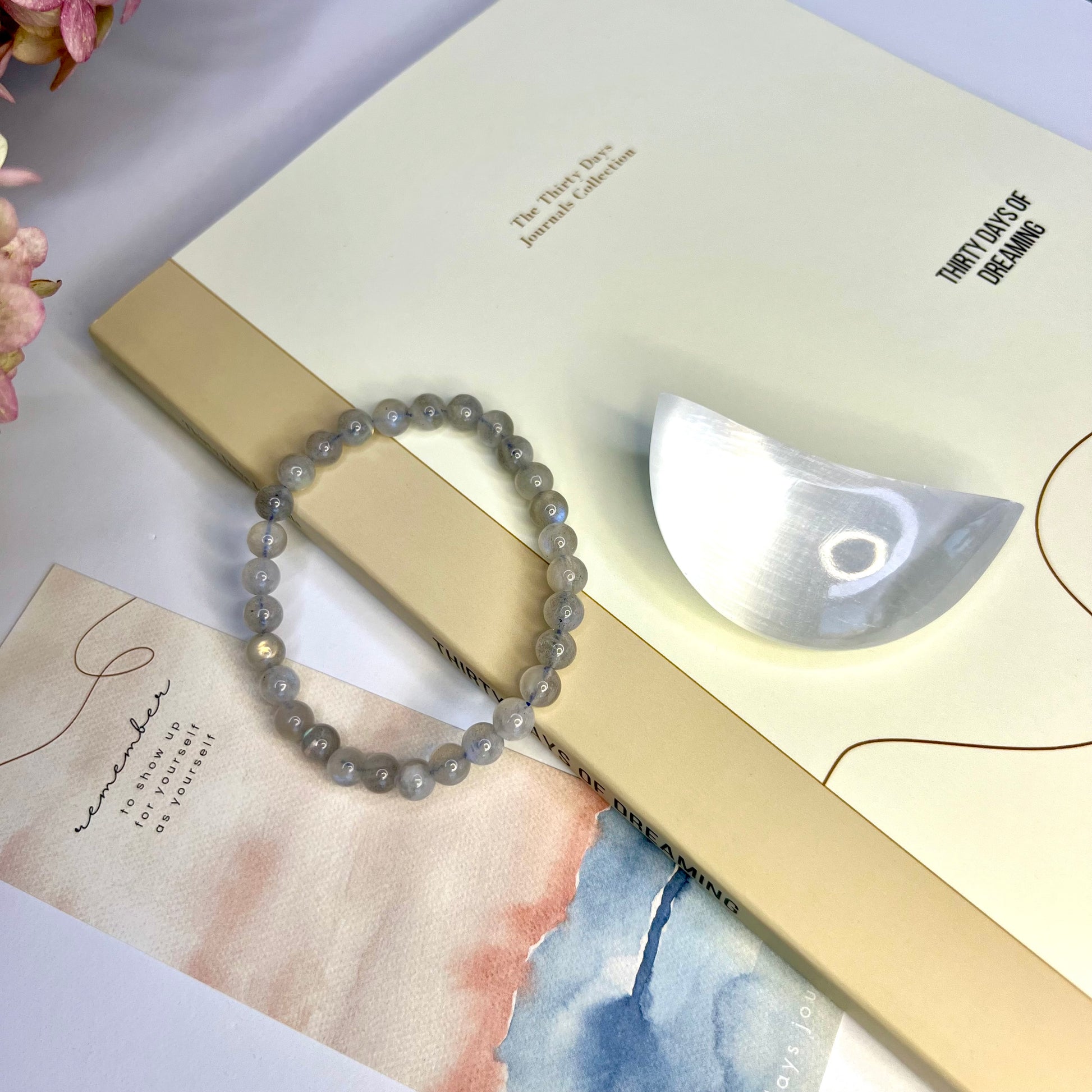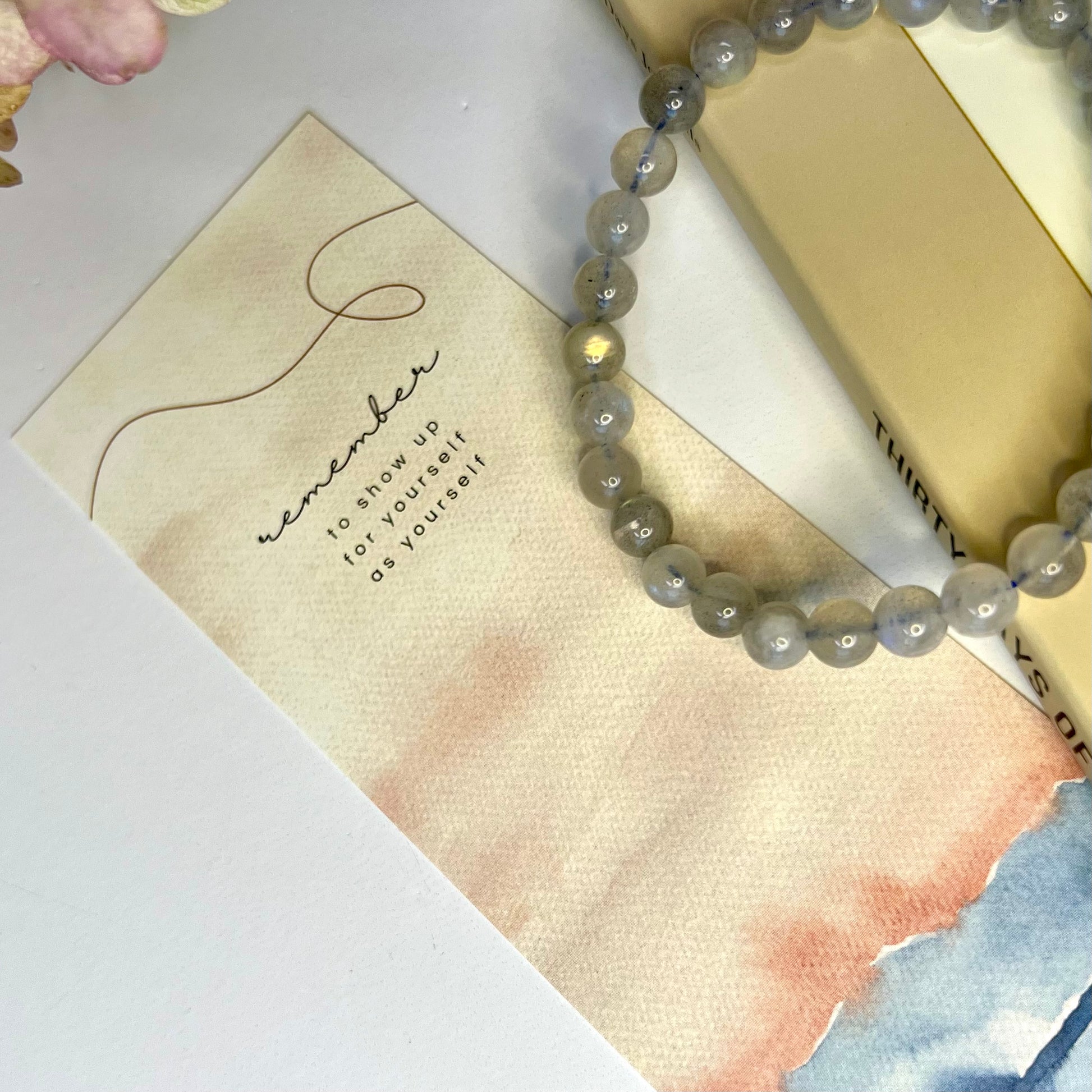 • Labradorite 6mm Bracelet // This stunning bracelet is not just a beautiful accessory; it’s a powerful ally in your journey. Labradorite is known for its ability to enhance intuition and focus, helping you to stay present and grounded while you navigate the creative process.