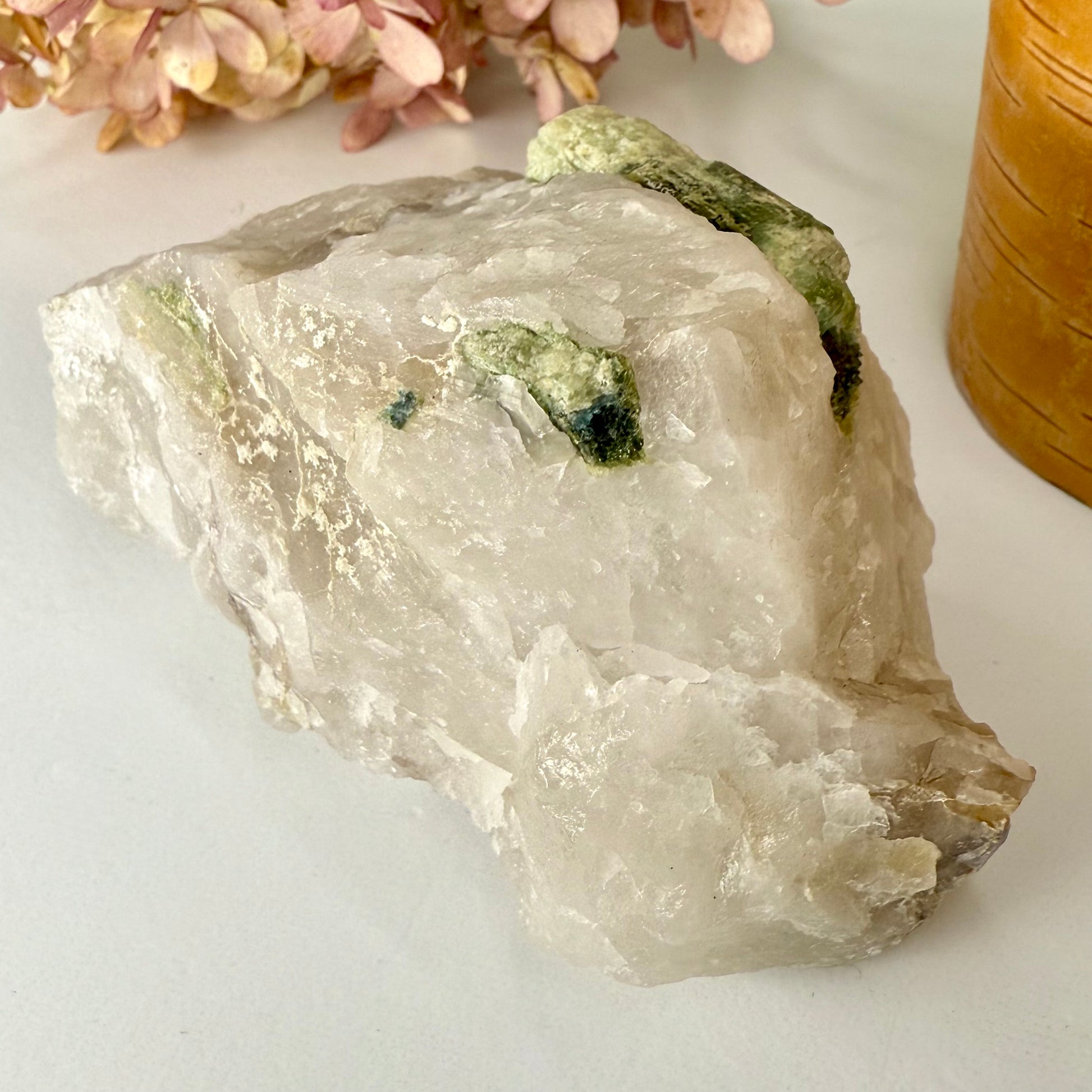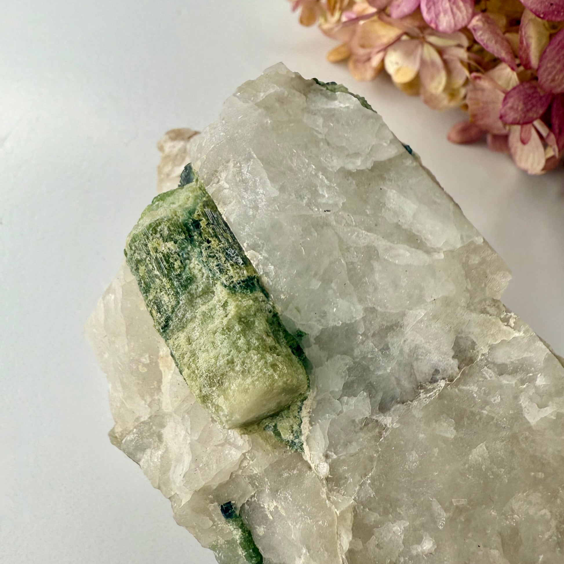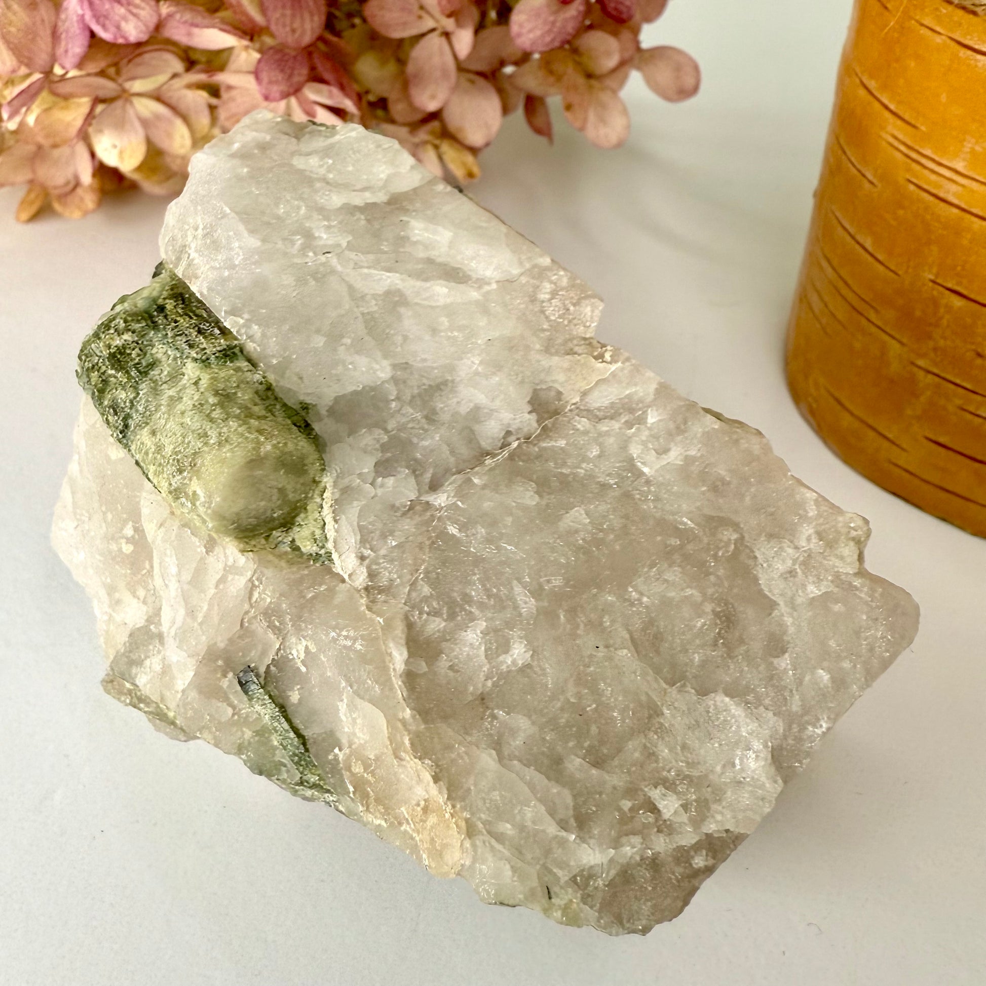 Green Tourmaline in Quartz, also known as Verdelite in Quartz, combines the amplifying clarity of quartz with the stabilizing, heart-centered energy of green tourmaline // Found in Brazil, Afghanistan, and Africa, this pairing often forms in pegmatite environments and is frequently found alongside Lepidolite, Feldspar, and other members of the Tourmaline family // The bright green inclusions within the clear or milky quartz matrix reflect both vitality and clarity.